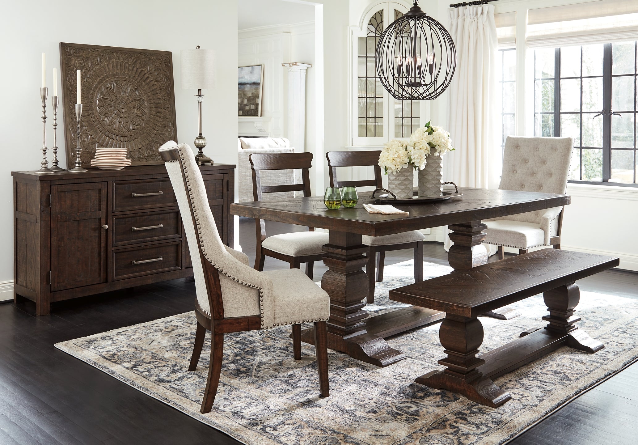 With its sturdy silhouette and lively, dark brown distressed finish, this dining room extension table gives modern farmhouse styling a rich, substantial sensibility. Double pedestal base with stretcher is an inspired choice for a hearty, homey aesthetic. Drop-in leaf makes it easy to accommodate drop-in guests.