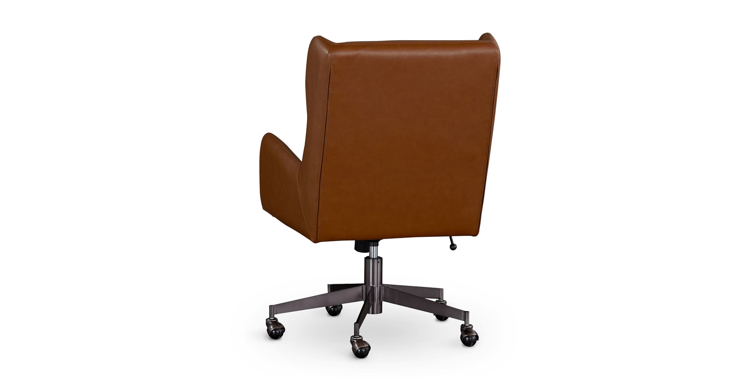 The combination of gently sloping arms and a low-profile wingback detail on our HomeWork Lincoln Office Chair delivers a modern take on classic executive chair styling. The Lincoln offers you a substantial seat at the desk while maintaining a profile that fits your home office workspace. Its classic 5-star base swivels 360°, with adjustable height and tilt for optimal ergonomics. The vegan leather upholstery is available in two options, with a corresponding finish color on the base.