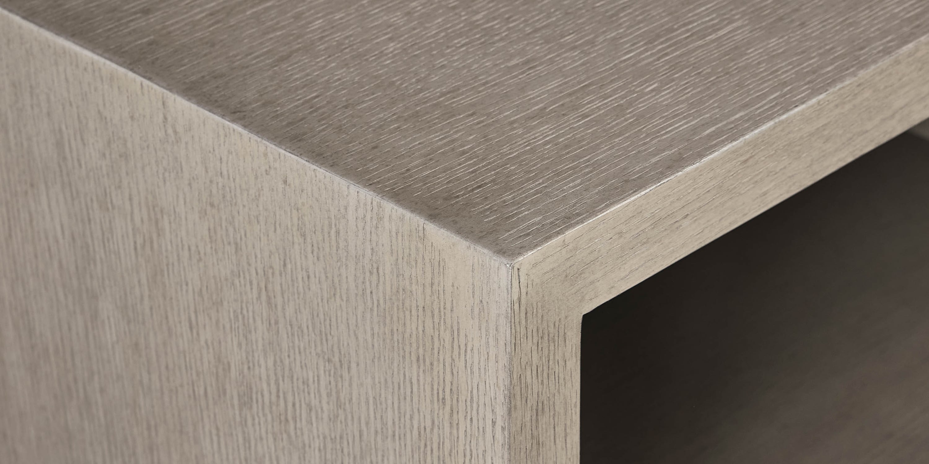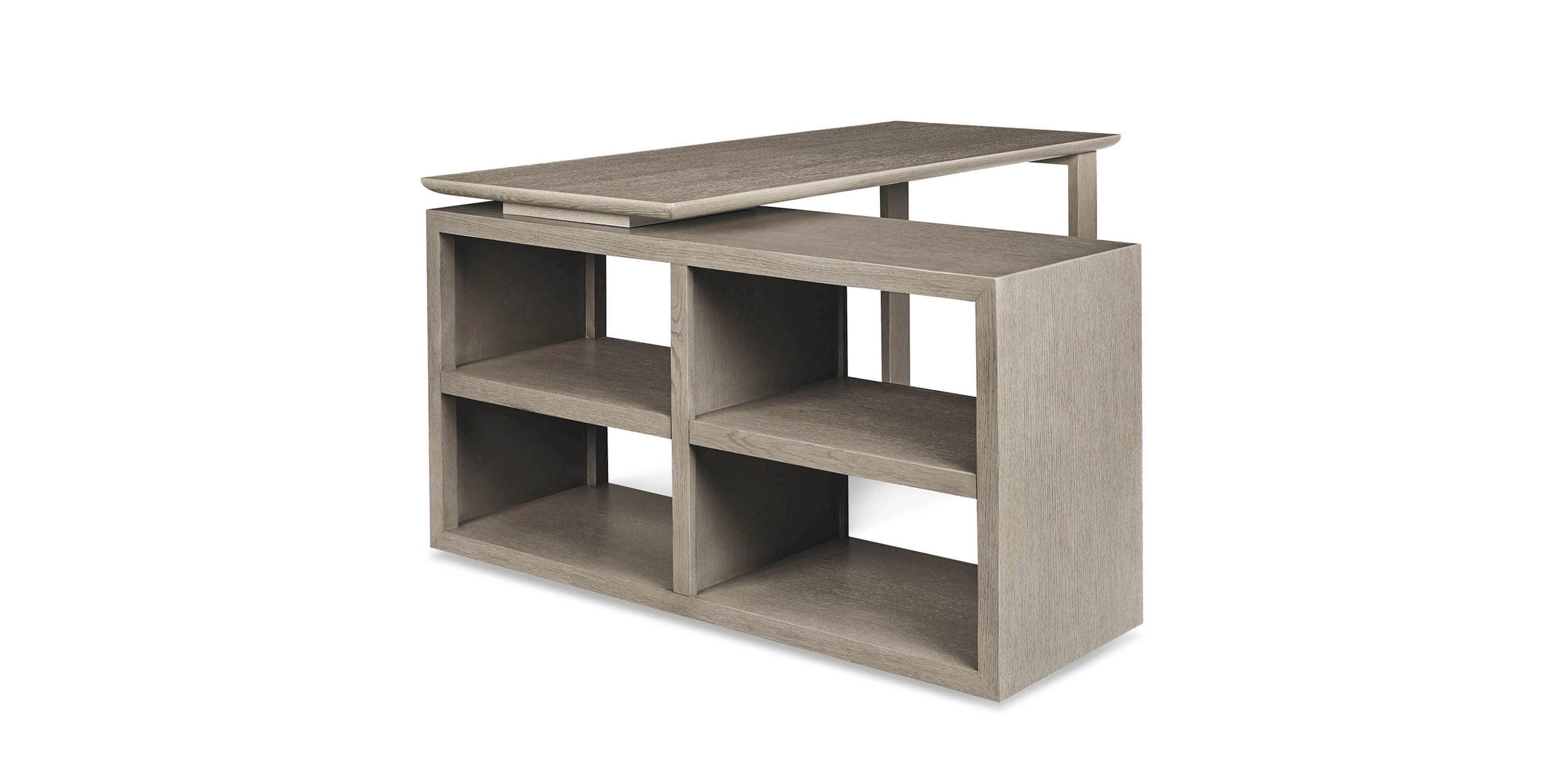 360° adaptability at a mere swivel is the promise made by our HomeWork Modular L-Shaped Desk. The base of the desk features 4 open shelves and is the foundation for a swivel-top writing surface that can form a right or left L-Shape or any angle in between. Perfect for smaller or multi-use spaces, its footprint can easily be consolidated when not in use. The desk is finished on all sides and its smoothly grained, quarter-sawn White Oak veneer is available in the same 3 finishes as all the pieces in the HomeWork Collection. Create your impeccably styled, fully functional home office in one fell (and customized) swoop!