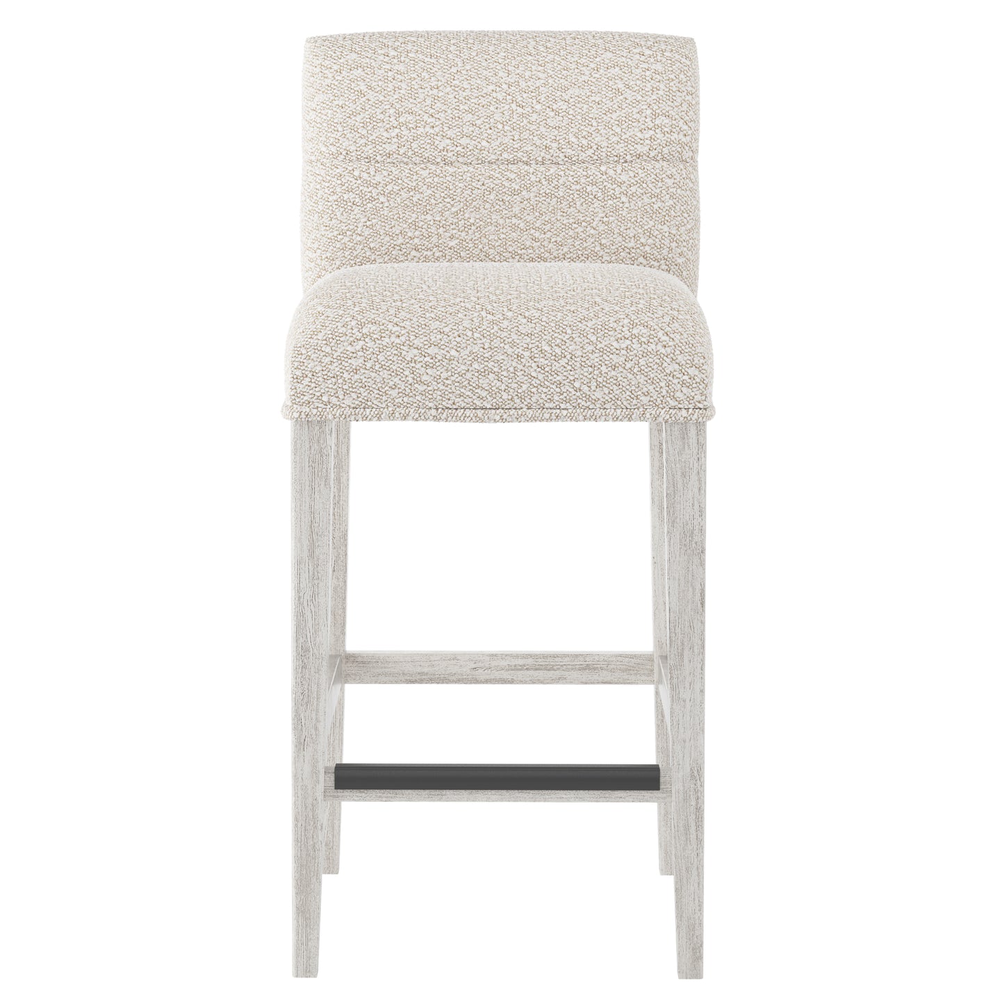 The Hyde bar stool creates a comfort destination with a horizontal channel upholstered back and an upholstered seat. The wood frame is offered in three finishes: Midnight Black, Weathered Greige and Glacier White. A black finish is featured on the metal cap rail on the front stretcher.