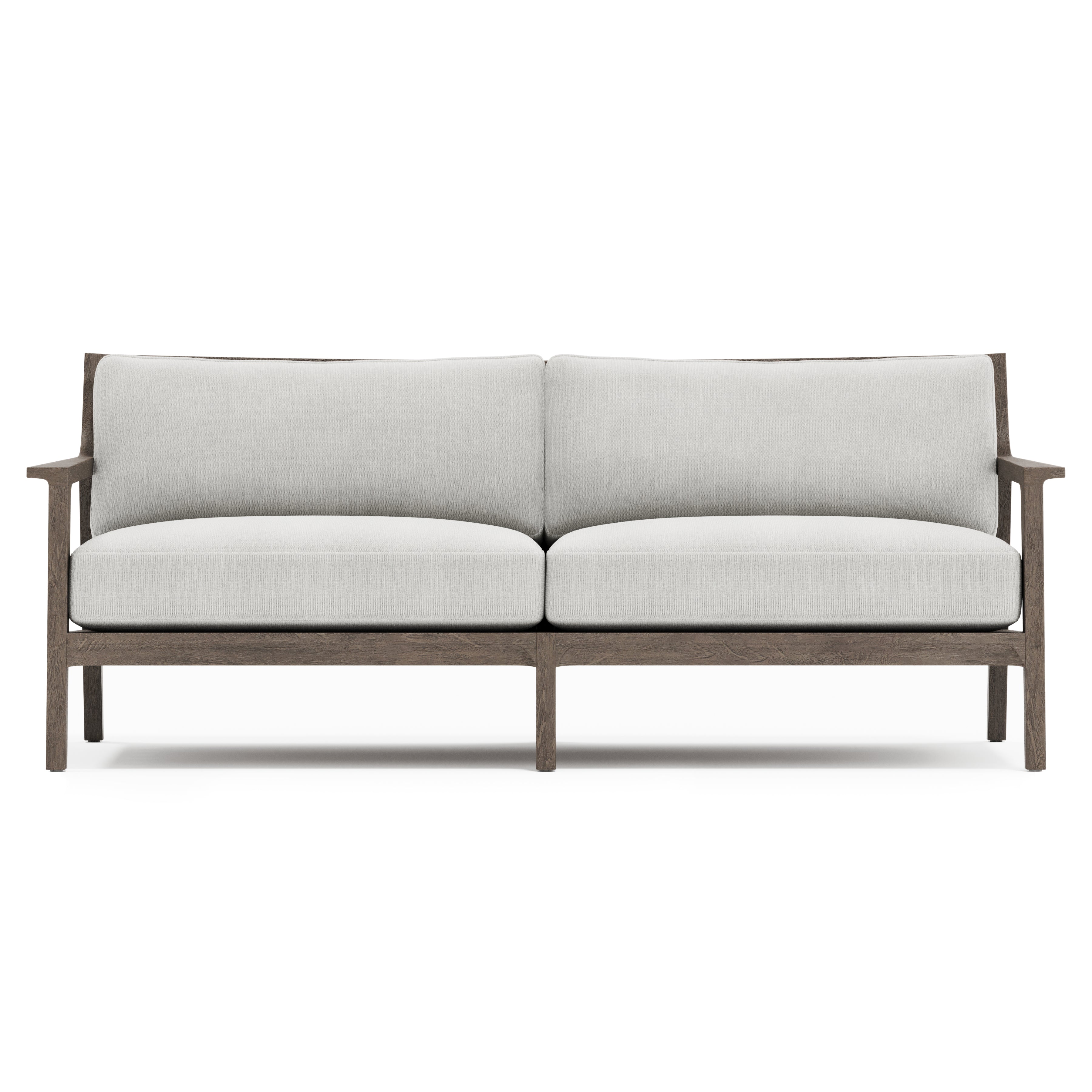 The Ibiza sofa showcases a sleekly modern teak frame that's complemented with deeply comfortable cushions. Two unique panels on the back offer visual interest created with twisted abaca all-weather wicker. It's an elevated sofa design that offers a fresh take on outdoor seating.