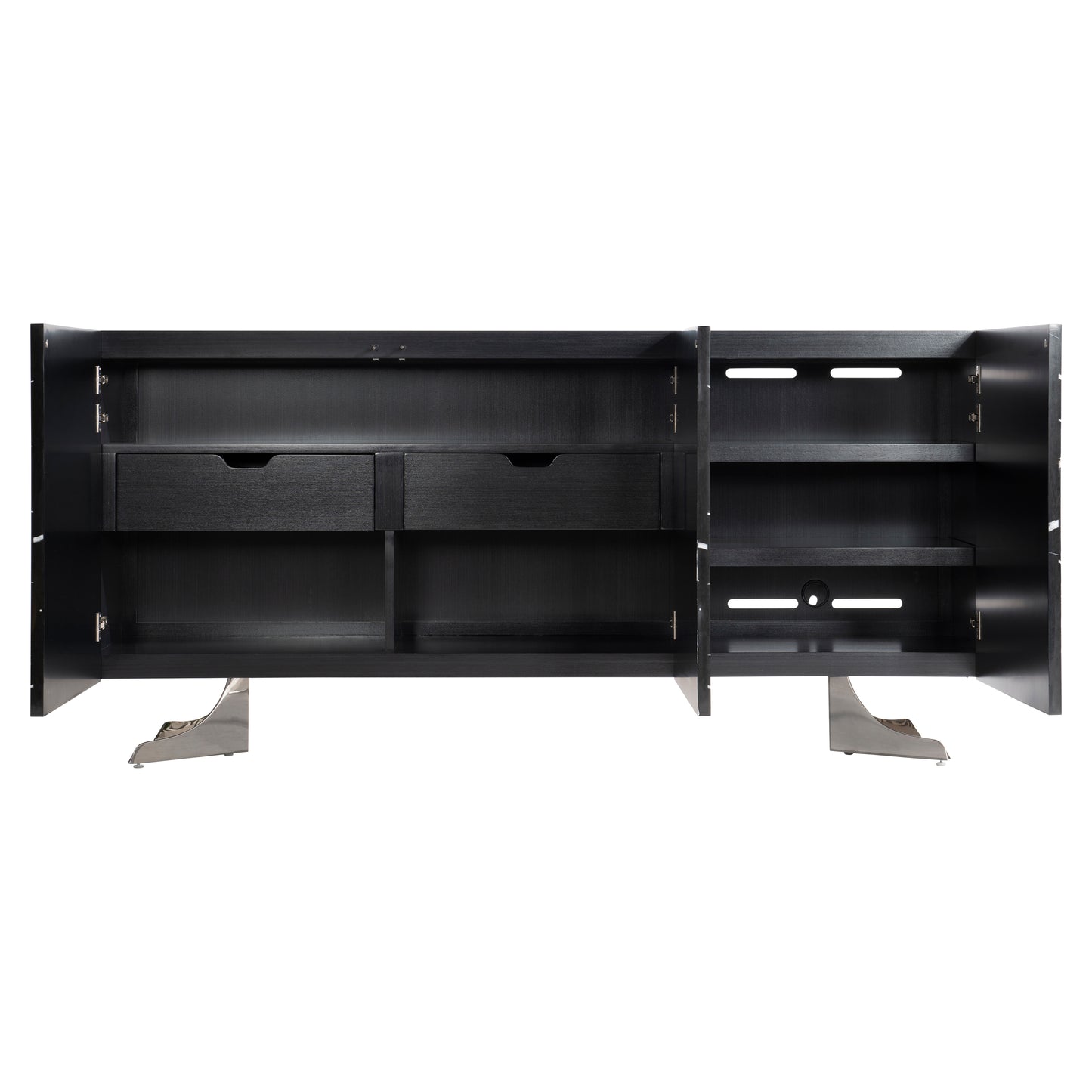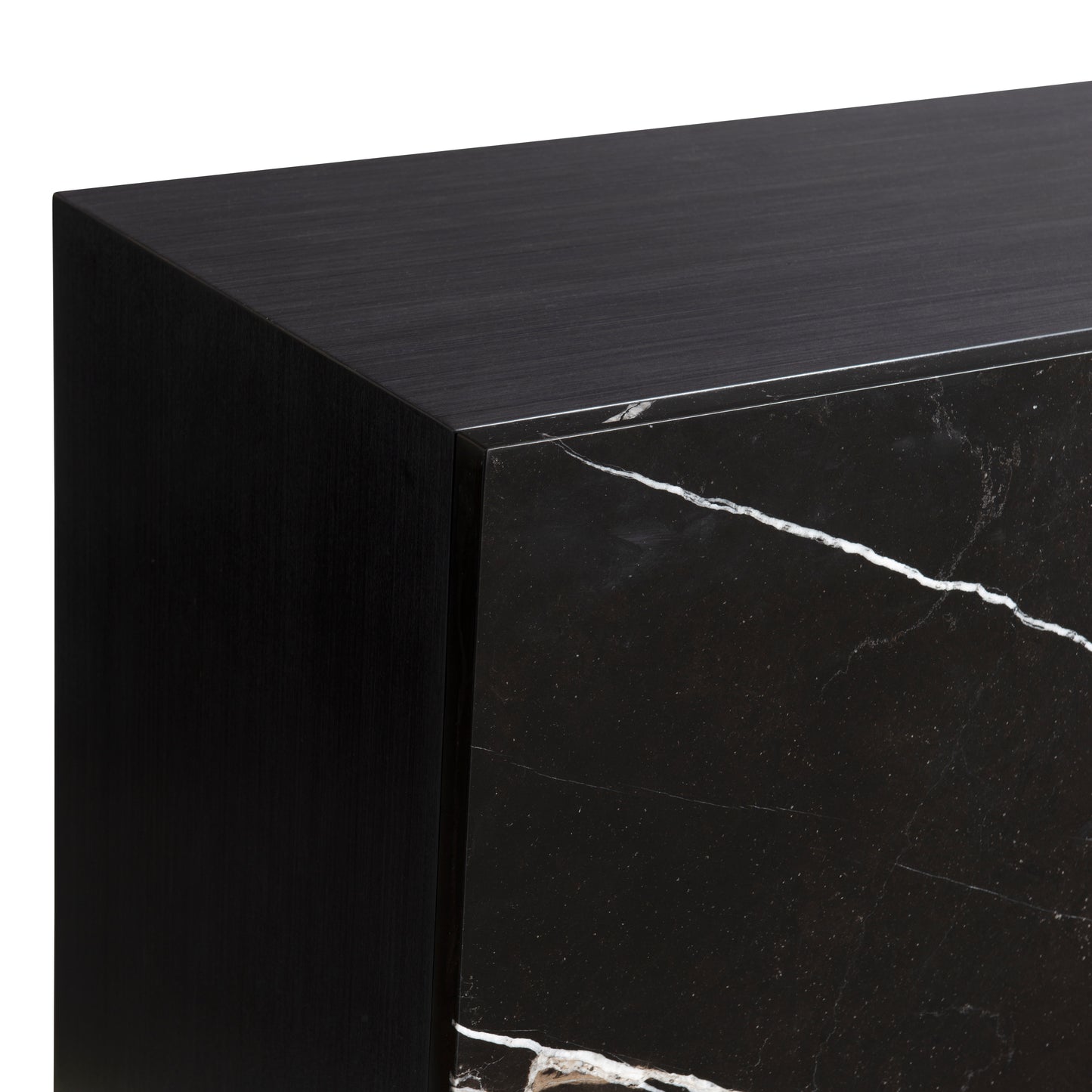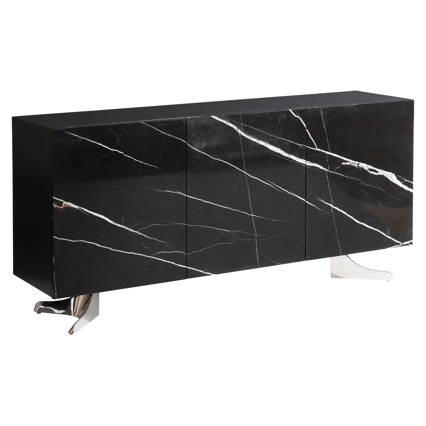 The Imani buffet showcases a dramatic style with Nero Marquina laminated stone overlays on three push-to-open doors. Balanced on stunning polished and angled stainless steel feet, the doors open to reveal an interior in Onyx finish. Functional details include shelves and drawers, a silverware insert, vents and a covered grommet hole in the back panel.