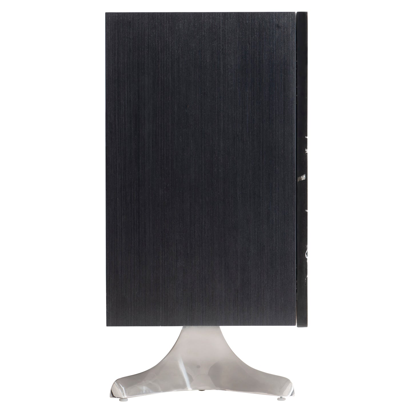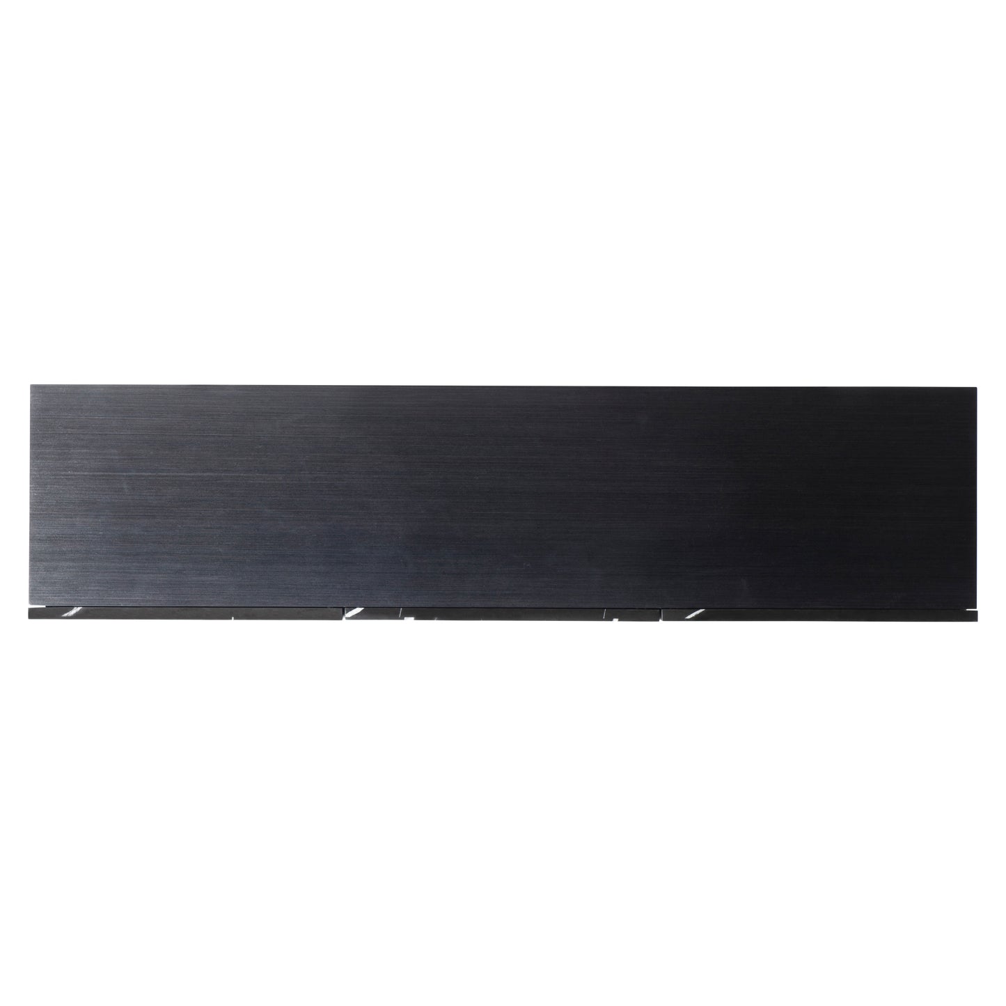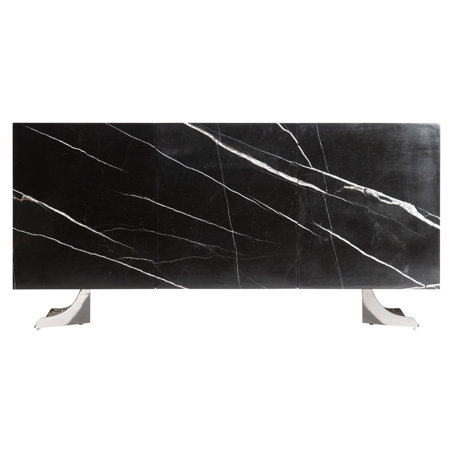 The Imani buffet showcases a dramatic style with Nero Marquina laminated stone overlays on three push-to-open doors. Balanced on stunning polished and angled stainless steel feet, the doors open to reveal an interior in Onyx finish. Functional details include shelves and drawers, a silverware insert, vents and a covered grommet hole in the back panel.