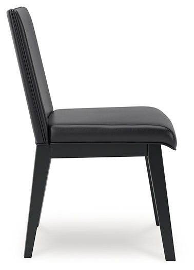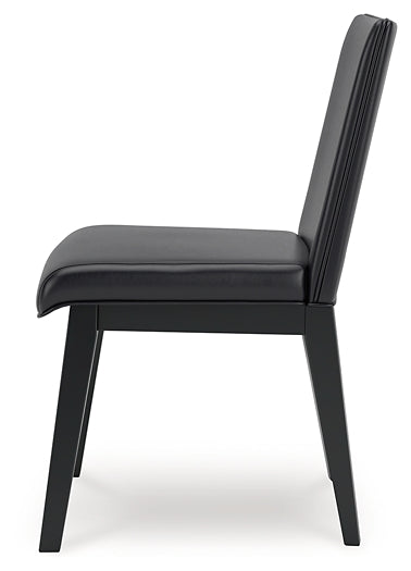 This set of 2 dining chairs exudes modern sophistication. Finished in a sleek black wood-tone with black faux leather upholstery for added comfort and style, it brings a beautifully balanced look to the table. A simply striking feast for the eyes—now your only worry is who to invite for dinner.
