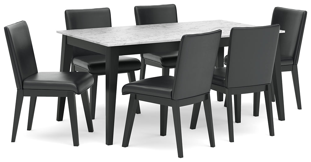This dining package exudes modern sophistication. The rectangular table, finished in a sleek black wood tone, is adorned with a stunning white faux marble tabletop. Side chairs with faux leather upholstery offer added comfort and style. It's a simply striking feast for the eyes—now your only worry is what to serve for dinner.