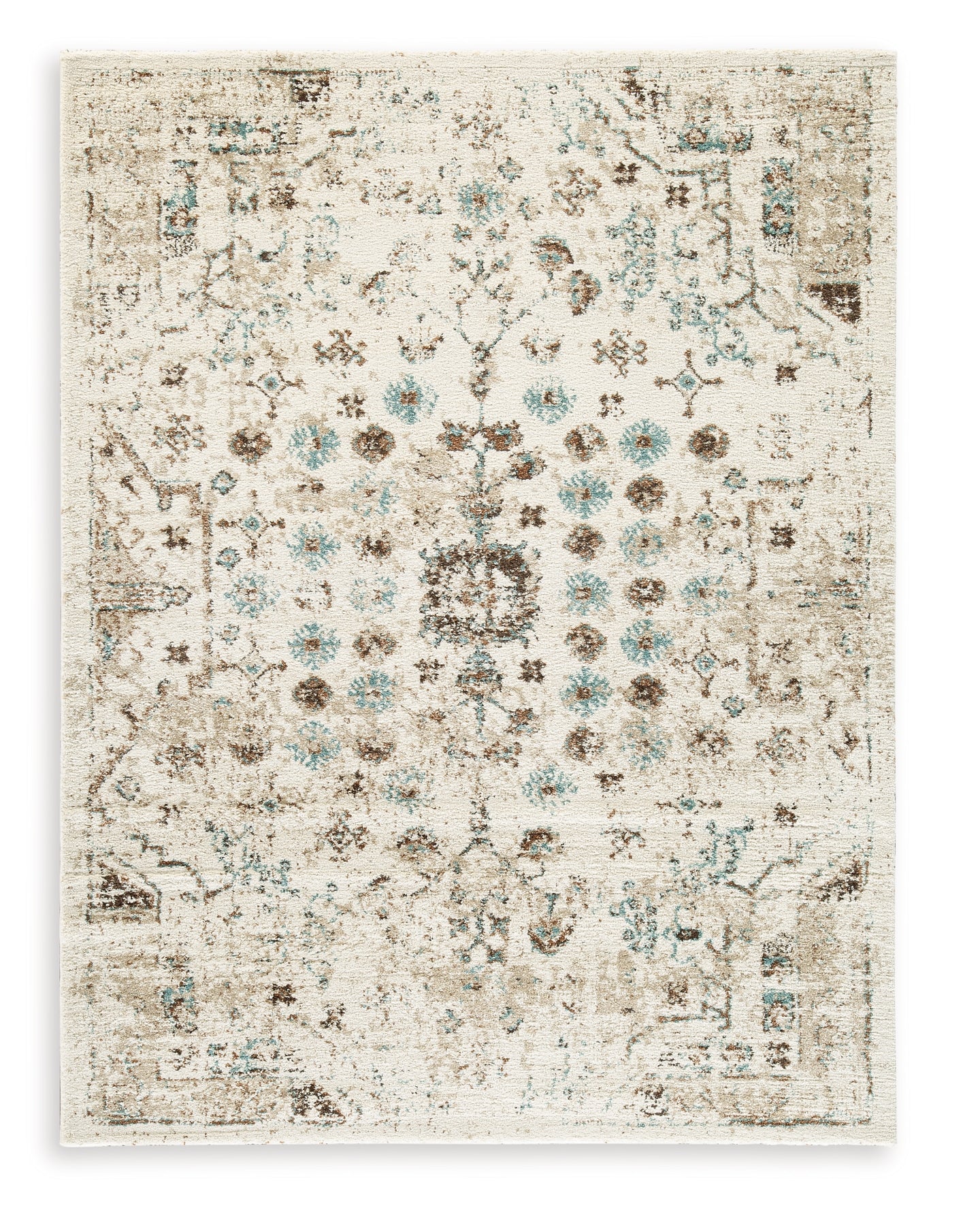 An on-trend take on traditional stylings, this rug brings a pop of pattern underfoot. Simply soothing shades of ivory, brown and teal complement so many settings and color schemes. It’s an inviting addition to your home accents.