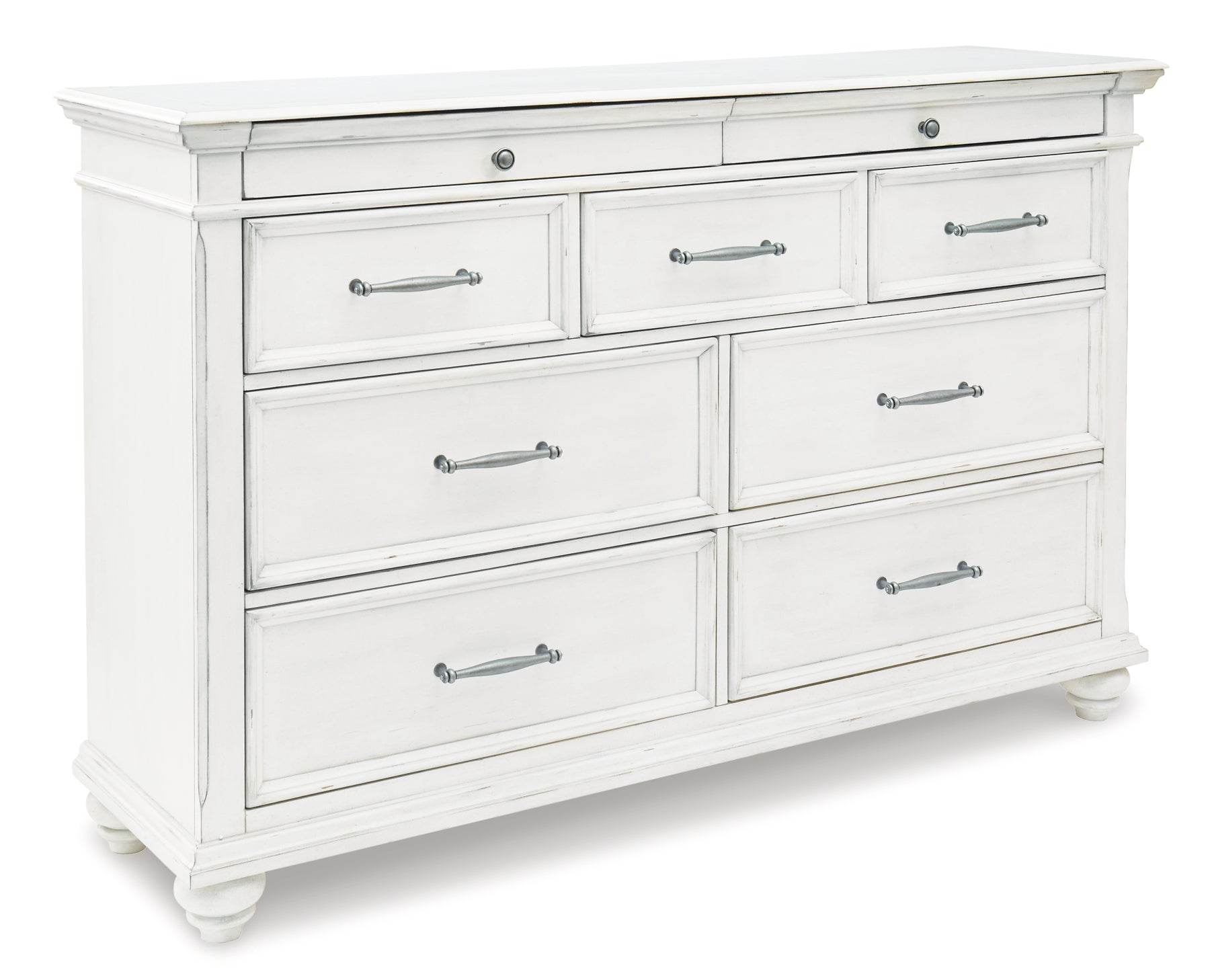 Give your retreat vintage charm with this bedroom set in a beautifully distressed whitewash finish. You'll love the headboard's grand style featuring a picture framed panel. The bench footboard is equally elegant offering extra storage and a convenient seat. Generously scaled moulding, framed drawer fronts and bun feet enhance the character of this bedroom set—evoking the feel of a quaint cottage escape.