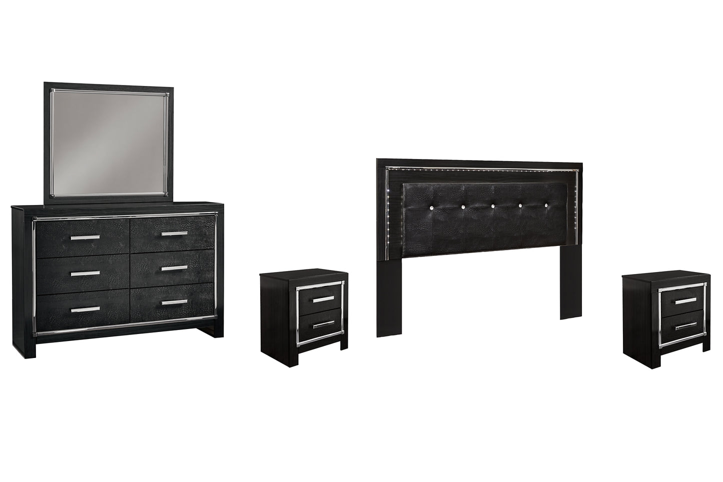 Rest easy. The luxurious look you’ve been dreaming of is yours for the taking—at a price sure to put you at ease. This bedroom set brings a sense of old Hollywood with a contemporary flair. A deep, dark finish, faceted chrome-tone accents and LED lighting exude Hollywood-chic style to the max. Faux alligator drawer panels infuse a sumptuous look that’s upscale and indulgent, and utterly on trend. Sure to entice those with refined tastes, this set is a contemporary masterpiece.