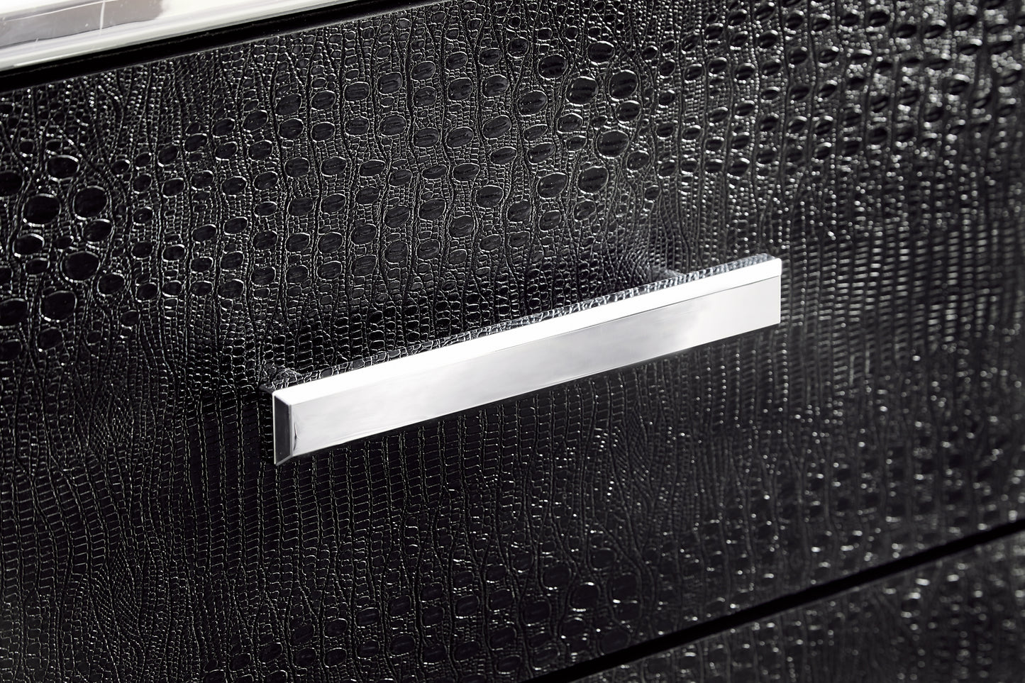Rest easy. The luxurious look you’ve been dreaming of is yours for the taking—at a price sure to put you at ease. This bedroom package brings a sense of old Hollywood with a contemporary flair. The set’s deep, dark finish and faceted chrome-tone accents exude Hollywood-chic style to the max. The bed’s padded windowpane stitching on the sleek, black upholstery, in addition to LED lighting, infuses a sumptuous look that’s upscale and indulgent. A wireless remote allows you to control the color and brightness to suit the mood, while USB and wireless charging options on the nightstand offer added functionality. The storage piece’s faux alligator panels and smooth-gliding drawers are sure to entice those with refined taste, making this set a contemporary masterpiece.