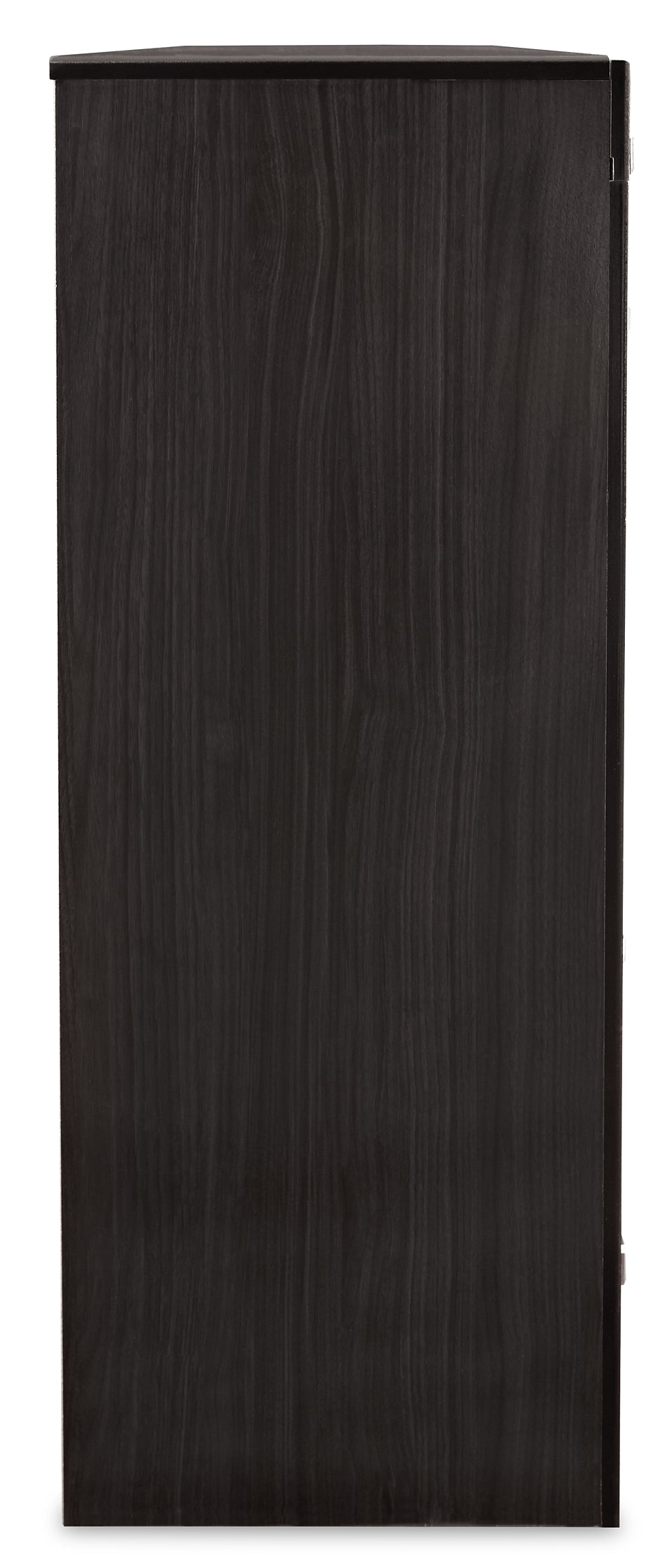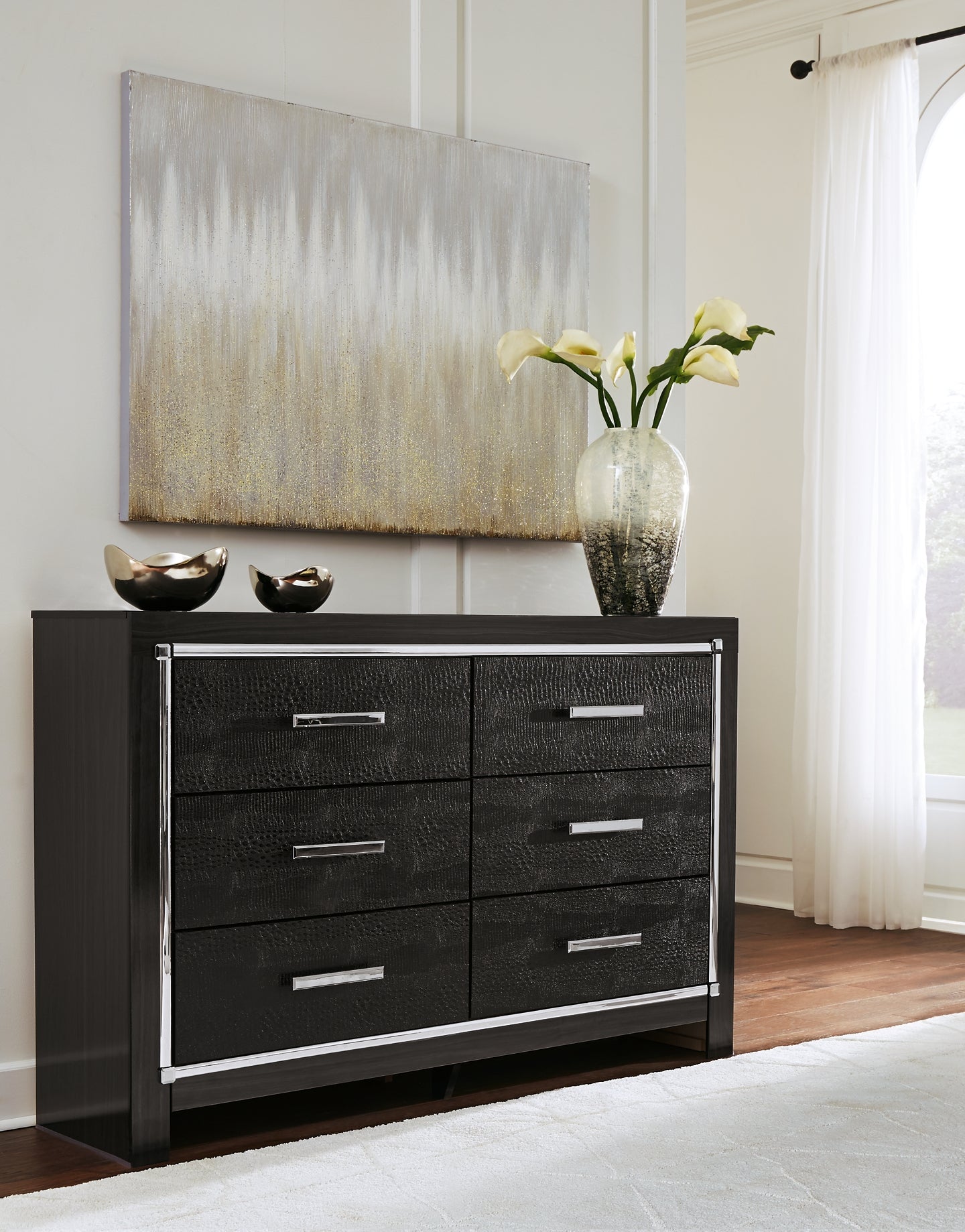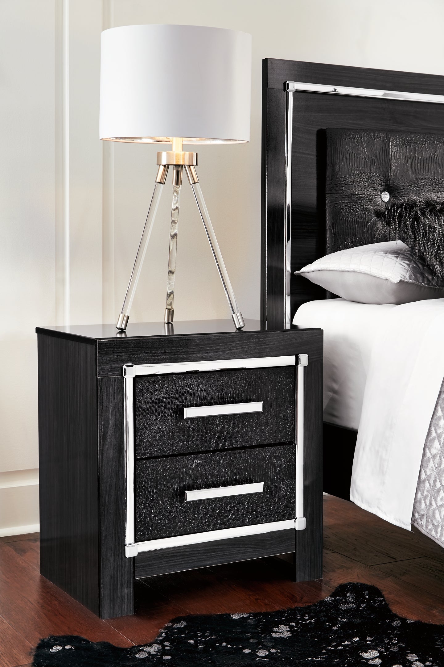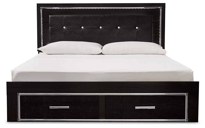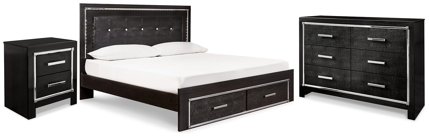 Rest easy. The luxurious look you’ve been dreaming of is yours for the taking—at a price sure to put you at ease. This striking storage bed brings a sense of old Hollywood with a contemporary flair. A deep, dark finish, faceted chrome-tone accents and LED lighting exude Hollywood-chic style to the max. Padded windowpane-stitching on the sleek, black upholstery infuses a sumptuous look that’s upscale and indulgent, and utterly on trend. A wireless remote allows you to control the color and brightness to suit the mood. Dresser and nightstand included.