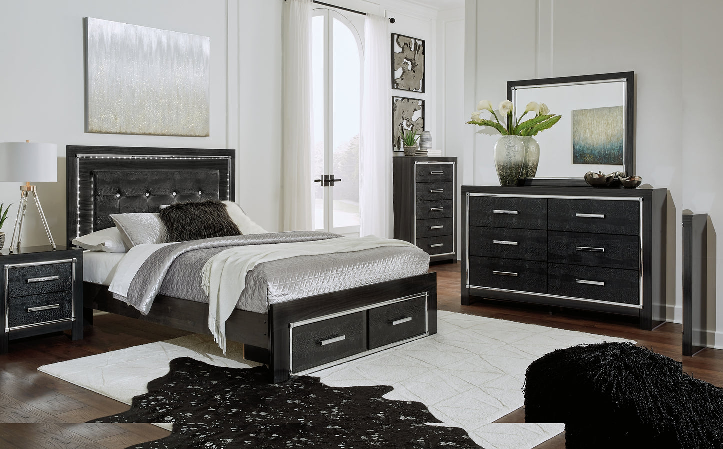 Rest easy. The luxurious look you’ve been dreaming of is yours for the taking—at a price sure to put you at ease. This bedroom package brings a sense of old Hollywood with a contemporary flair. The set’s deep, dark finish and faceted chrome-tone accents exude Hollywood-chic style to the max. The bed’s padded windowpane stitching on the sleek, black upholstery, in addition to LED lighting, infuses a sumptuous look that’s upscale and indulgent. A wireless remote allows you to control the color and brightness to suit the mood, while USB and wireless charging options on the nightstand offer added functionality. The storage pieces’ faux alligator panels and smooth-gliding drawers are sure to entice those with refined taste, making this set a contemporary masterpiece.