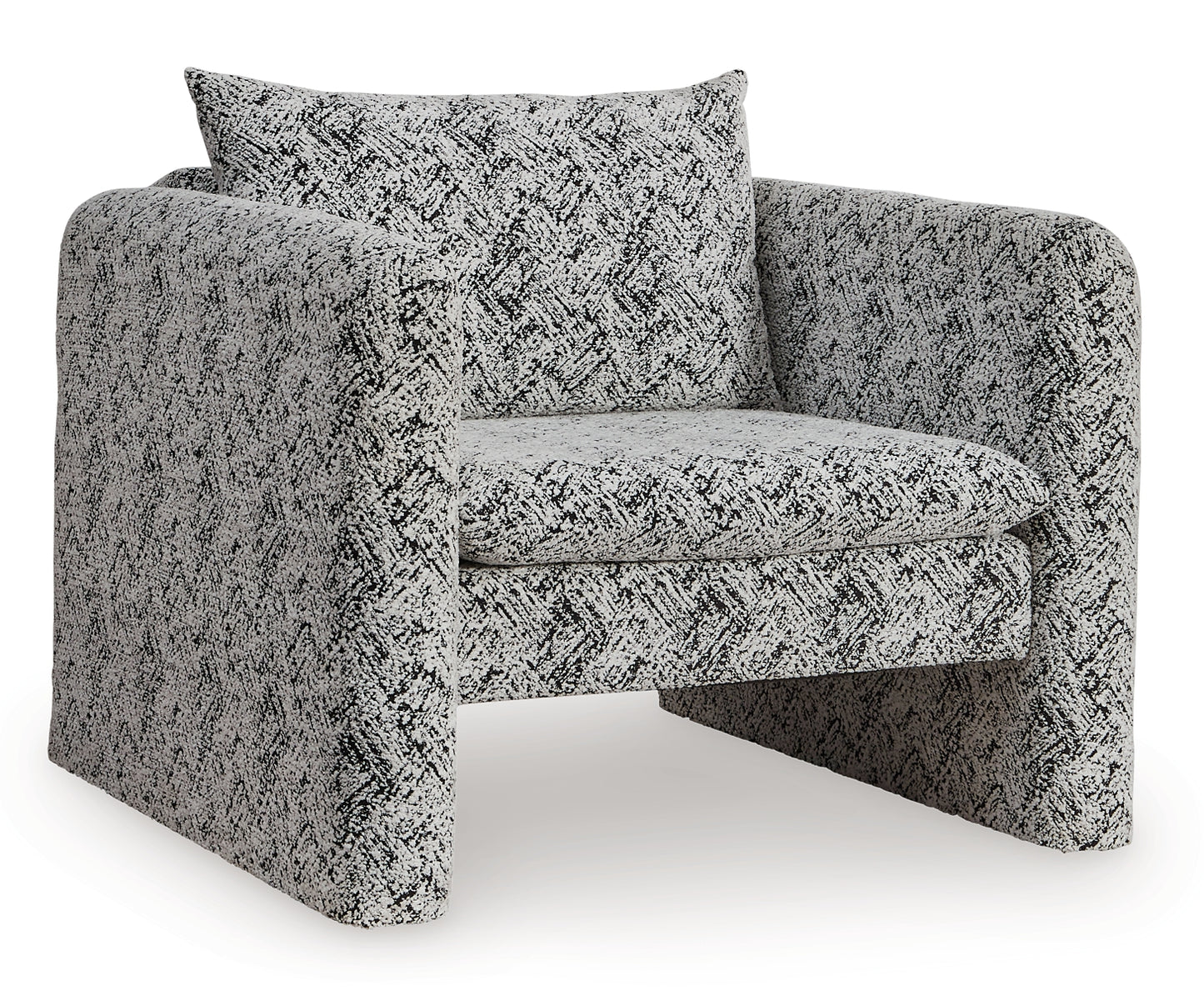This fashion-forward accent chair keeps comfort and contemporary style at top of mind. Its eye-catching black and white geometric pattern makes a bold statement while remaining versatile enough to pair with other neutrals or pops of color. A low-profile back and streamlined silhouette lend a sophisticated, trend-right vibe to your space.