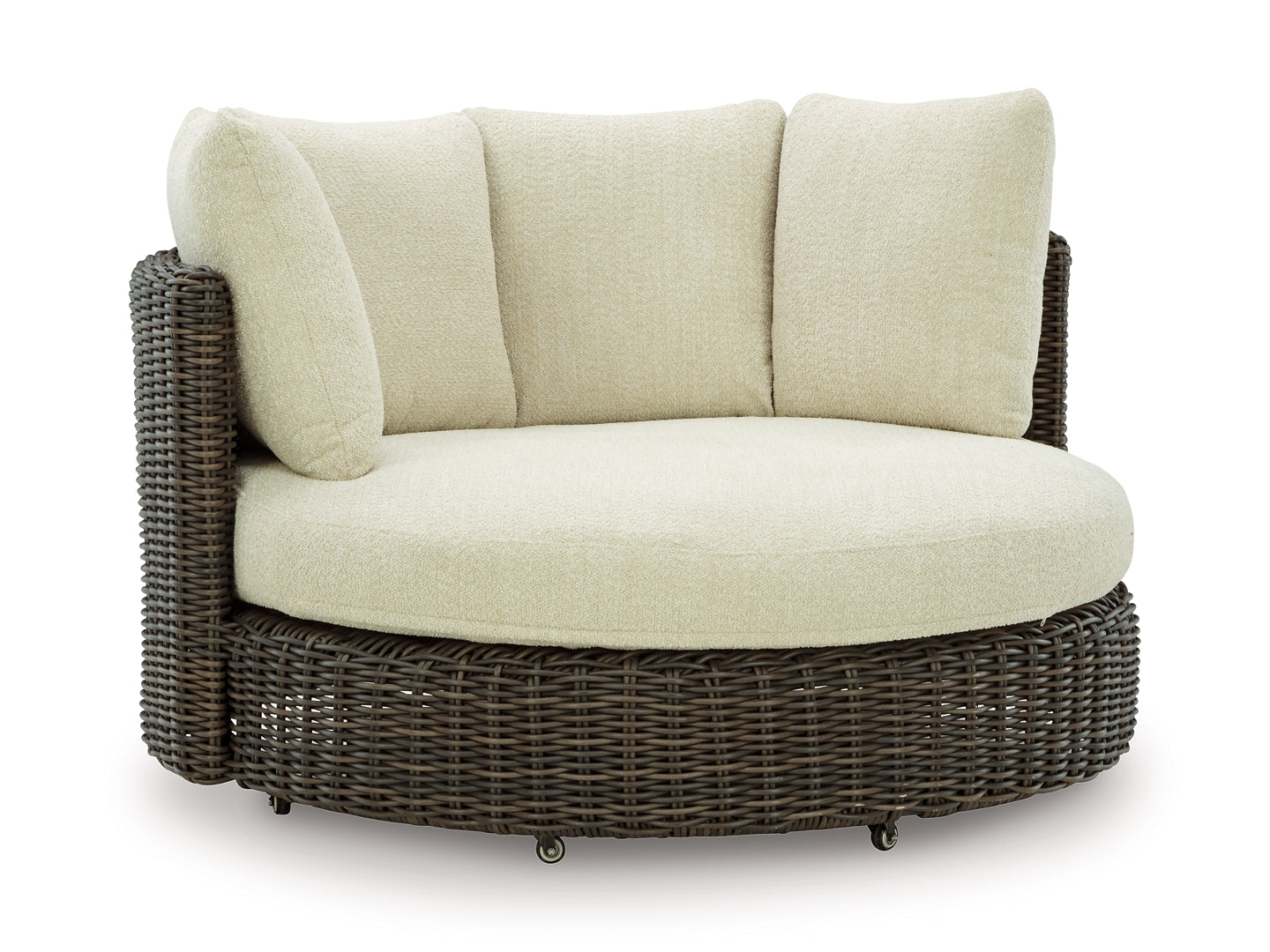Add luxury, comfort and durability to alfresco fun. This outdoor swivel lounge chair captures the textural beauty of wicker while withstanding the elements, from rain to shine. With a UV-resistant design, the wonderfully low-maintenance Nuvella+™ fabric maintains its good looks over time. Deep, roomy seating completes the piece, offering ample space to sprawl out.