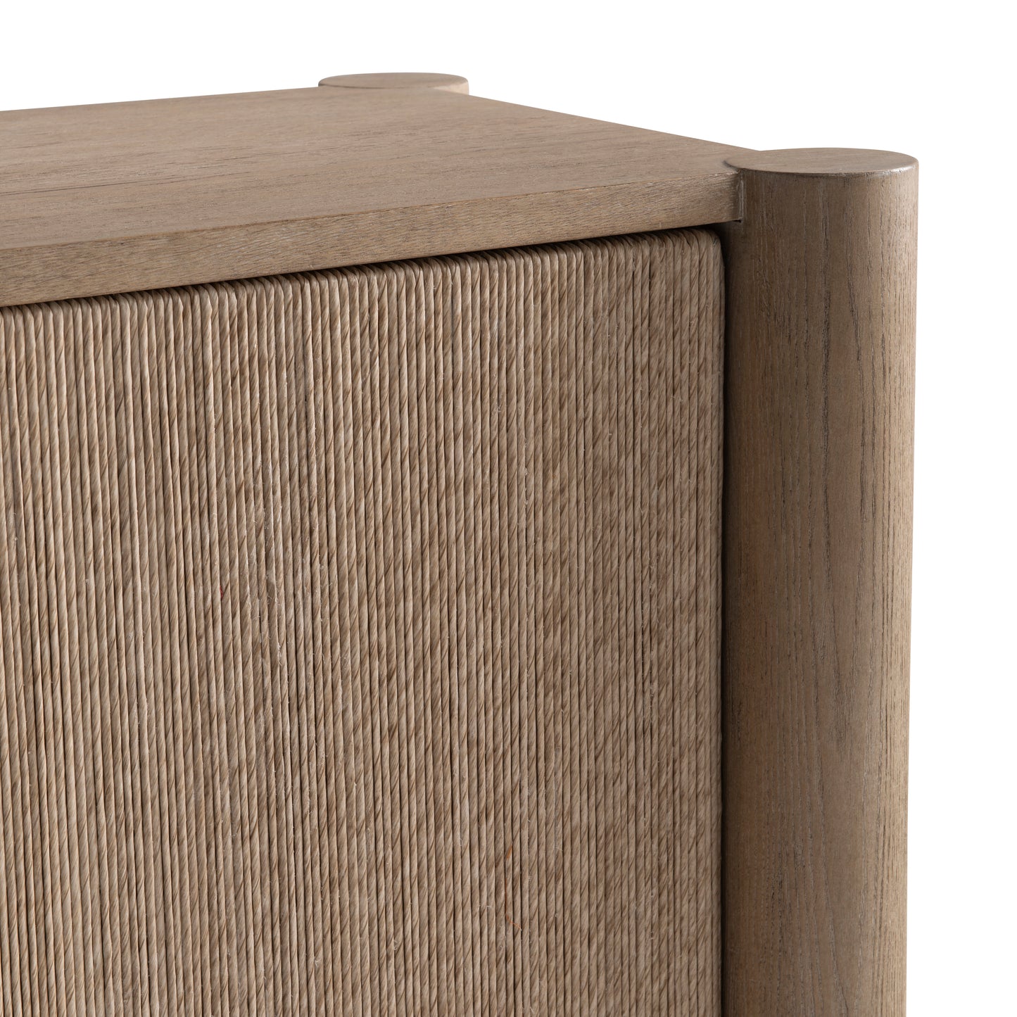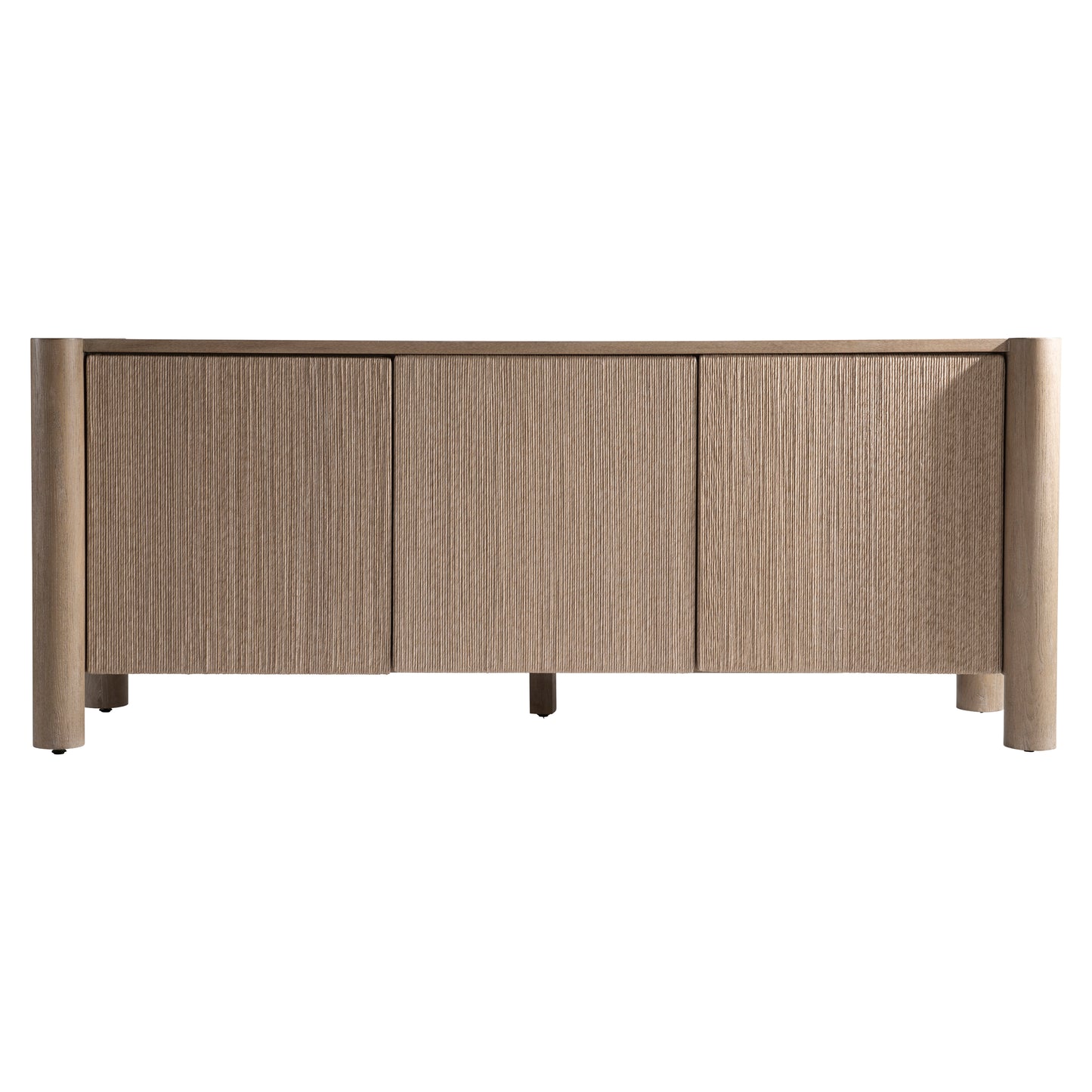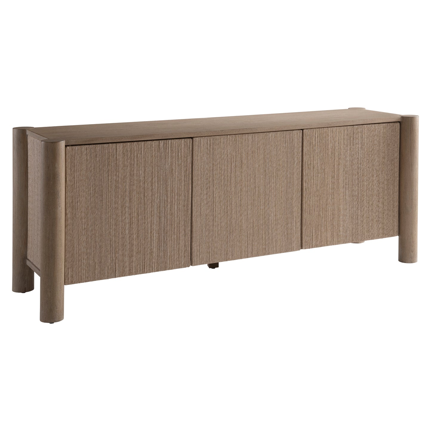 Four cylindrical legs support and notch into the case of the Kiona buffet. The door fronts and end panels are wrapped in twisted rope for a textural organic design. Behind the left and center doors are a fixed shelf with two center drawers. The right door opens to reveal two adjustable/removable shelves.