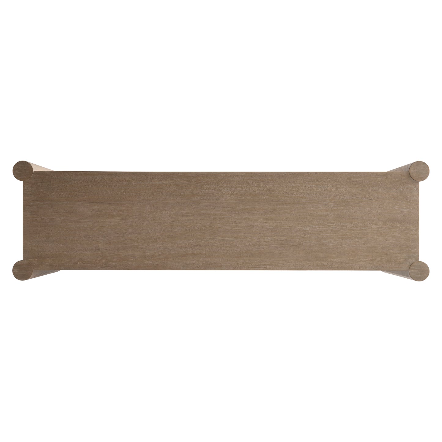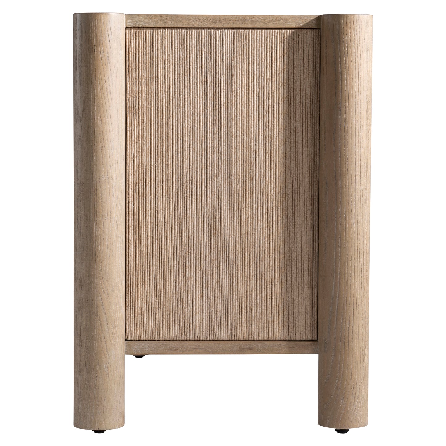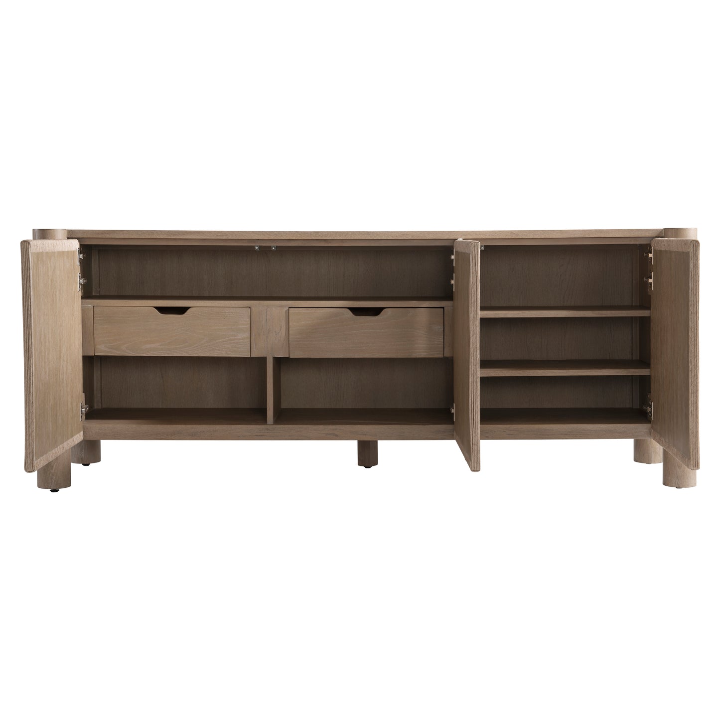Four cylindrical legs support and notch into the case of the Kiona buffet. The door fronts and end panels are wrapped in twisted rope for a textural organic design. Behind the left and center doors are a fixed shelf with two center drawers. The right door opens to reveal two adjustable/removable shelves.