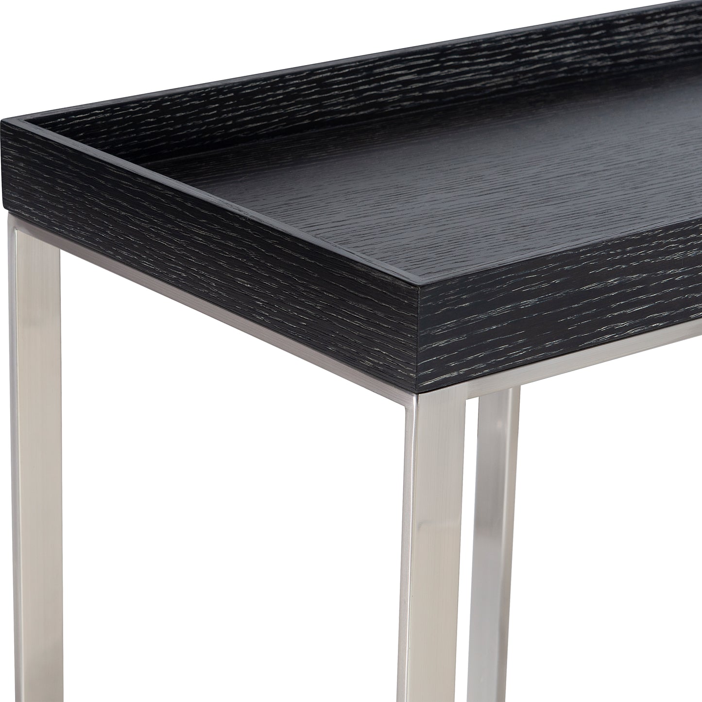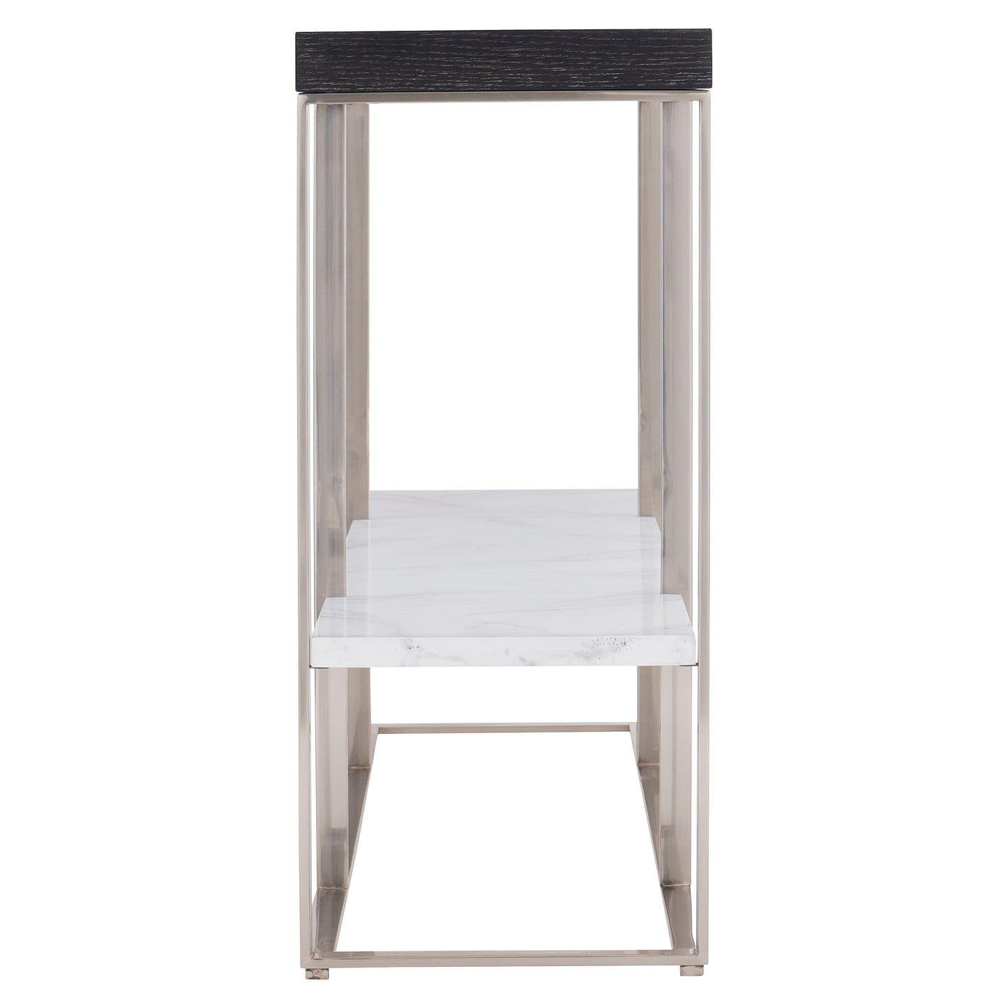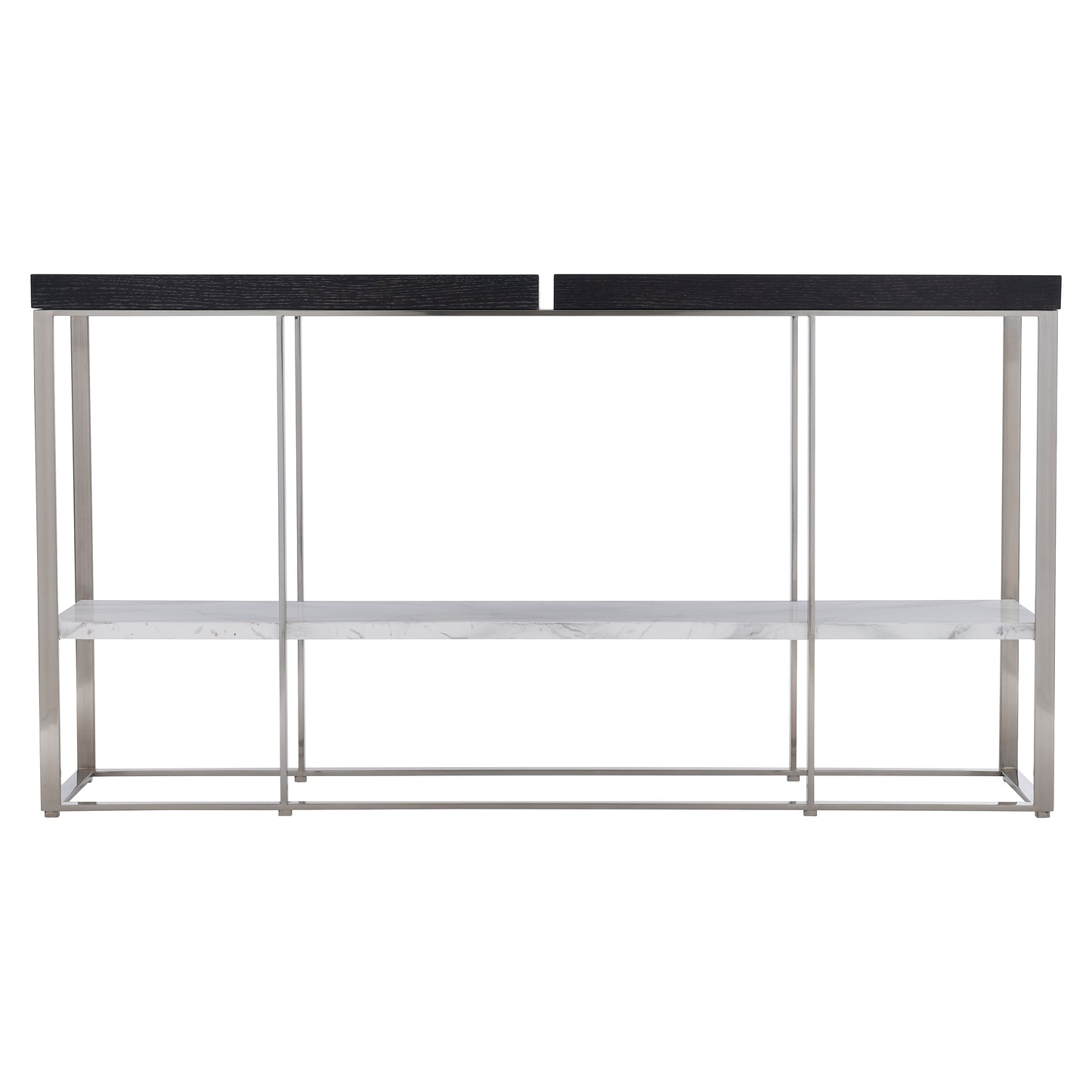 The Lafayette console table pairs touches of glamour with a modern sense of style. The clean, linear design features a top composed of two wood trays with a small gap in between. A hand-painted faux marble shelf contrasts with the dark cerused mink finish on quartered white oak veneers. The simple and sleek stainless steel frame adds pop.