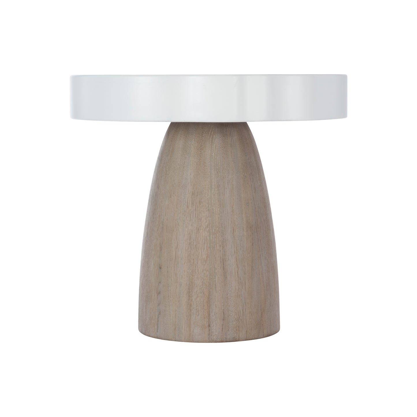 The Laramie side table combines natural appeal with modern flair. A lacquered white top with an organic shape sits atop a conical pedestal with an oak grain Rye finish. This unique piece brings contrast and gently curving lines to an interior.