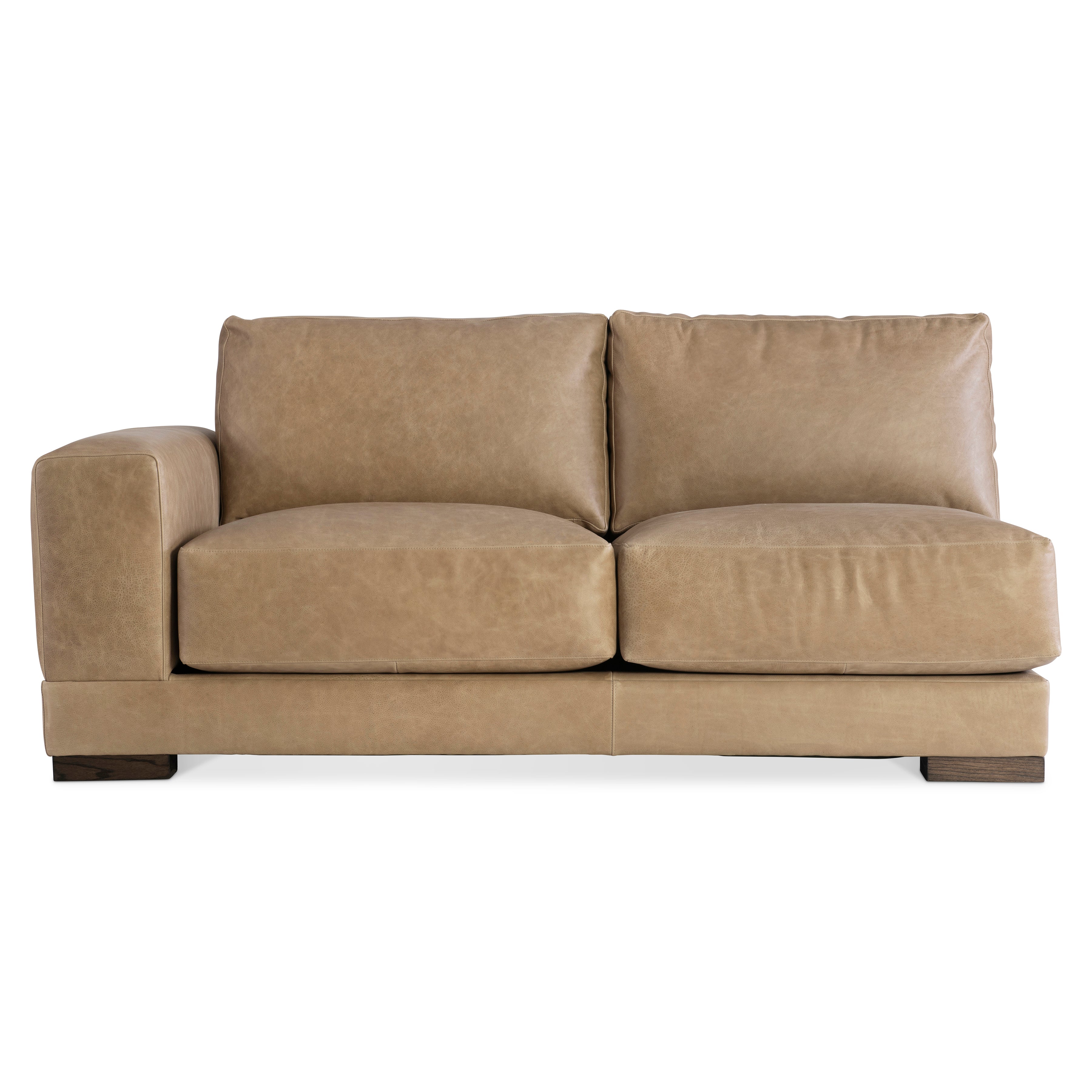 Straight lines are softened with gentle curves on the Lars left arm loveseat, complementing the wide track arm and bold silhouette. Plushly deep seat cushions and box-edge weltless bordered back pillows craft a comfort destination. Four wide block feet take a stance in textured wood. This loveseat is part of the Lars sectional.