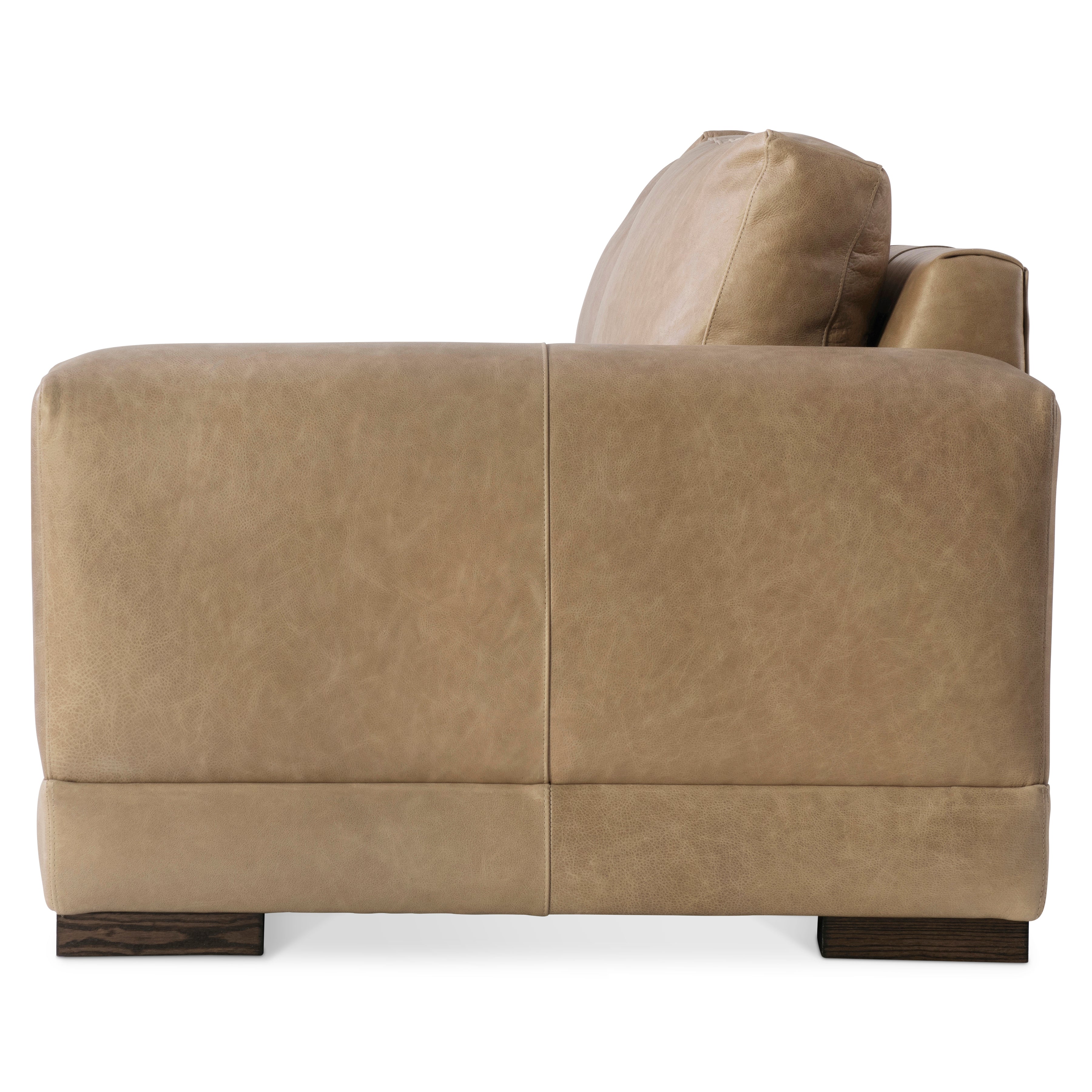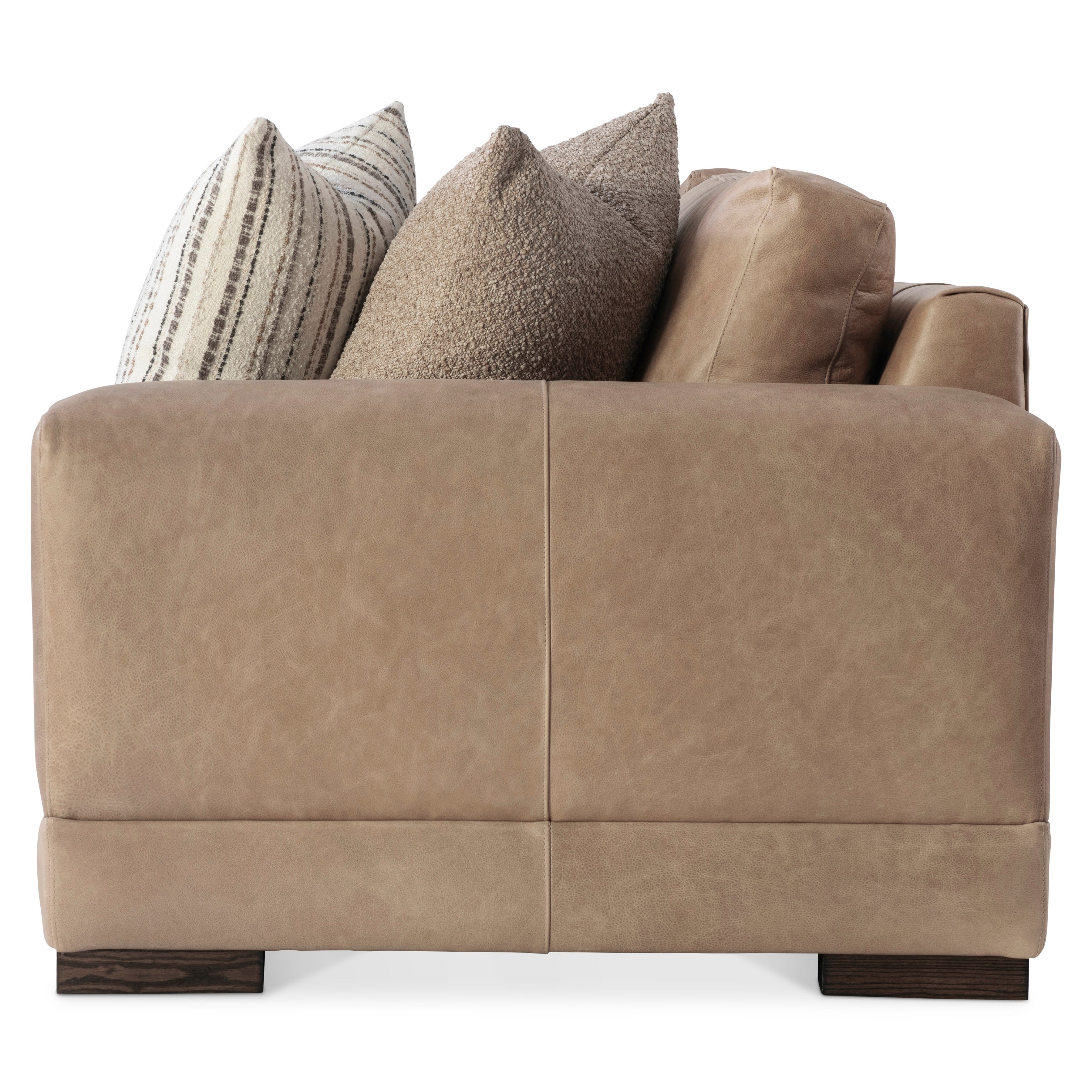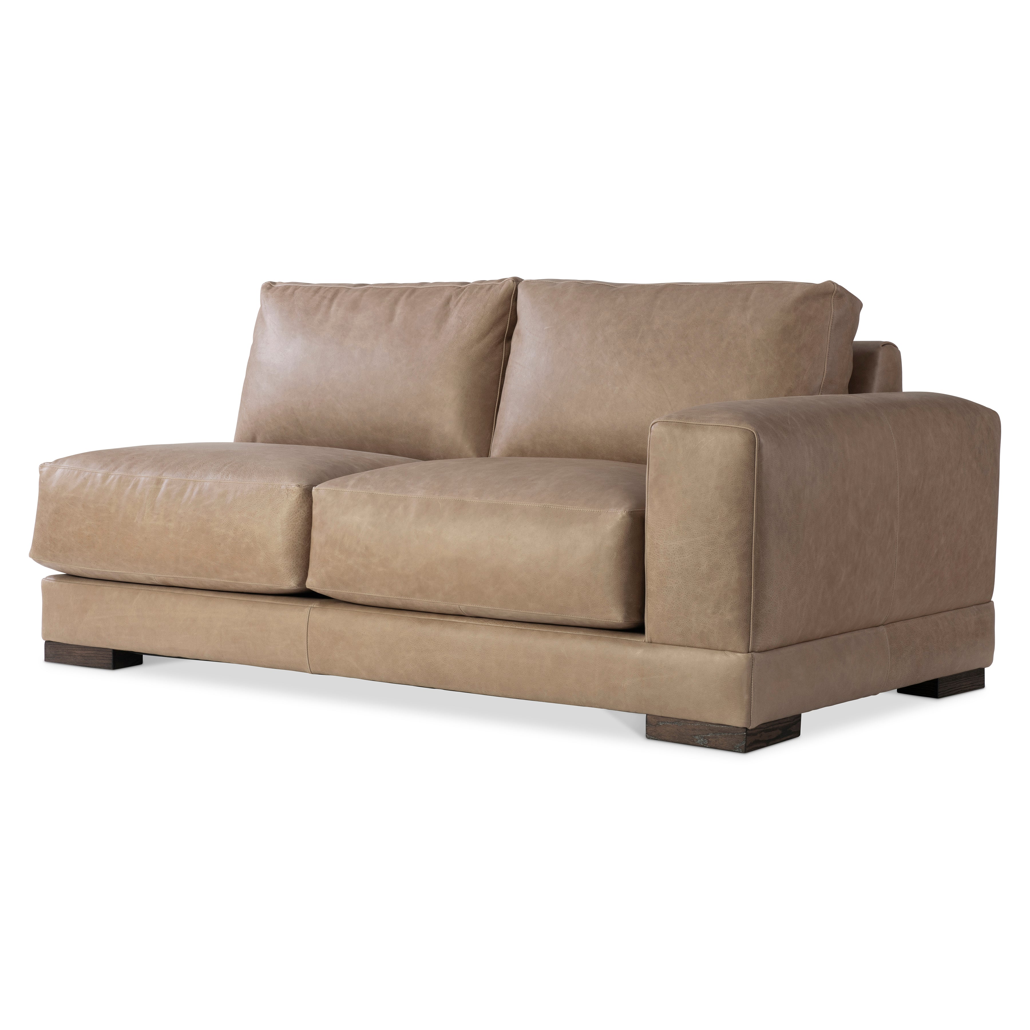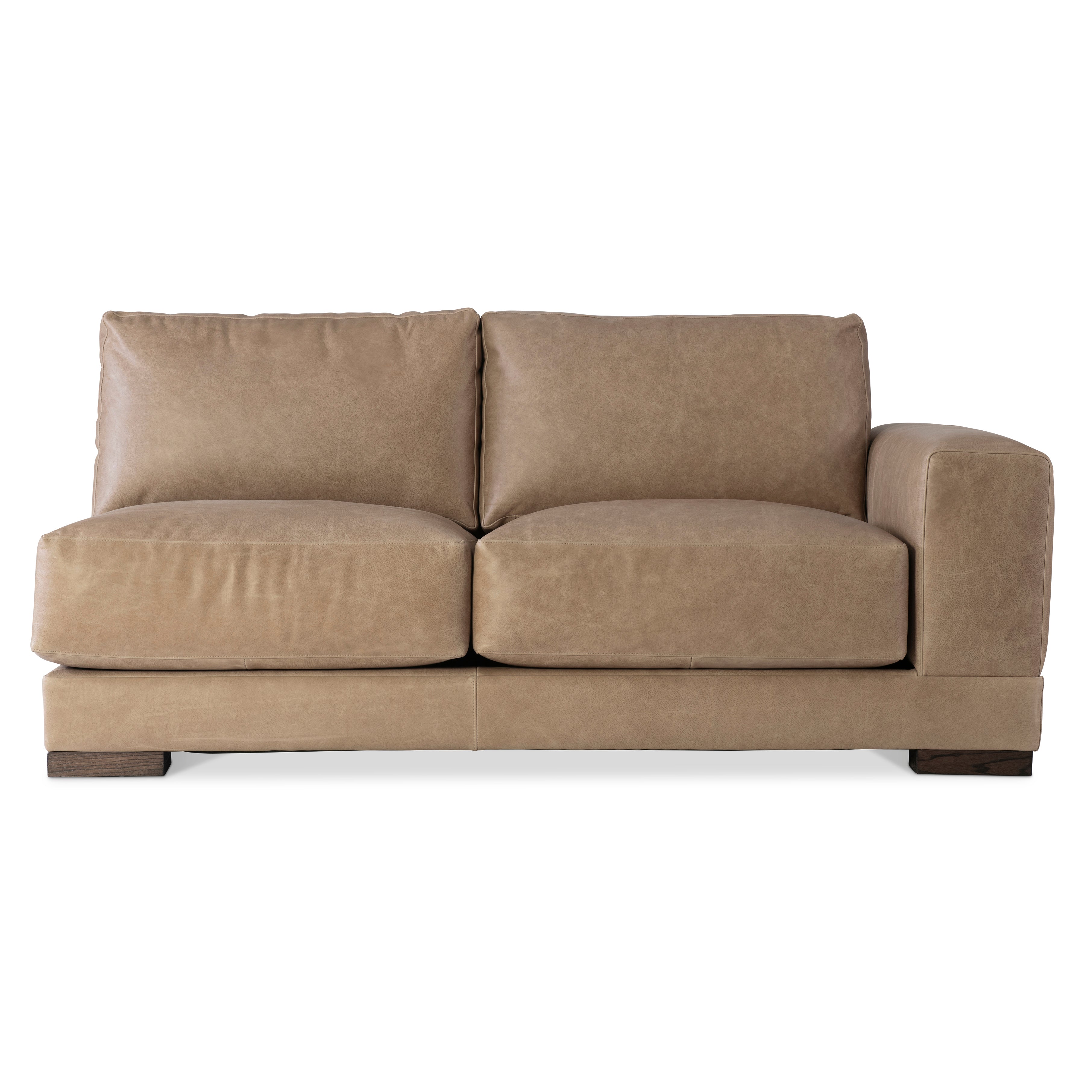 Straight lines are softened with gentle curves on the Lars right arm loveseat, complementing the wide track arm and bold silhouette. Plushly deep seat cushions and box-edge weltless bordered back pillows craft a comfort destination. Four wide block feet take a stance in textured wood. This loveseat is part of the Lars sectional.
