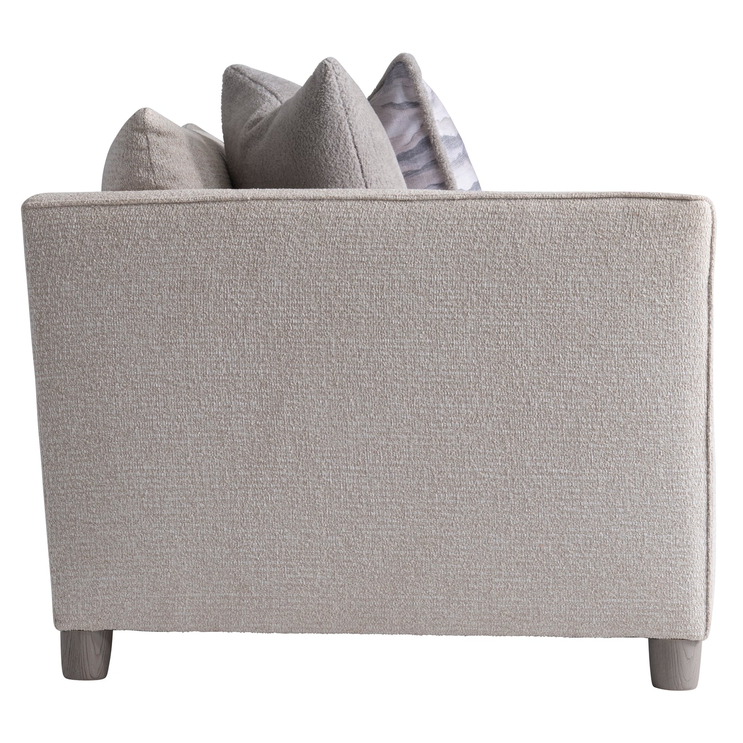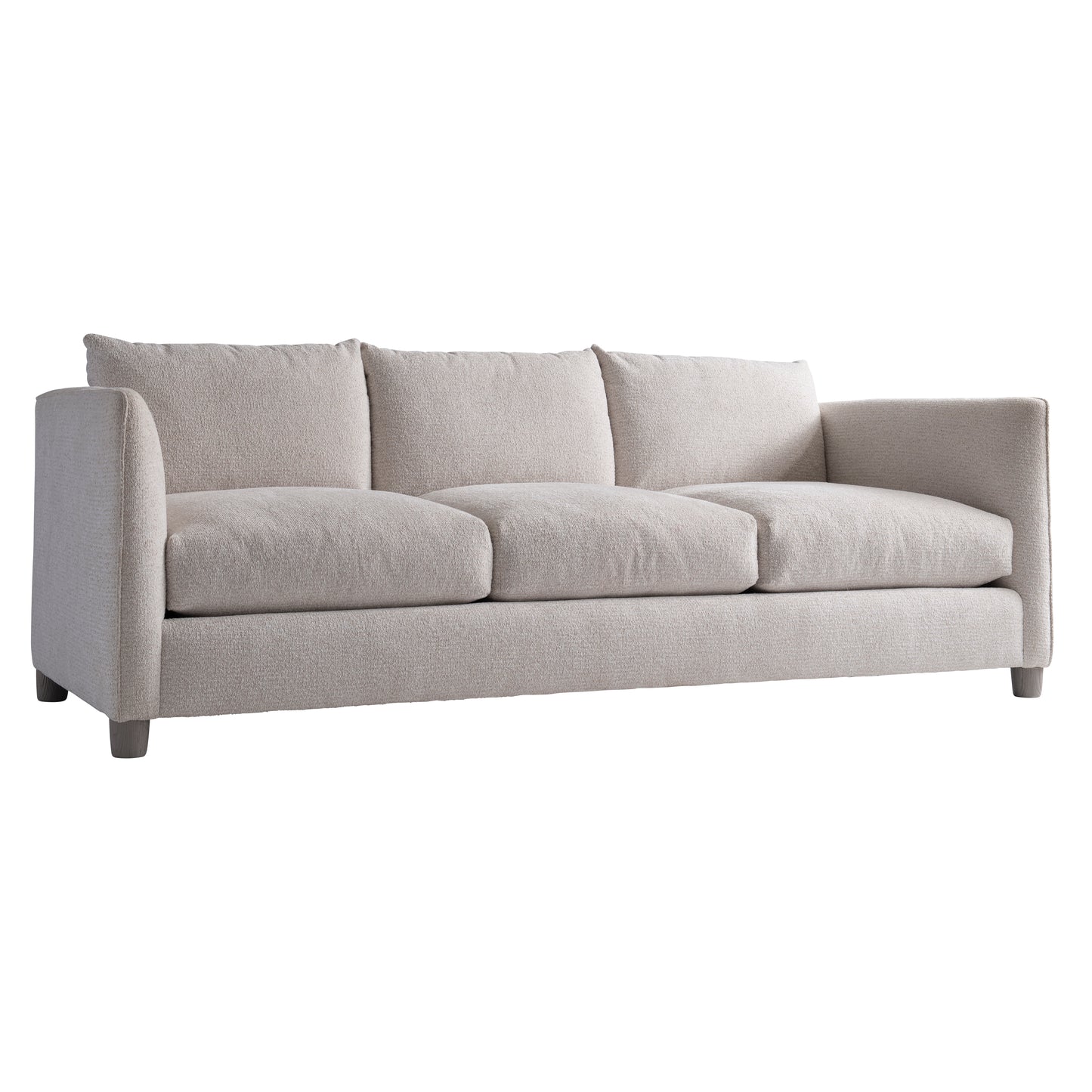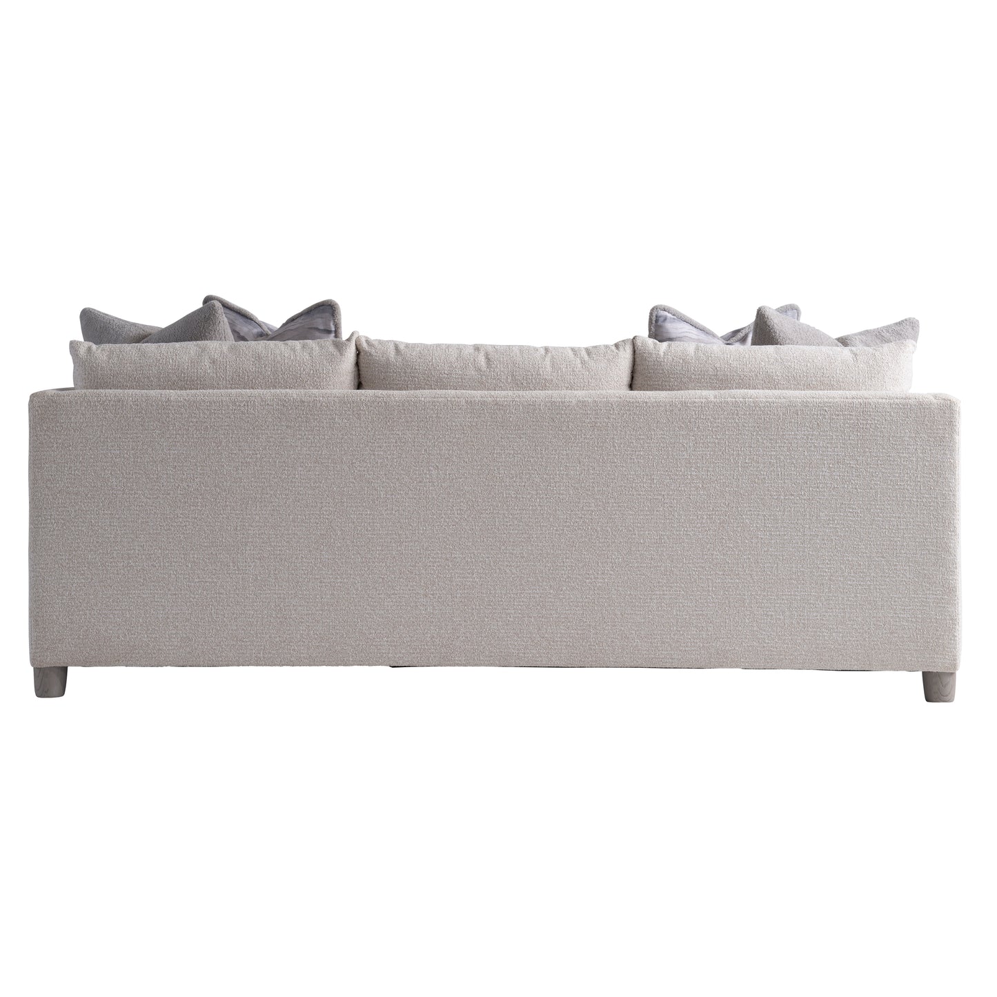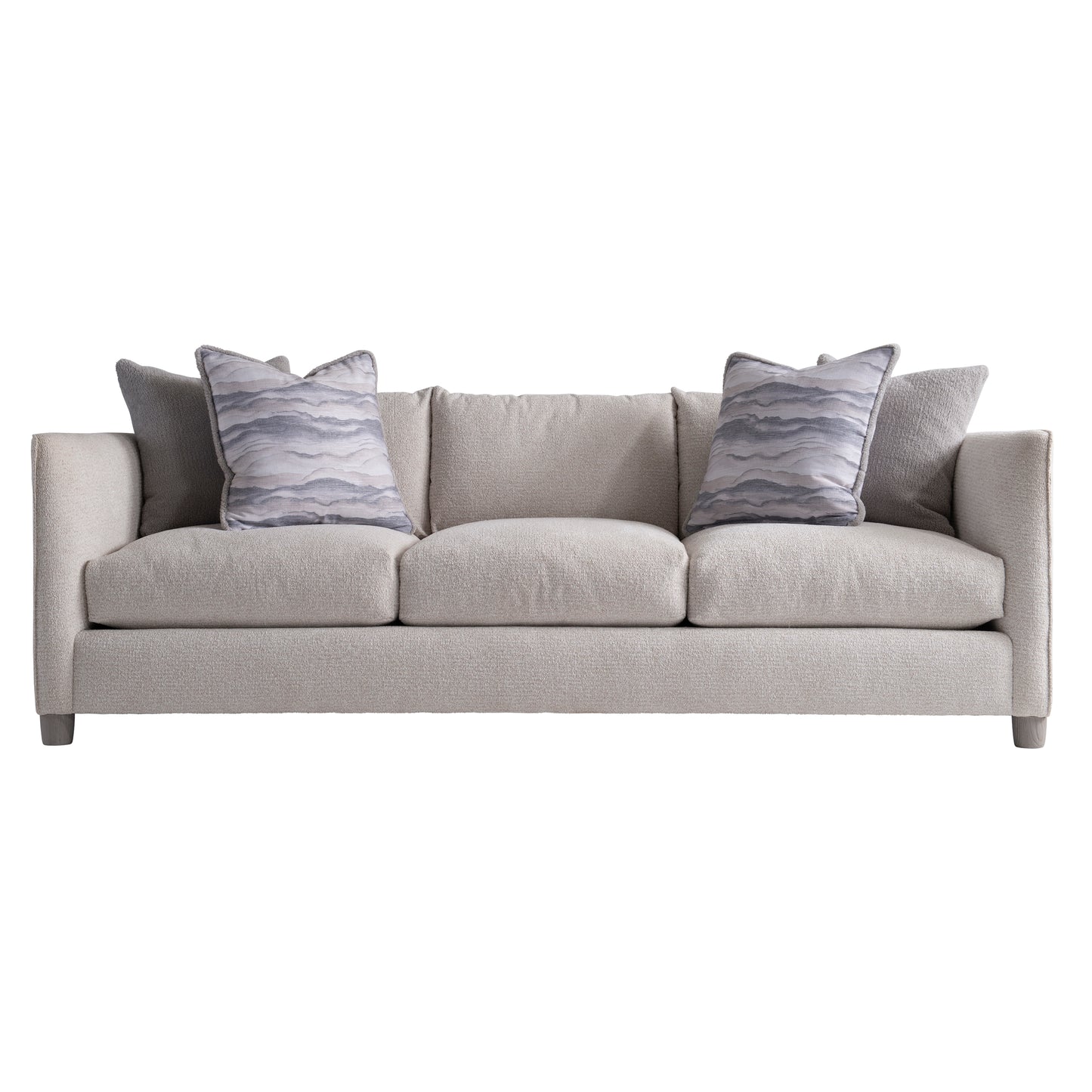 The Lille sofa may seem traditional at first glance, but a closer look offers refined details. The arms are softly flared, and the back and sides have a modern flange. Exposed wood legs are offered in the Gris finish only, while accent pillows add even more comfort.