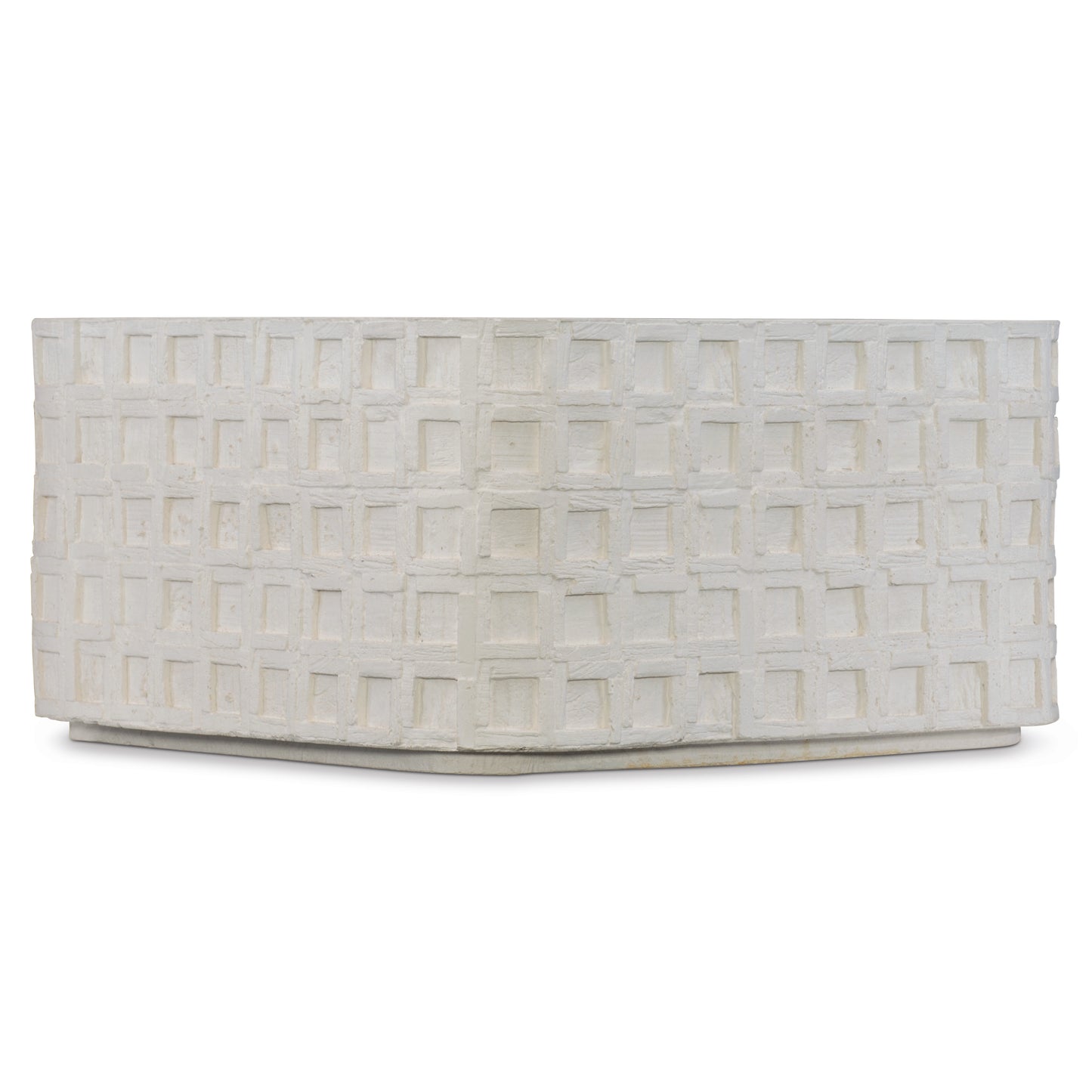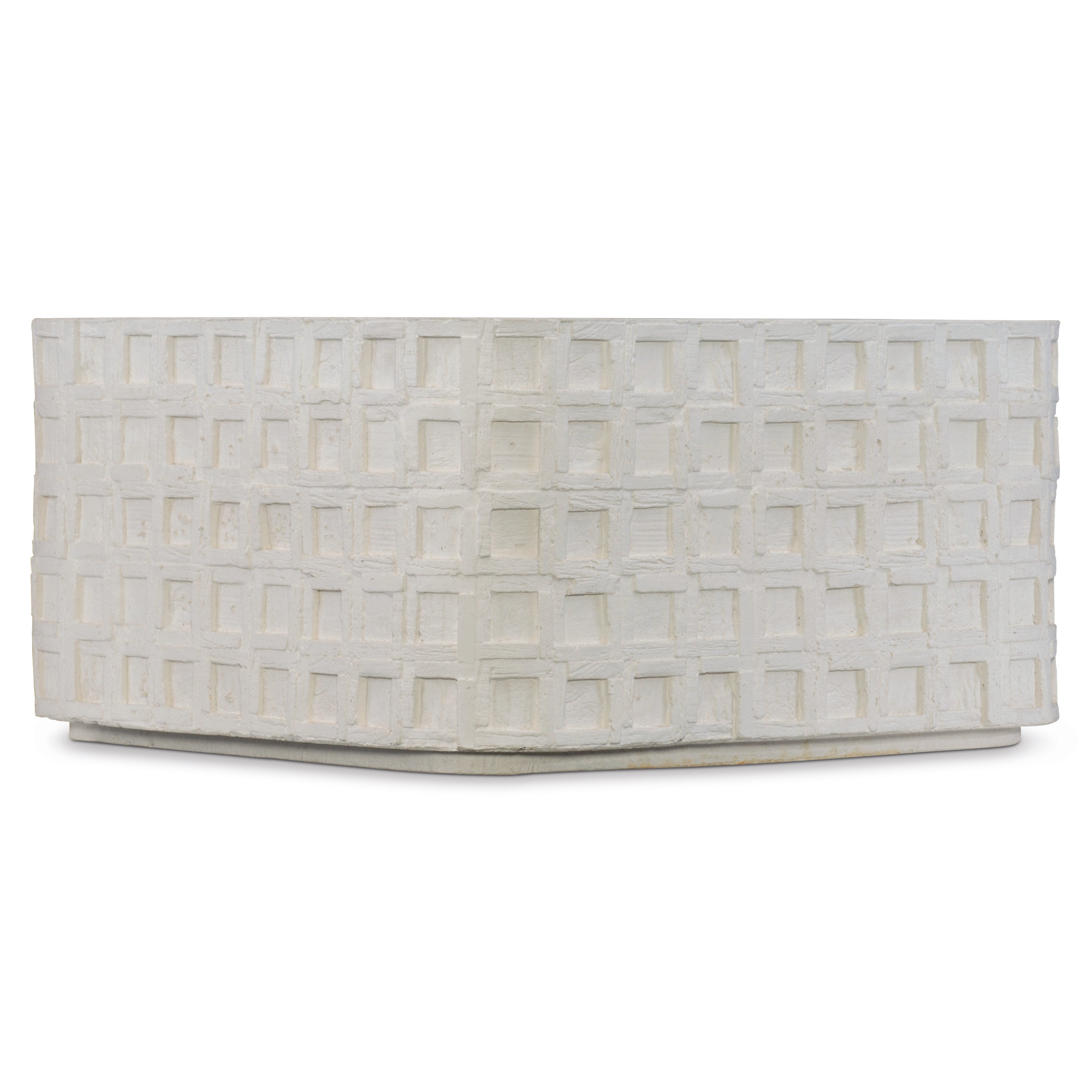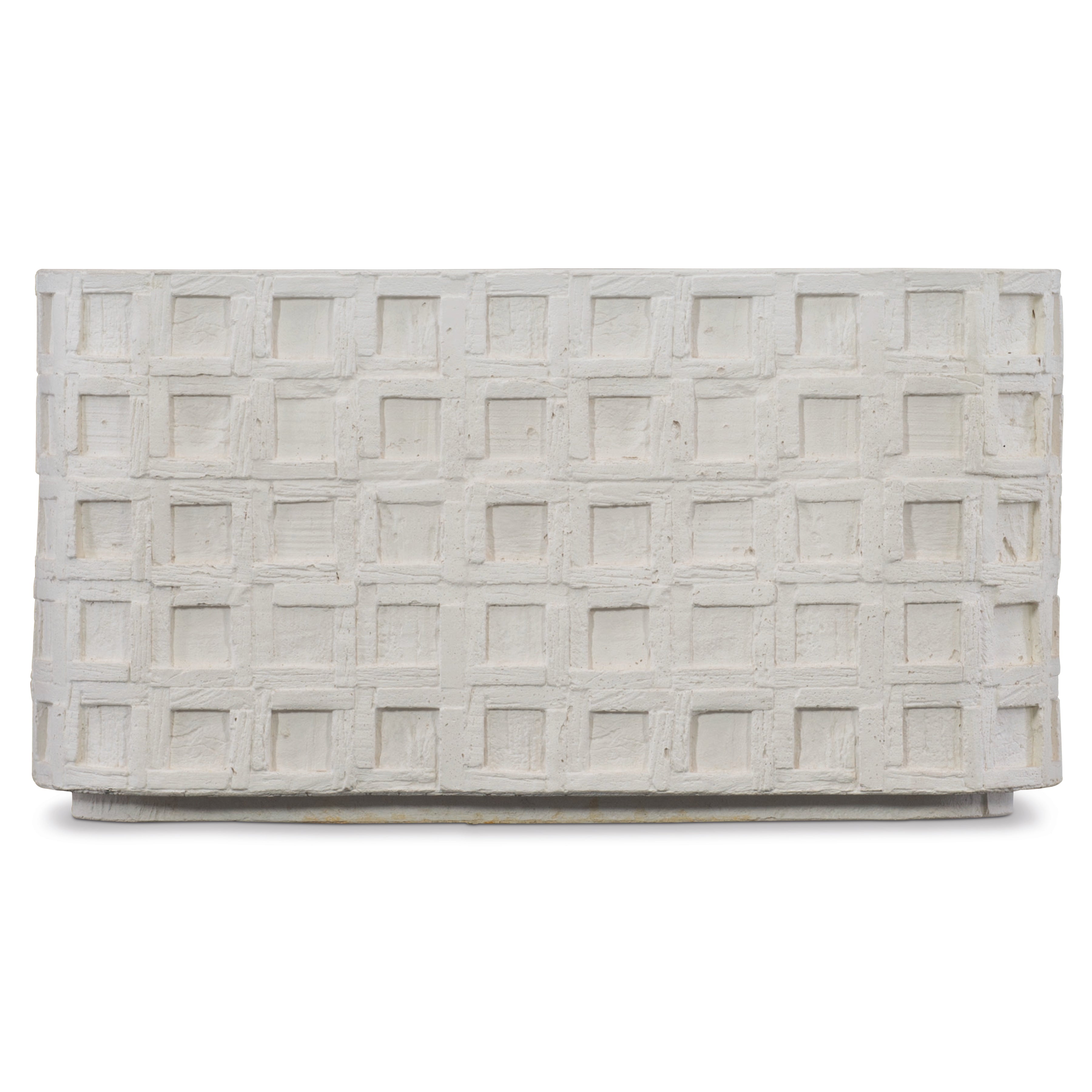 The Highland Park collection blends the best features of mid-century and farmhouse design, delivering an eclectic appeal with a laid-back vibe. The Lincoln Square cocktail table is casual in nature, yet stylish and sophisticated. Crafted from cast concrete in a vintage cream finish, it has a rustic texture and a unique, time-worn look. A geometric pattern of recessed squares creates dimension, while a thin plinth base adds a sophisticated architectural detail.