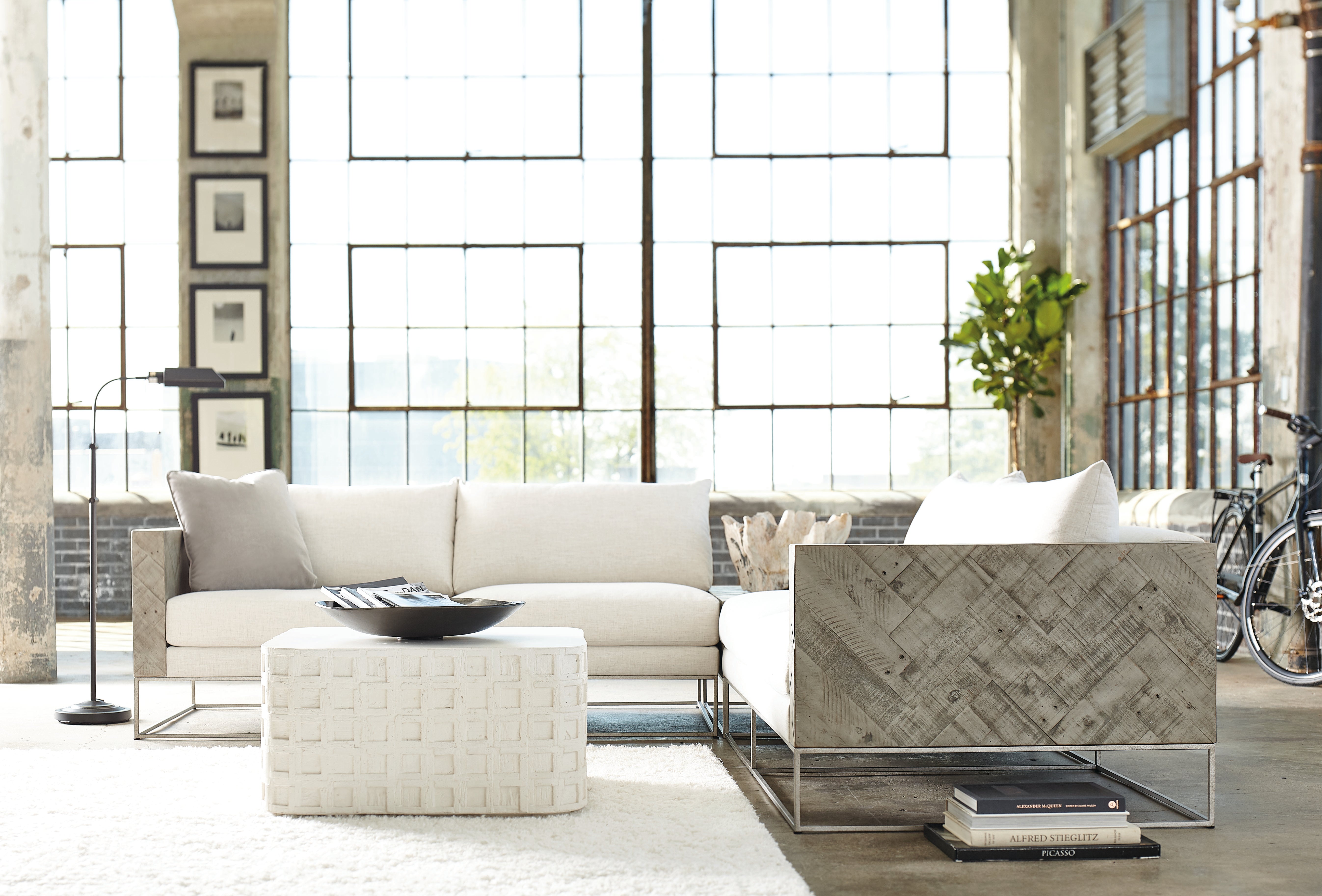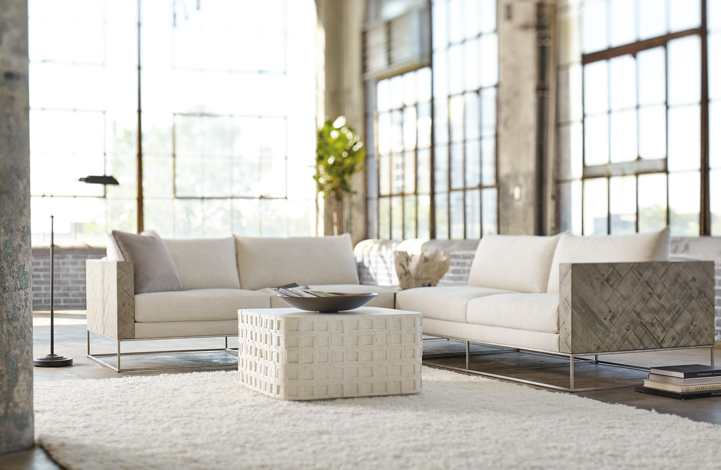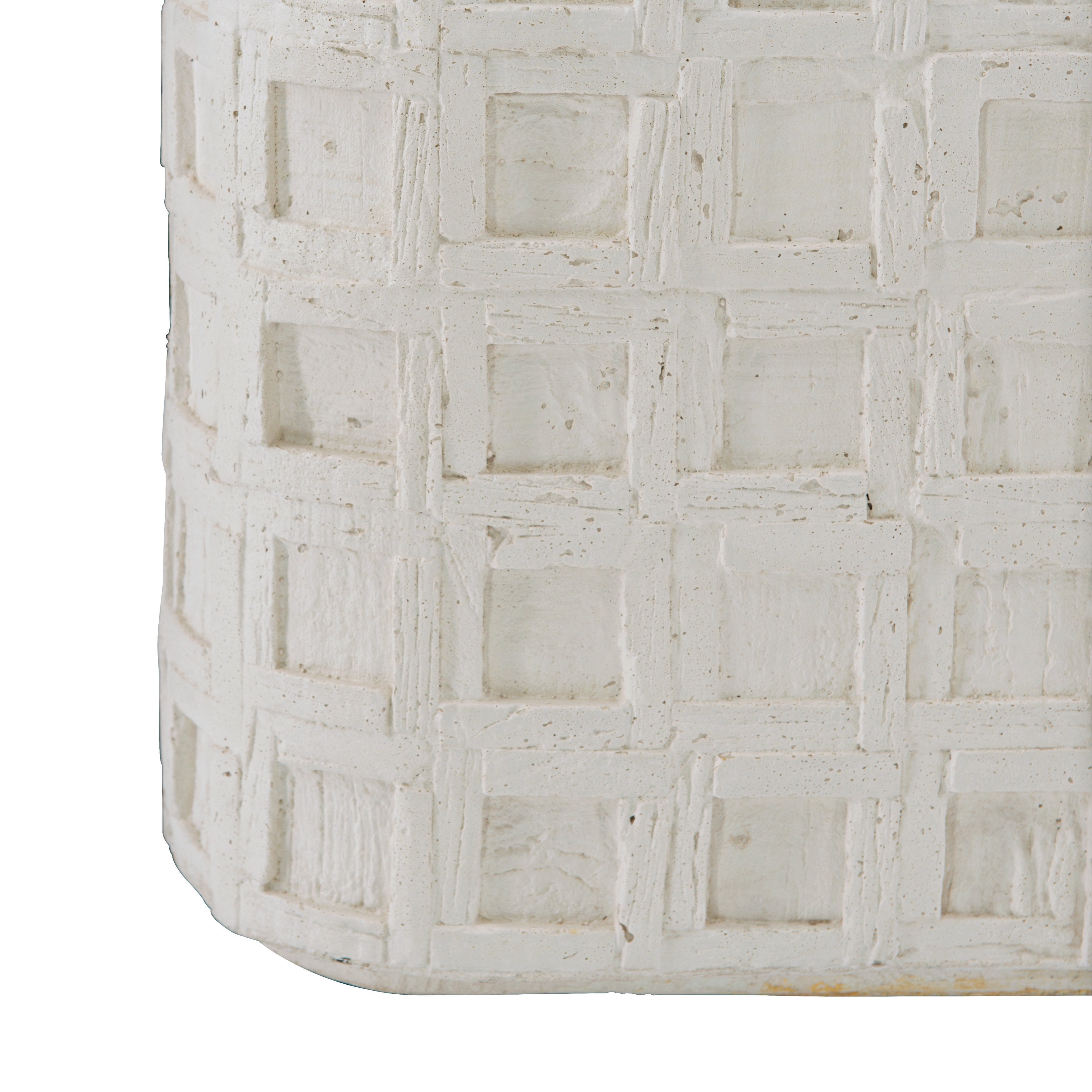 The Highland Park collection blends the best features of mid-century and farmhouse design, delivering an eclectic appeal with a laid-back vibe. The Lincoln Square cocktail table is casual in nature, yet stylish and sophisticated. Crafted from cast concrete in a vintage cream finish, it has a rustic texture and a unique, time-worn look. A geometric pattern of recessed squares creates dimension, while a thin plinth base adds a sophisticated architectural detail.