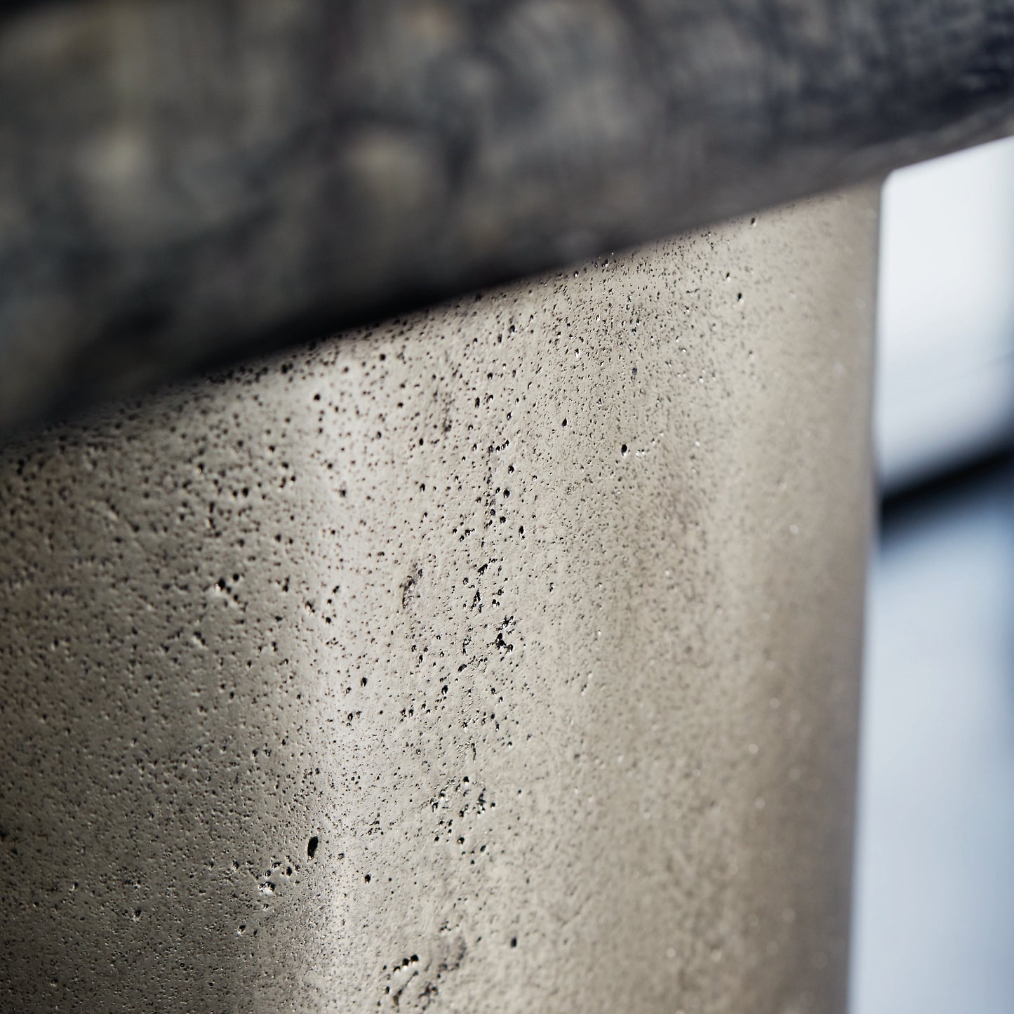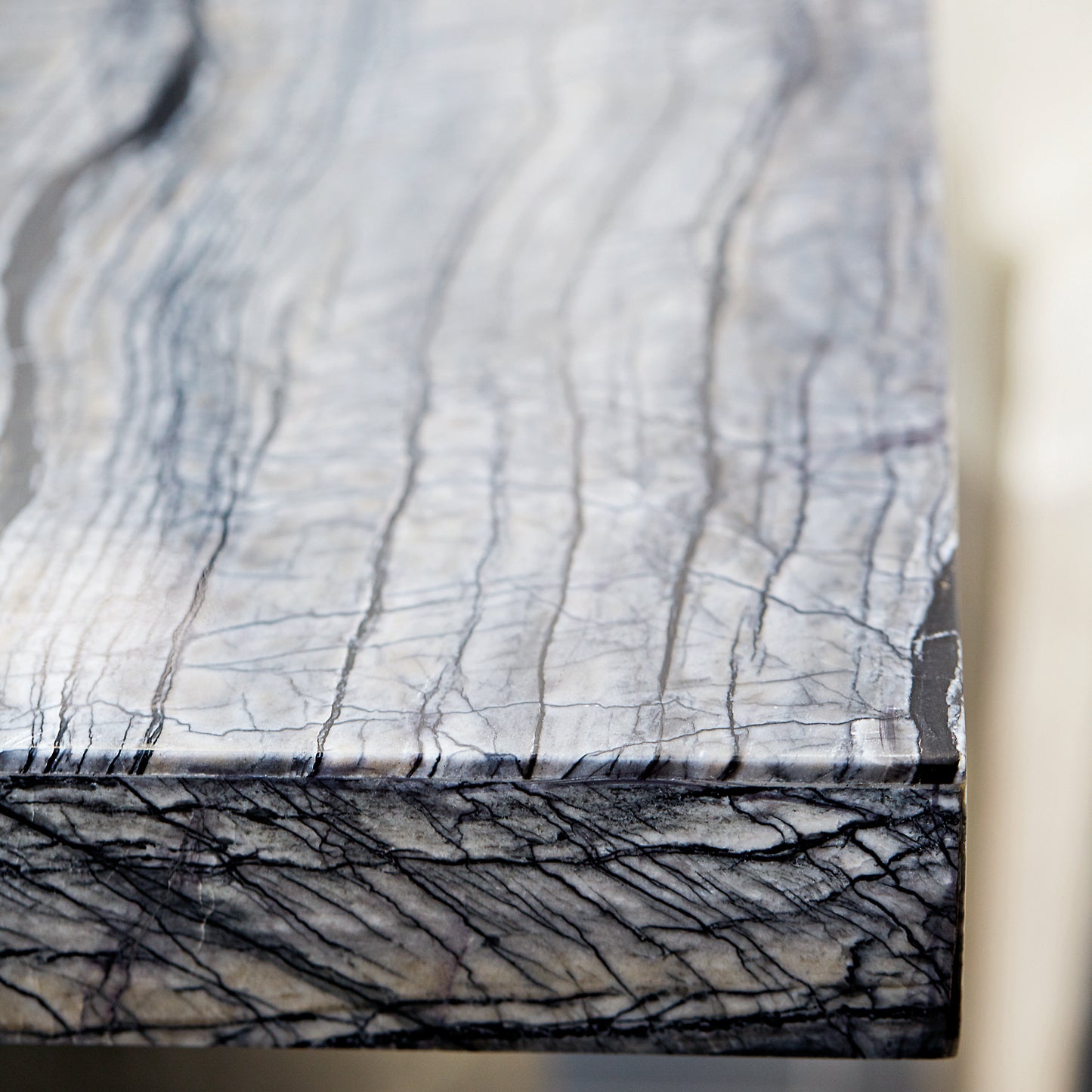 With its flawless artistry and understated elegance, Linea sets a new standard for rustic modern collections. Full of contrast and drama, the Linea desk pairs boldly patterned Black Forest marble with textured cast aluminum in a striking asymmetrical design. With its deep charcoal background and snow-white striations, the marble lends a high-end, elegant look. Adding layers of subtle sophistication, the round cast aluminum pedestal features a Textured Graphite finish obtained through a multi-step process.