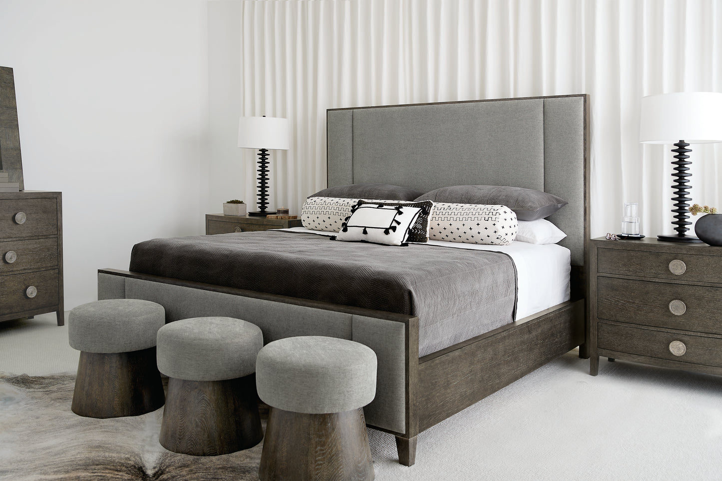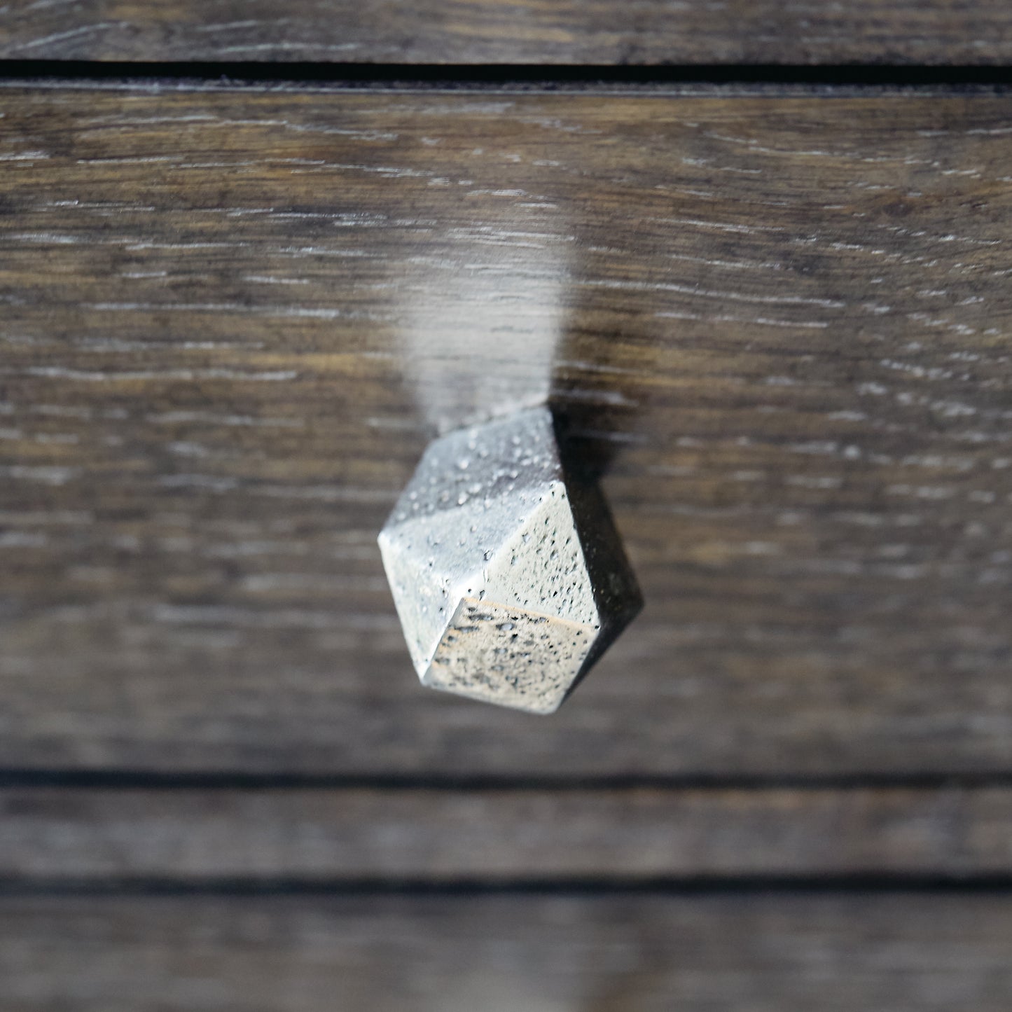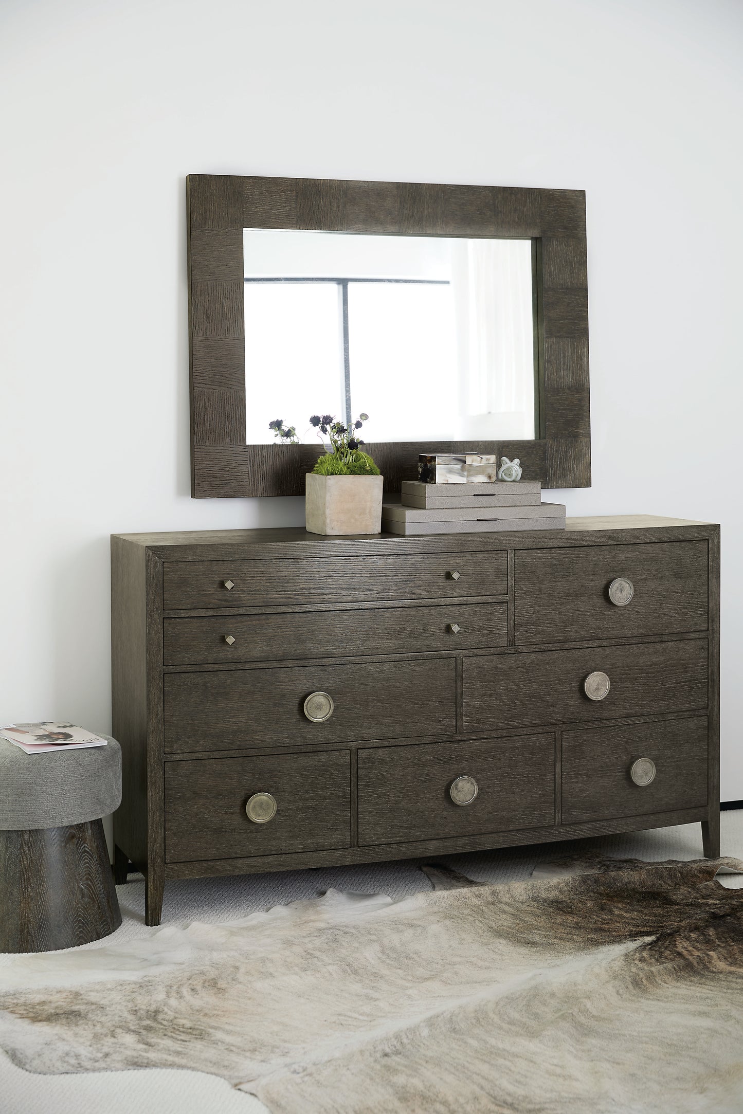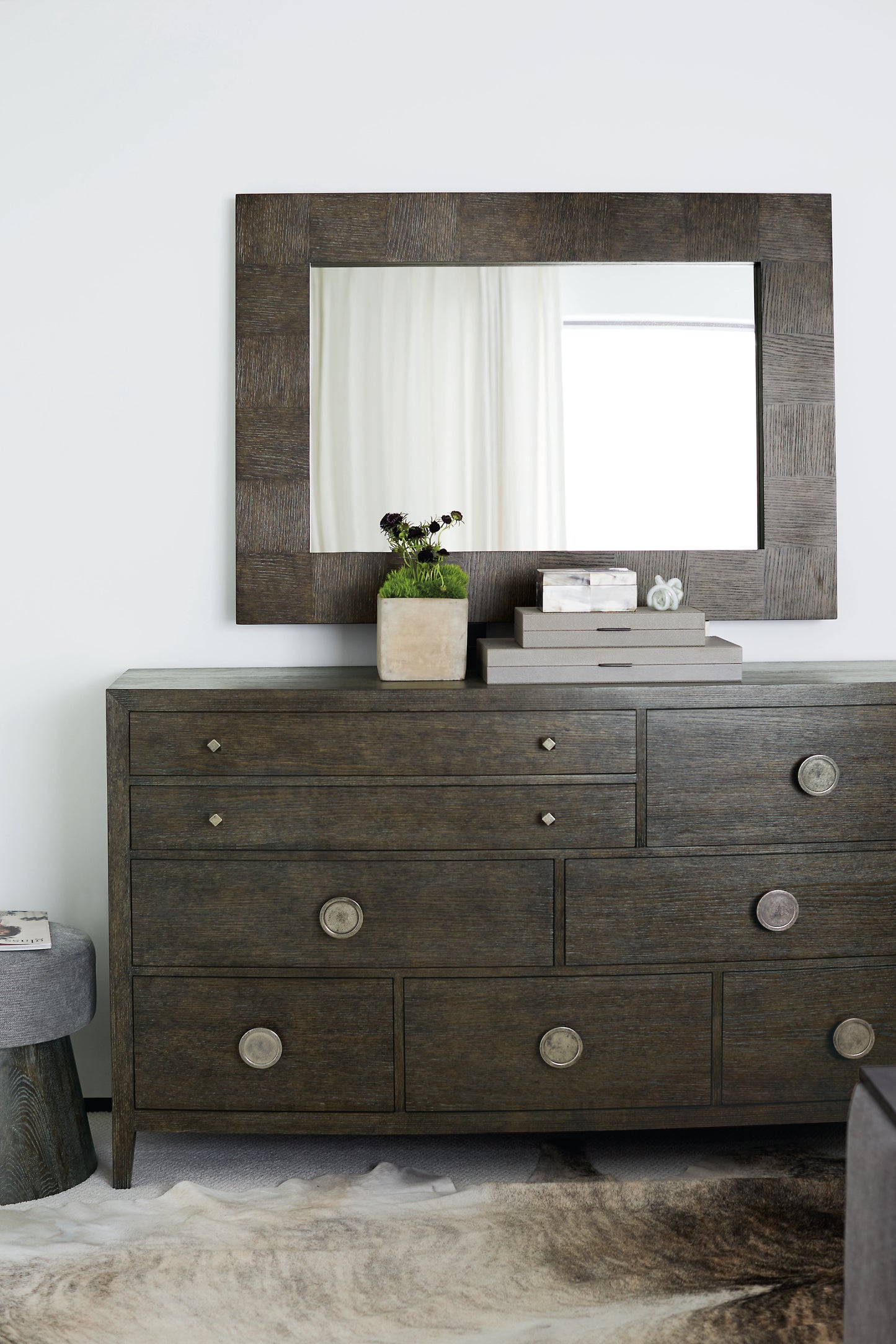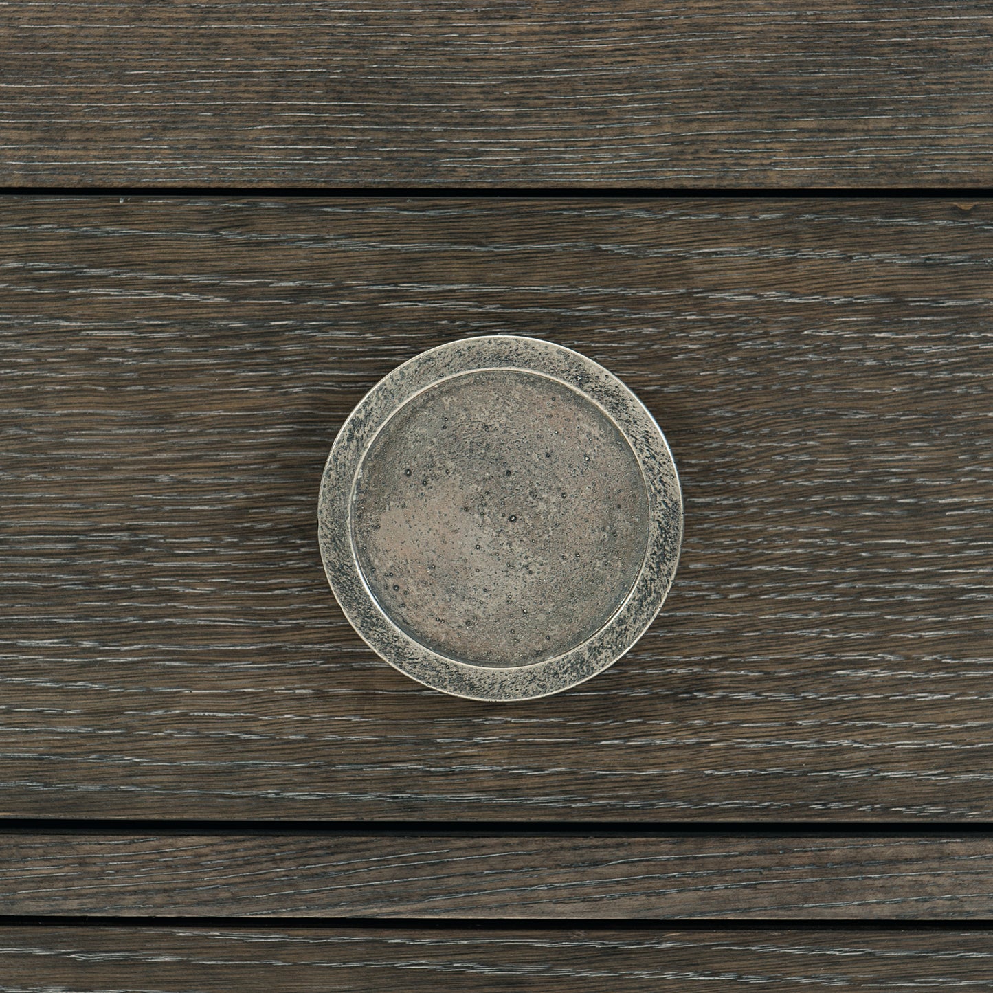 With its flawless artistry and understated elegance, Linea sets a new standard for rustic modern collections. Sleek lines, distinctive finishes and an asymmetrical form give the Linea dresser its singular look. Wire-brushed oak veneers offer subtle textures, while a Cerused Charcoal finish partners elegantly with cast aluminum hardware in a Textured Graphite finish. The heavily textured metal gives the circular pulls and faceted knobs a jewelry-like feel, adding to the artistic appeal of this eye-catching piece.