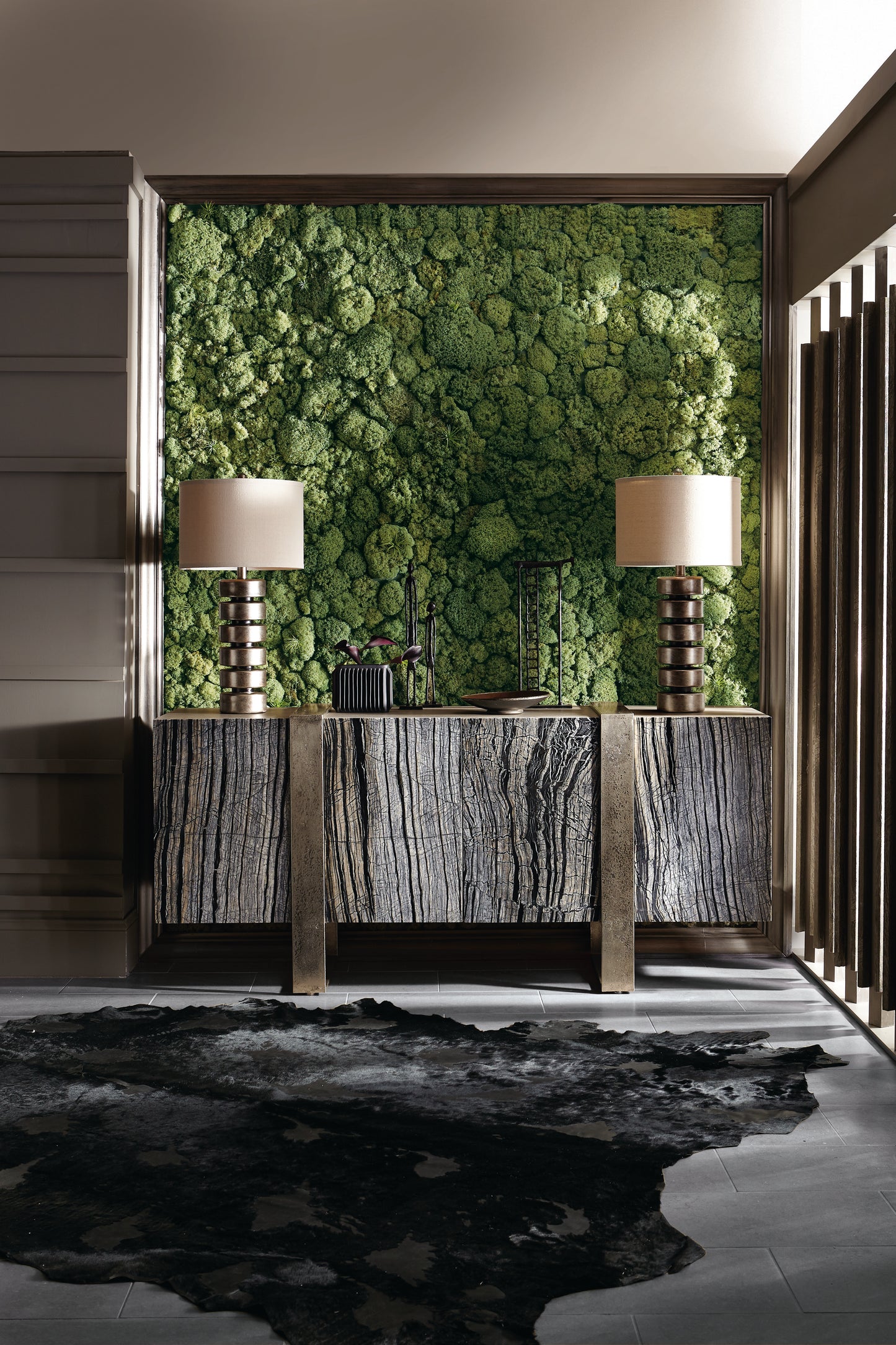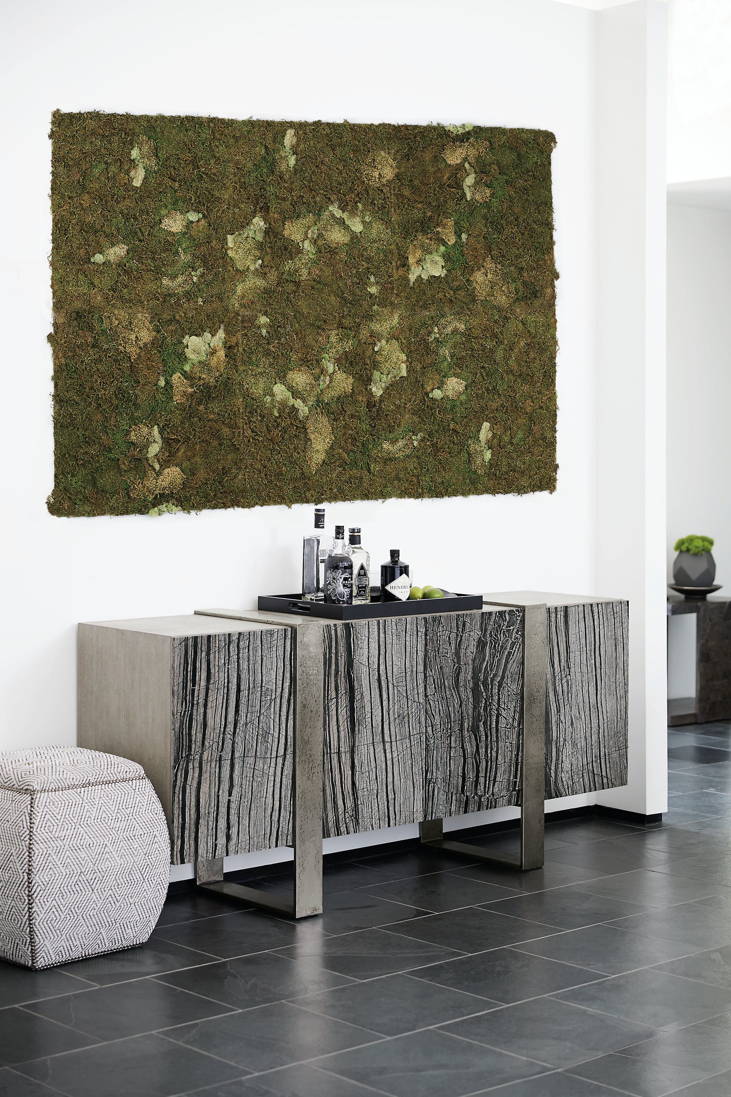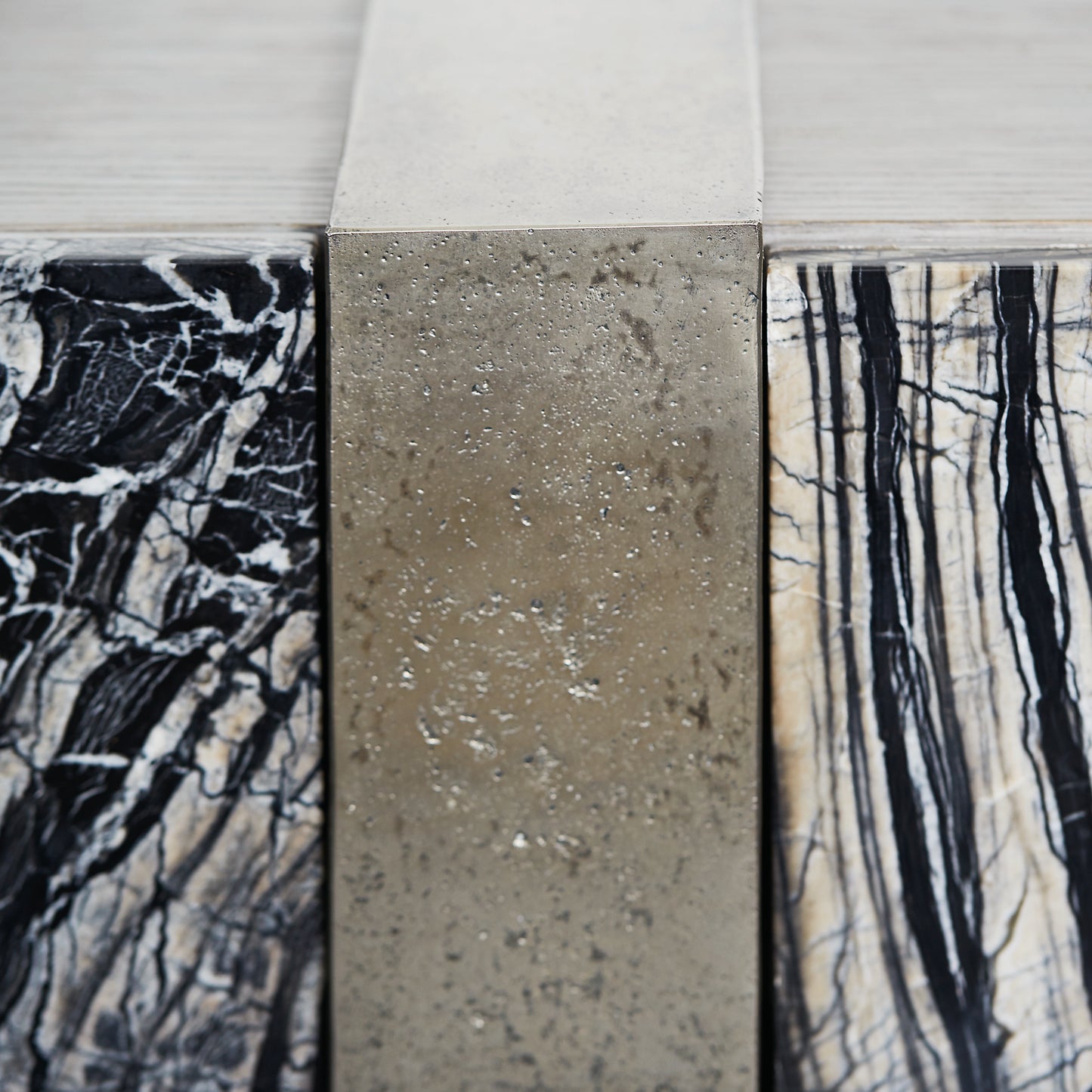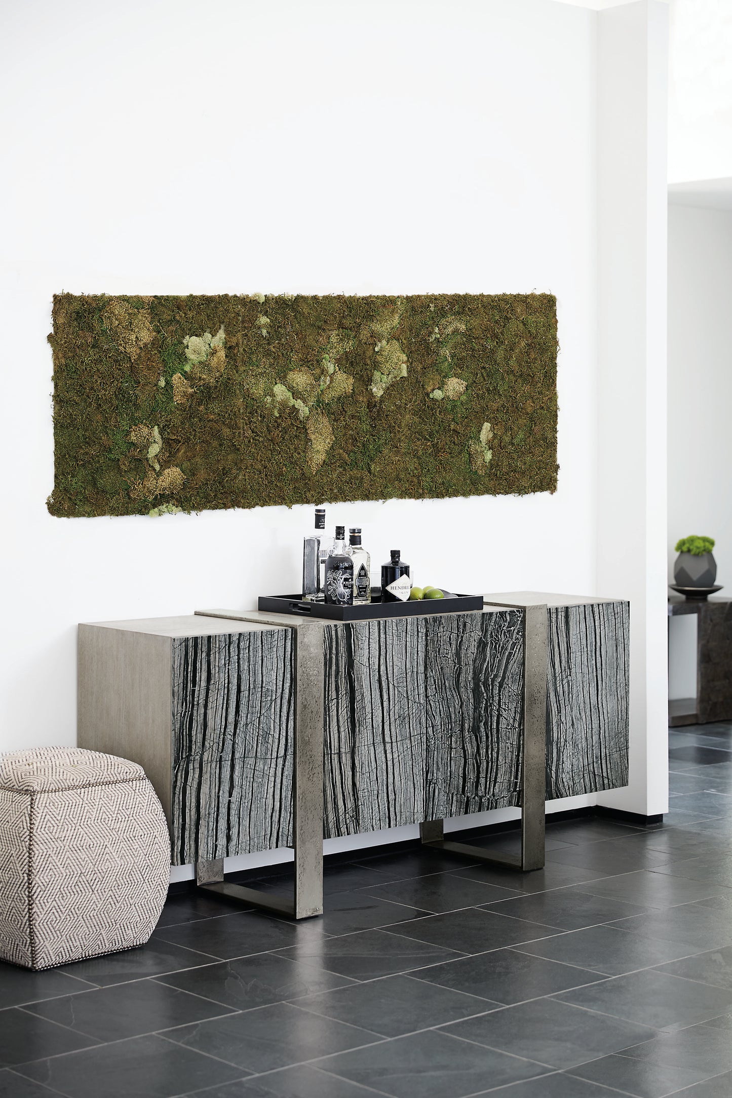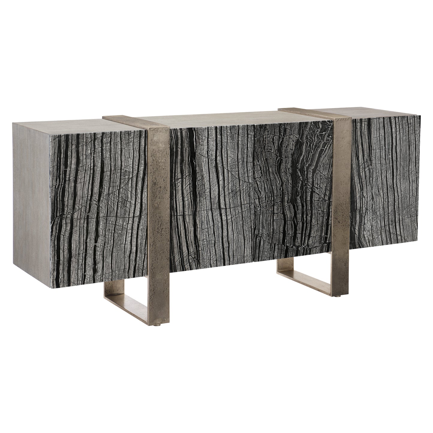 With its flawless artistry and understated elegance, Linea sets a new standard for rustic modern collections. In the stunning Linea entertainment console, boldly patterned Black Forest marble and textured cast aluminum blend seamlessly in splendid style. The striking design features four push-to-open, self-closing doors and a metal frame which wraps around the entire case. With its deep charcoal background and snow-white striations, the marble lends a high-end, dramatic look to this functional piece.