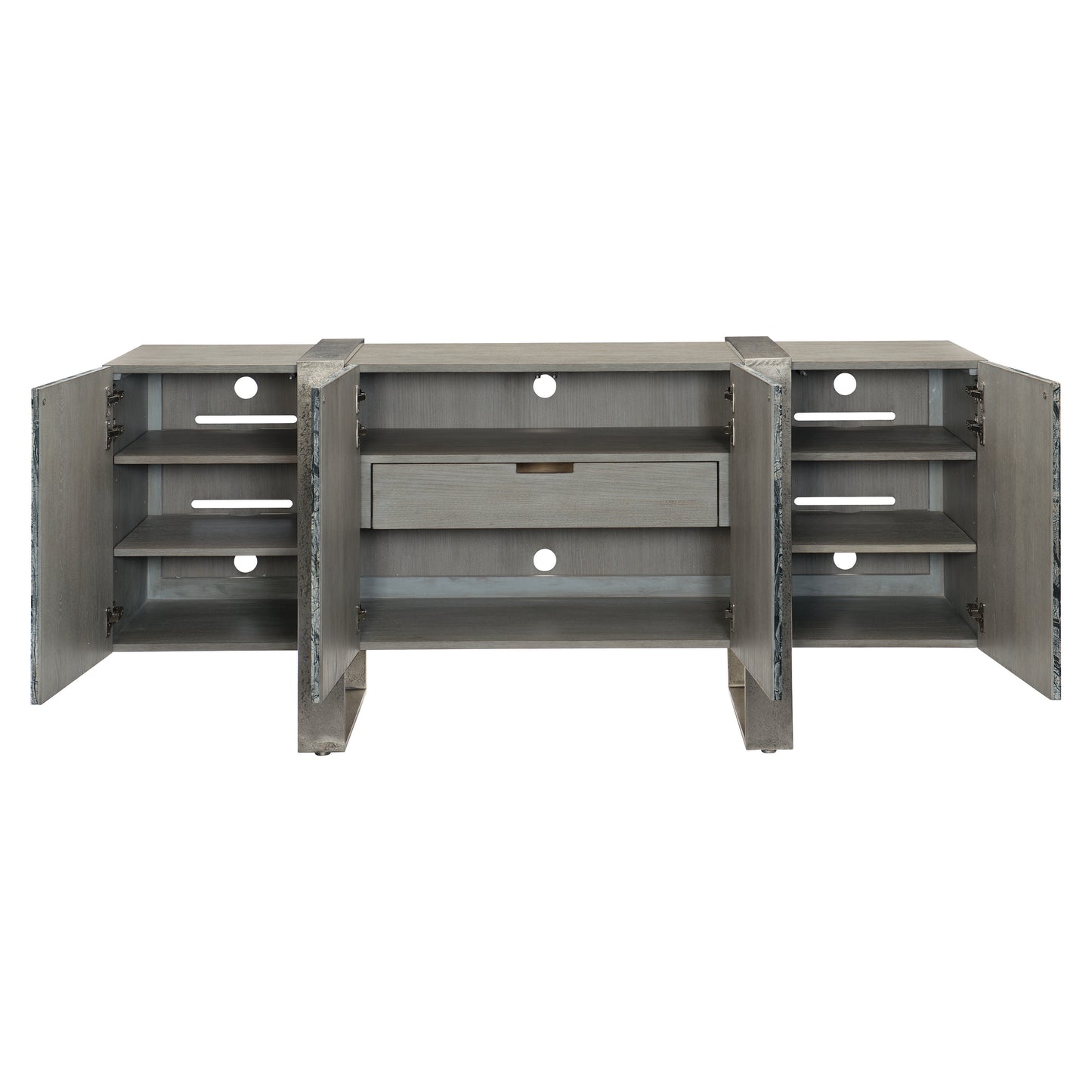 Cast aluminum frame in Textured Graphite finish wraps over top and down front of case, and forms the base. Wood top and end panels in Cerused Greige finish. Four pull-to-open doors, with concealed soft/self closing hinges, with laminated Black Forest stone fronts. Behind left and right door are two adjustable/removable shelves. Behind center paired doors are one fixed shelf with a drawer beneath it with hand pull cut-out. Wrapped pad in drawer. Black adjustable glides. Anti-tip kit.