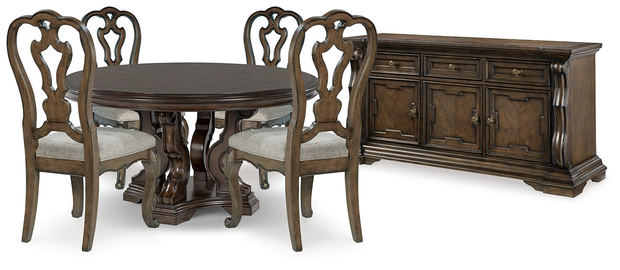 From its ornamental appliques to its large scale, this dining package makes a bold statement. With ornate details, this opulent set wows with stunning style. The look is timeless. The feel? Right at home.