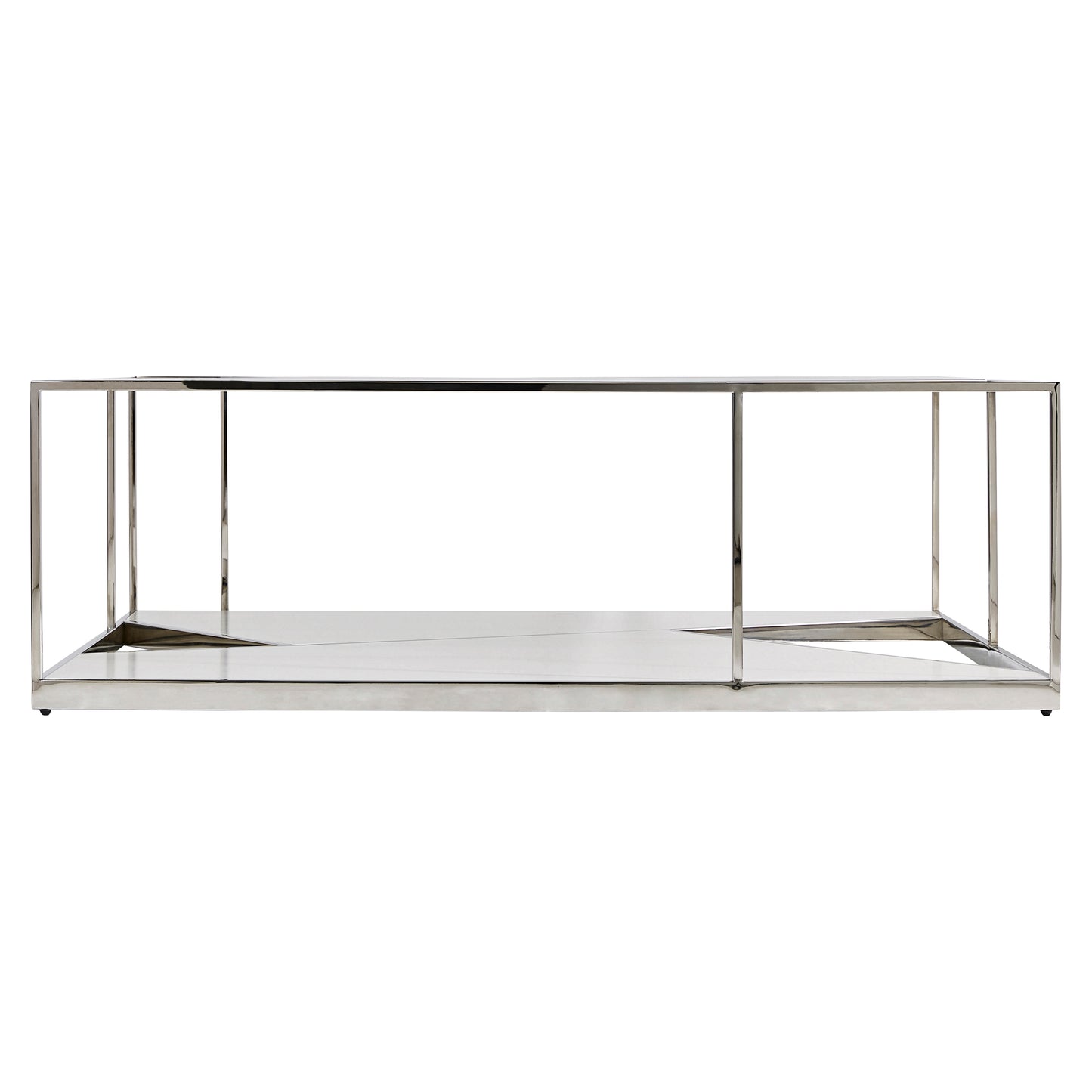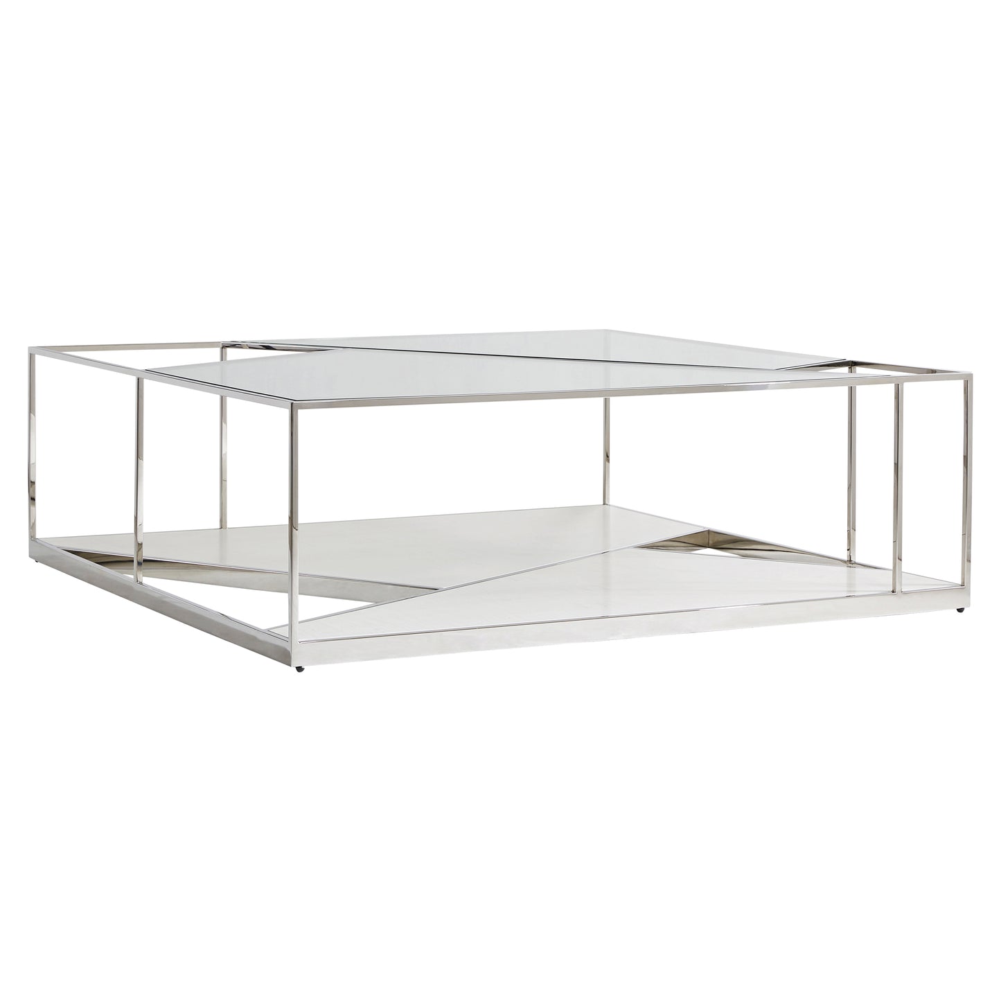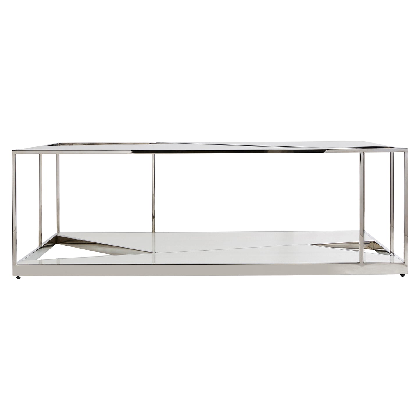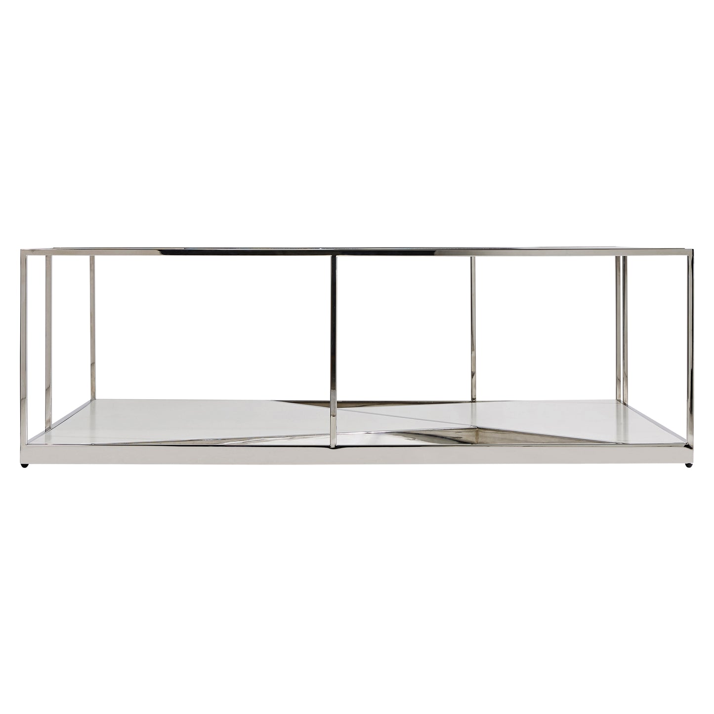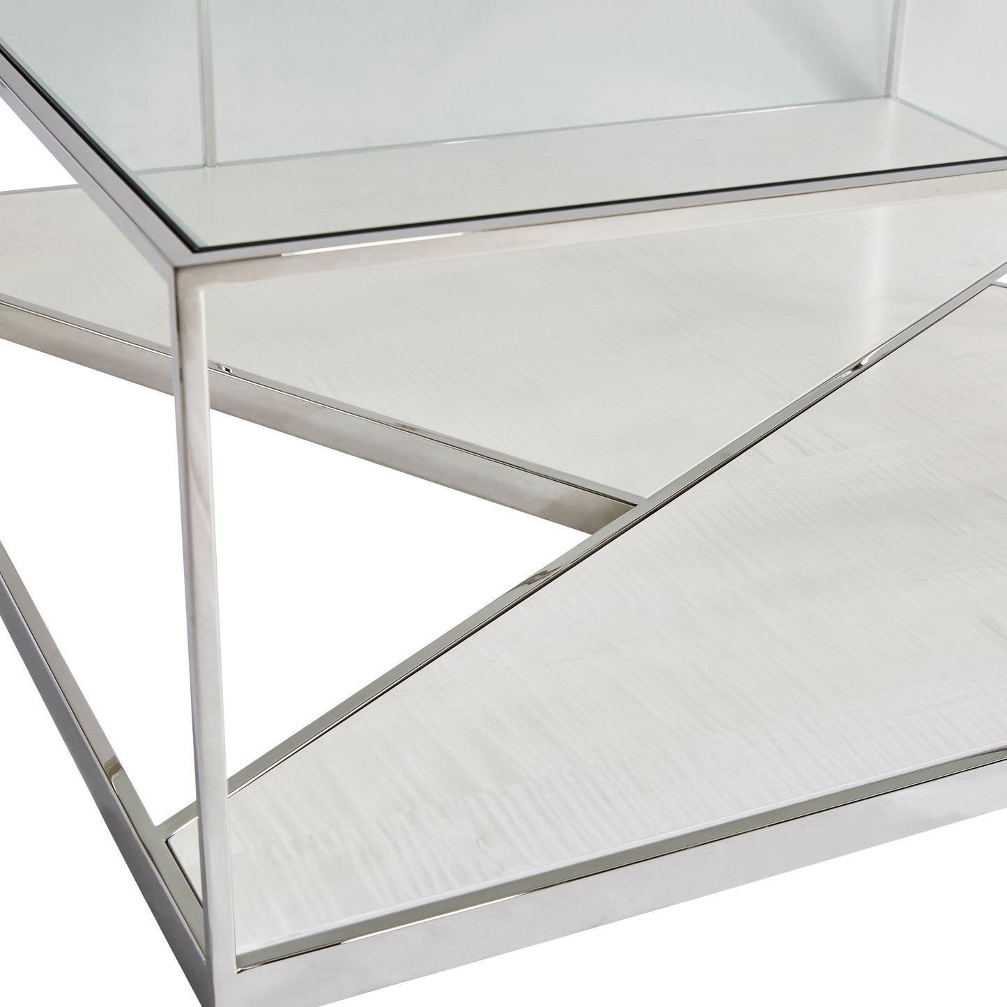 Geometric shapes open up a new modern dialog in the Maymont cocktail table. The tempered glass top features two open corners, while the base crafts open triangles in stainless steel with inset panels of figured sycamore veneer in a Powder finish. The result is strong styling that makes a stylish point.