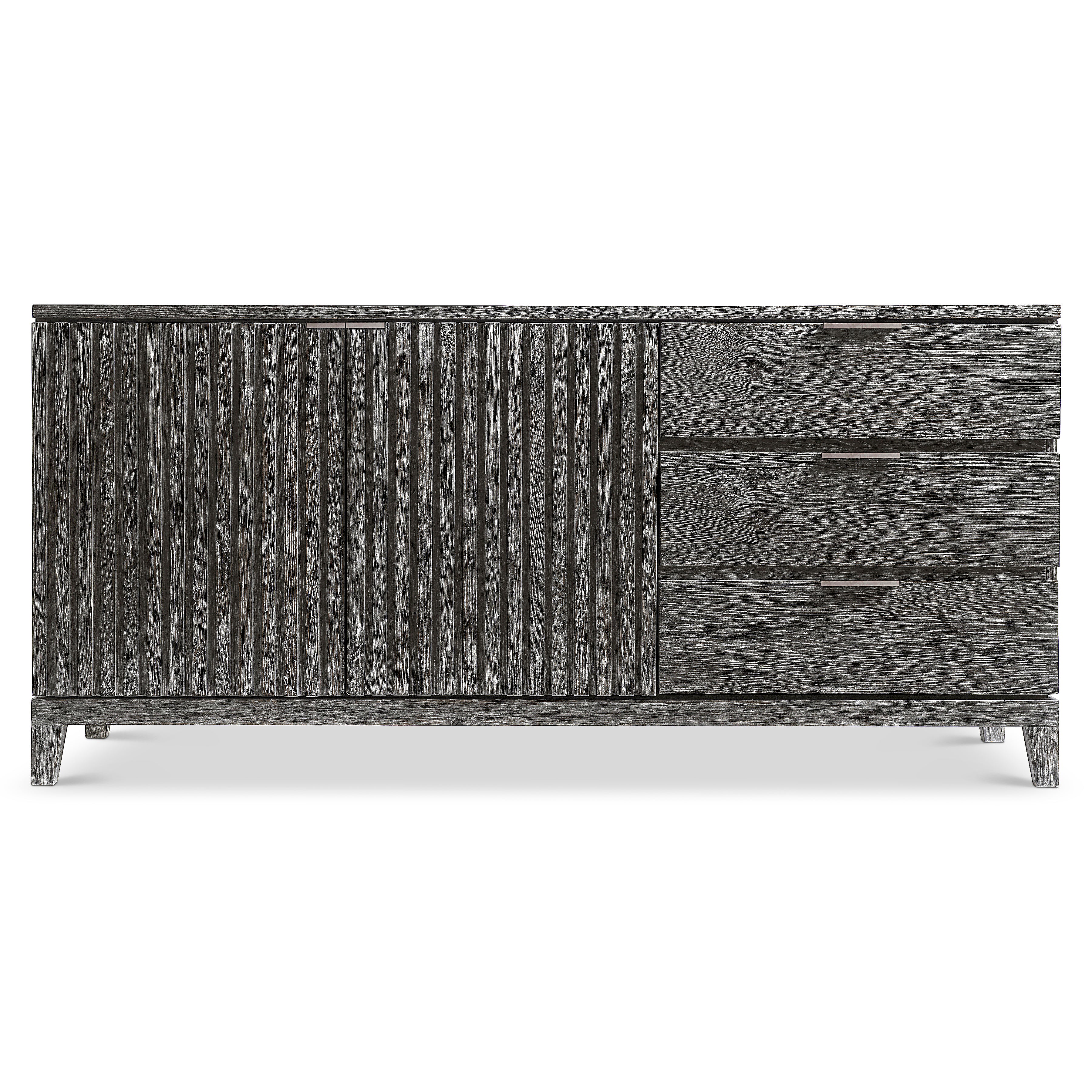 A modern perspective is redefined in a moody palette for the Menton buffet. Perfectly balancing beauty and function, the design offers two deeply reeded doors and three pull-to-open drawers with cast aluminum pulls. Interior storage includes two adjustable shelves.