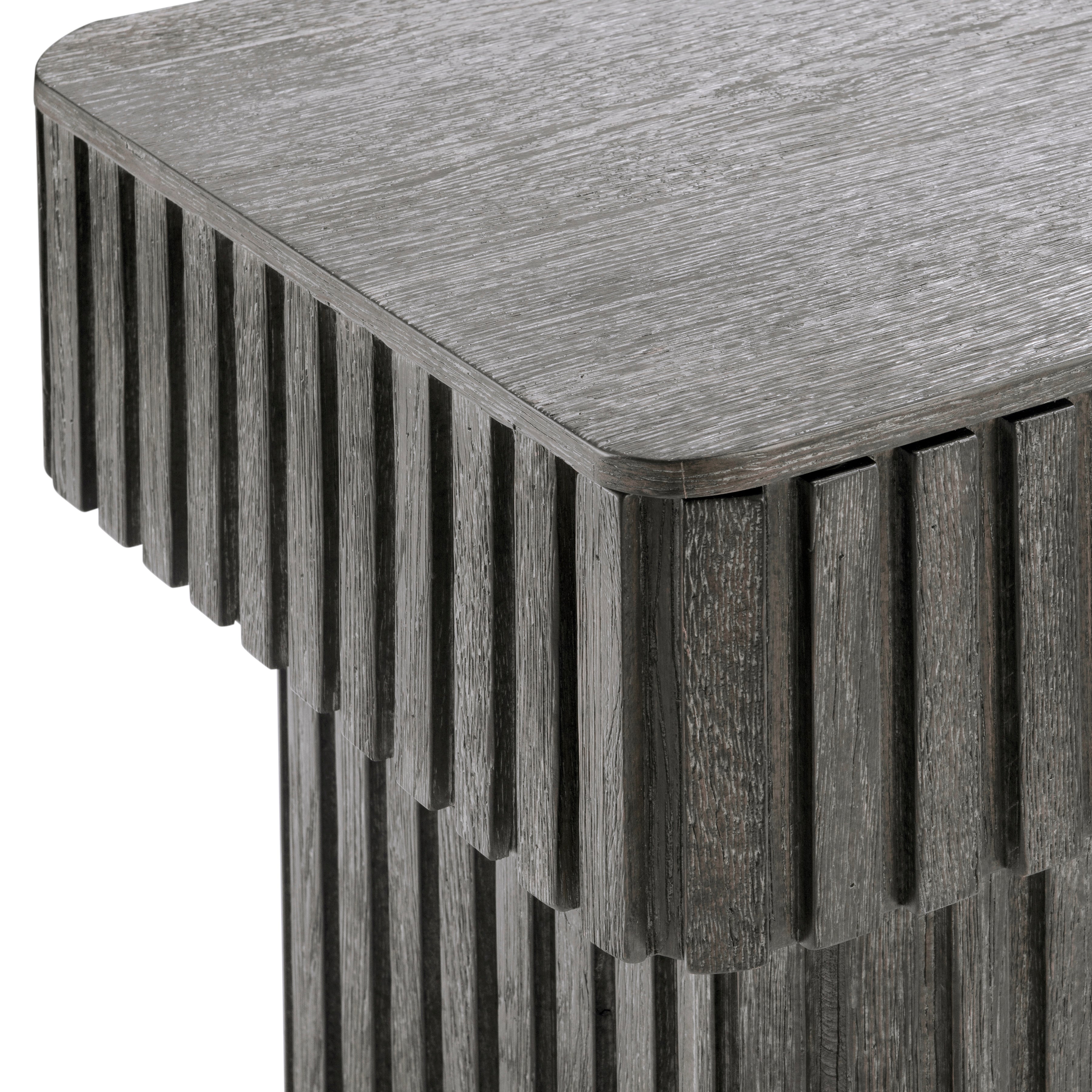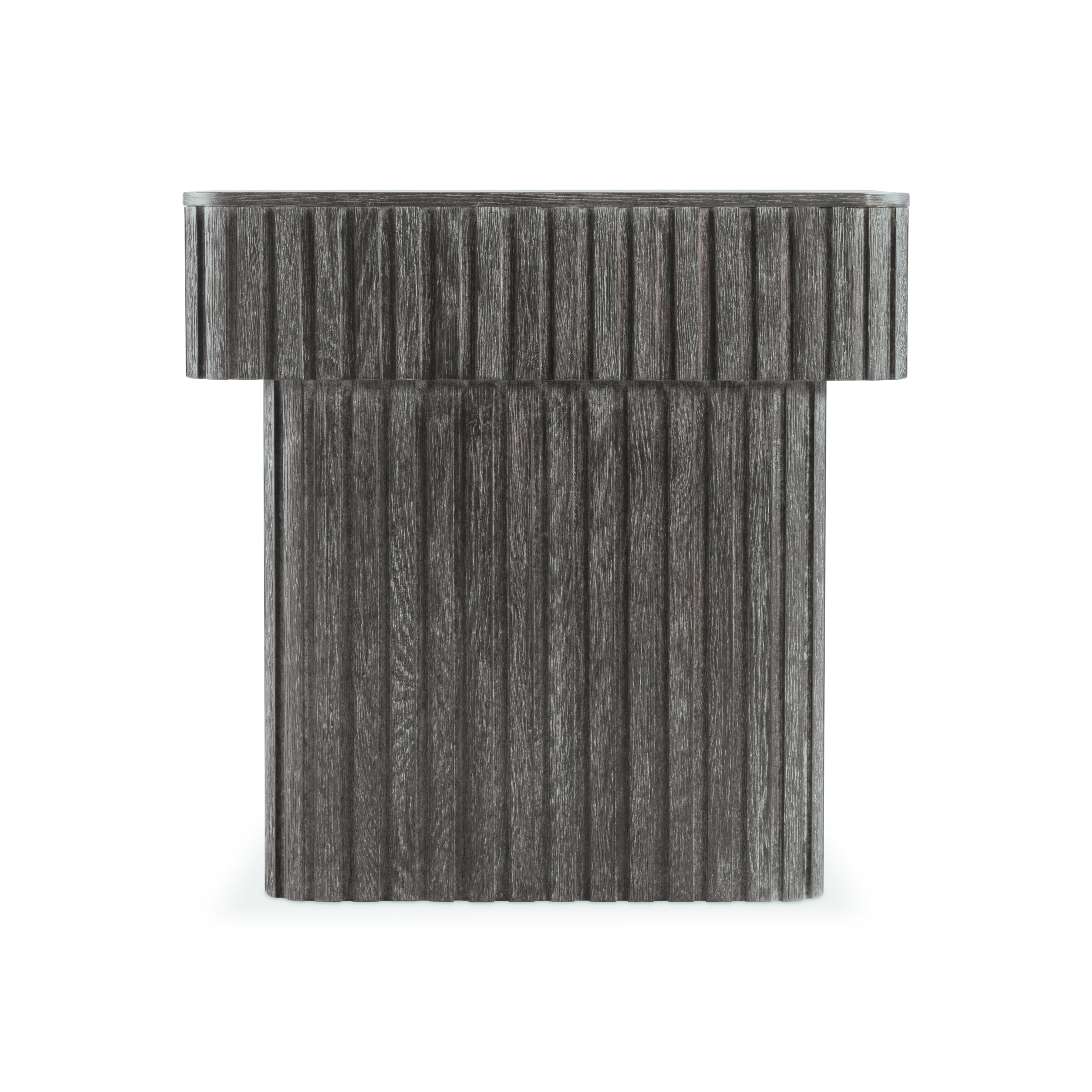 Inspired by architectural design, the Menton nightstand features deep linear reeding around the base and the sides of the top, with a smooth table surface. A hidden pull-to-open drawer is accessed with a finger pull. The deeply textured woodgrain is highlighted with the Sutton finish.