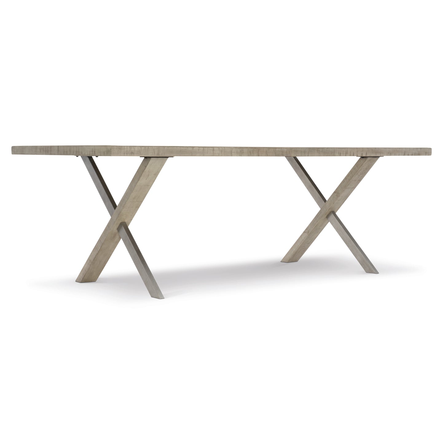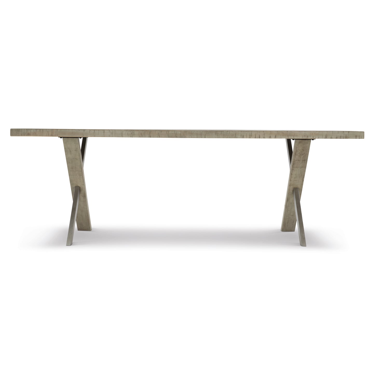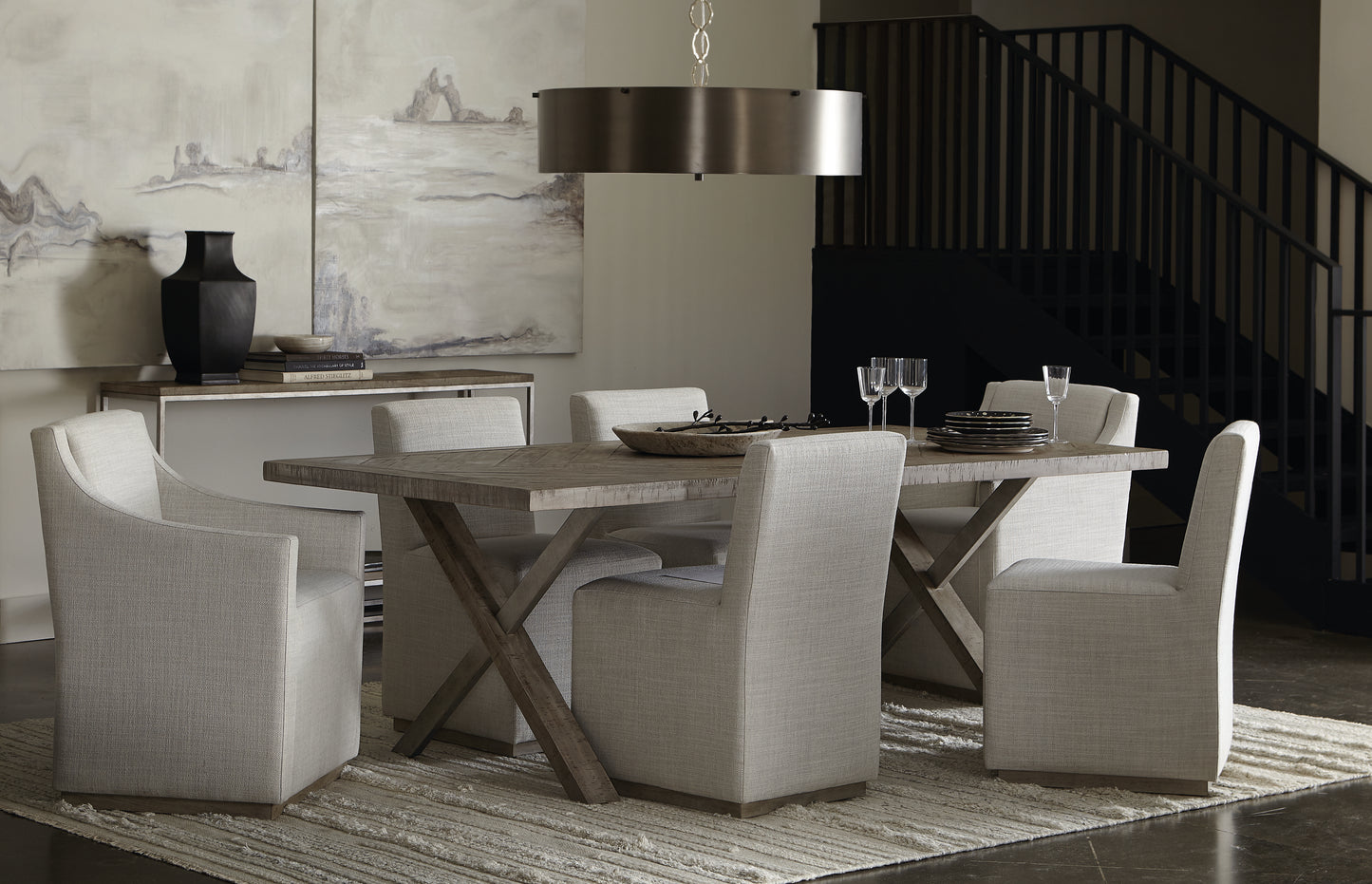 The Highland Park collection delivers eclectic appeal with a laid-back vibe. The Milo dining table takes a modern dynamic approach to rustic farmhouse style. Reclaimed pine planks form a herringbone pattern on the top. The distressed pine is finished in a muted gray Morel, highlighting the grain and imperfections in the wood. Metal legs in a Glazed Silver finish intersect with wood legs on the eye-catching base.