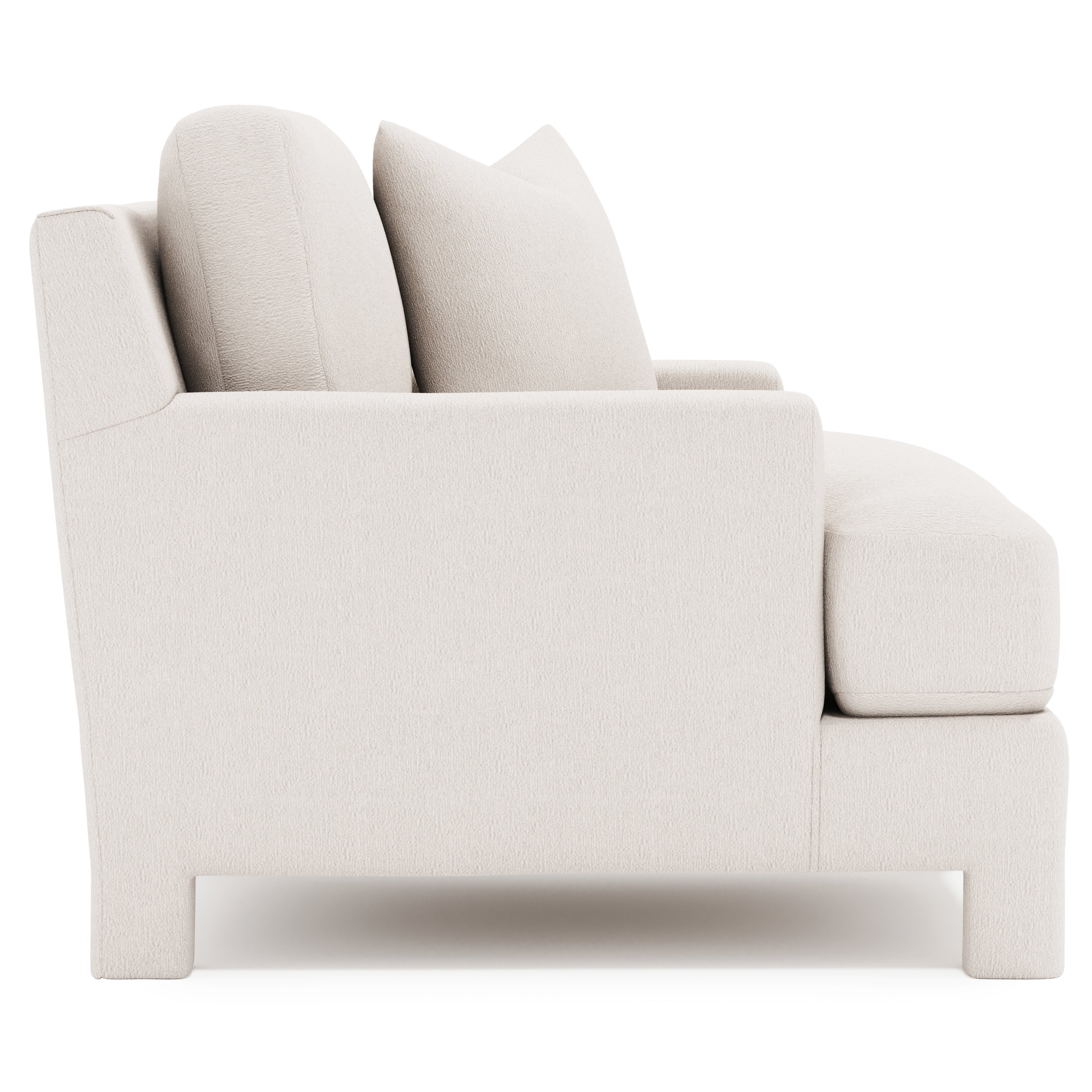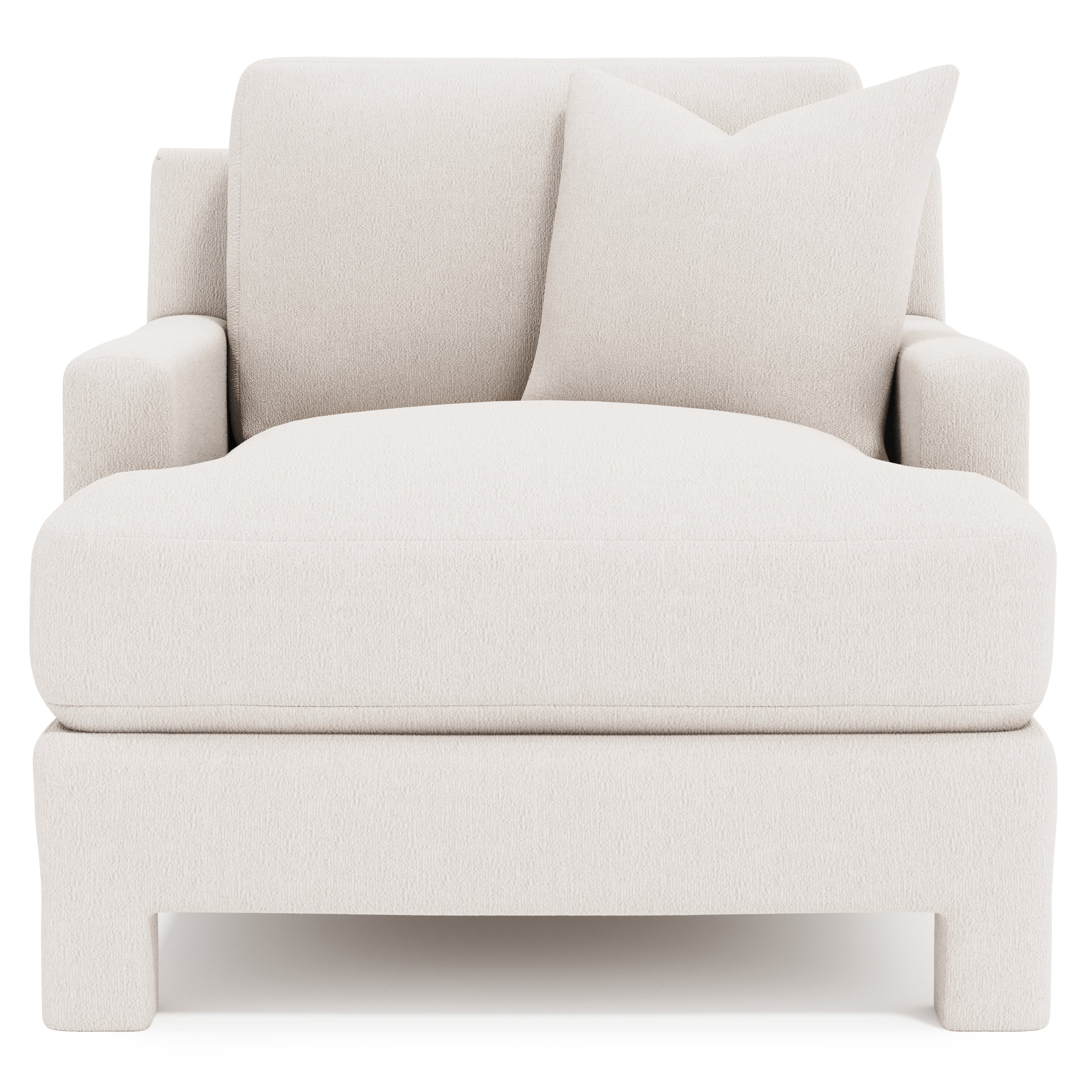Fully upholstered from top to bottom, the Mily chair brings a soft touch to the luxe living space. The modern design features a low-profile back and recessed track arms. Sumptuous feather down cushioning offers luxurious comfort, while the combination of natural fabric and relaxed tailoring presents a serene, sophisticated look.