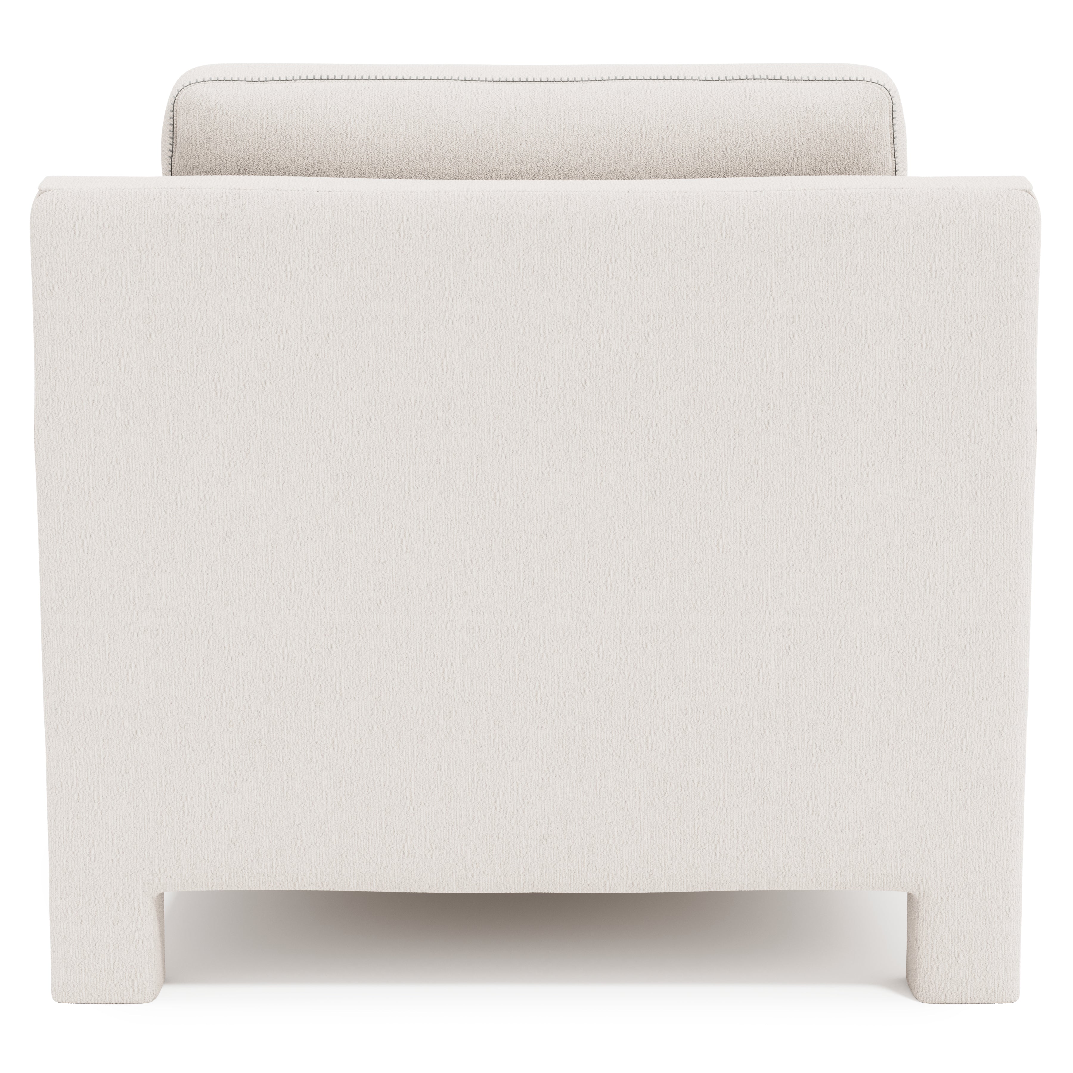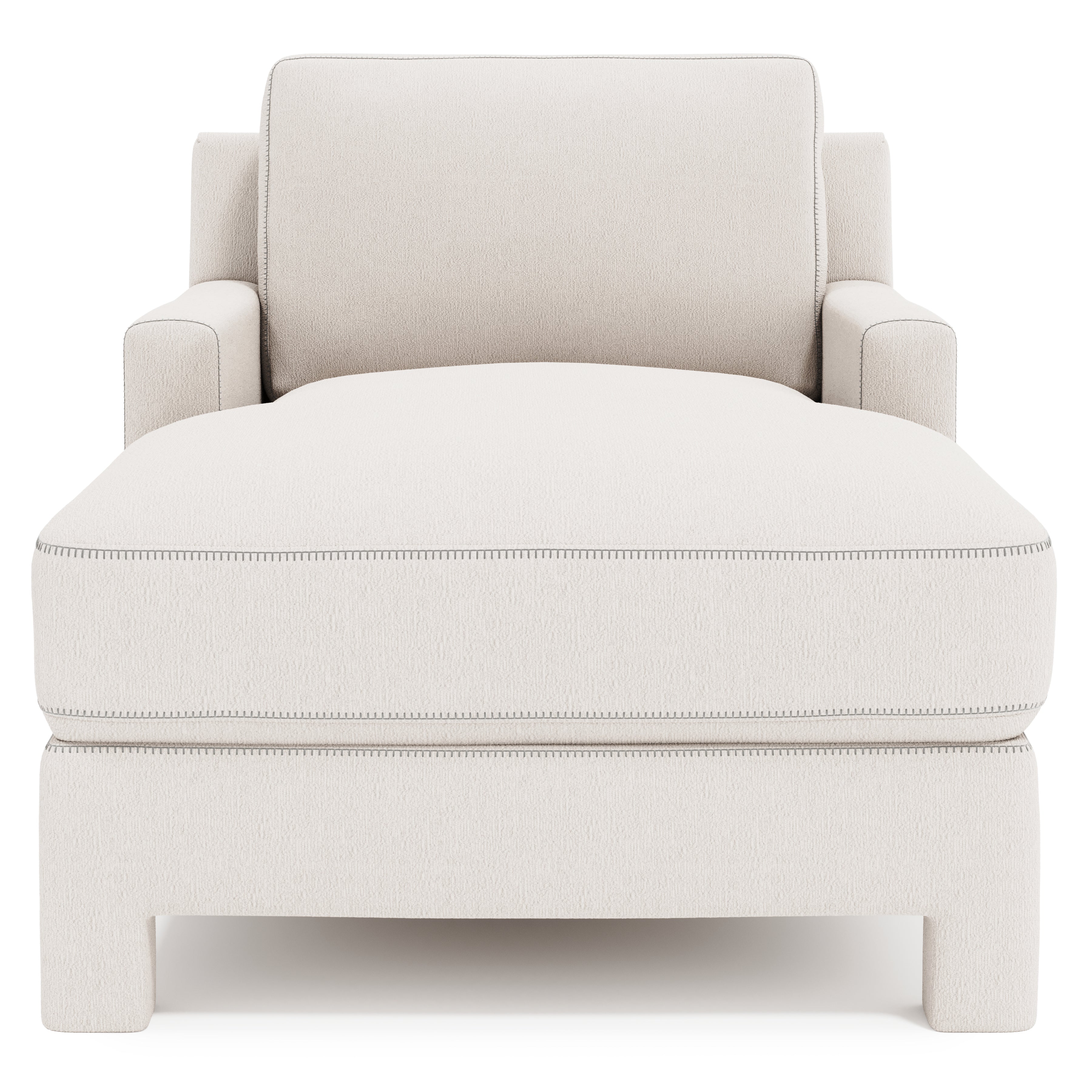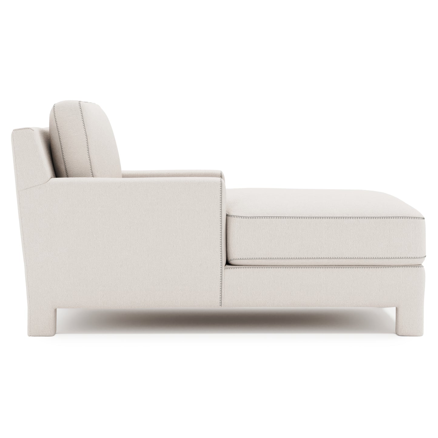 Fully upholstered from top to bottom, the Mily chaise brings a soft touch to the luxe living space. The modern design features a low-profile back and recessed track arms. Sumptuous feather down cushioning offers luxurious comfort, while the combination of natural fabric and relaxed tailoring presents a serene, sophisticated look. Special contrast stitching adds a unique design detail to this welcoming piece.