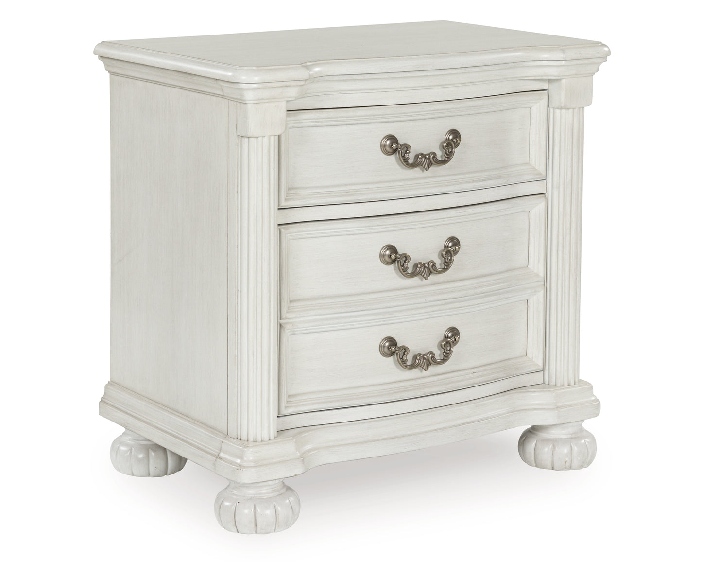 Transform your inner sanctum into a haven of timeless elegance and functionality. This traditionally styled nightstand is adorned in a classic antiqued white finish, highlighted by a serpentine-shaped front with thick decorative moulding. Its drawers are packed with ample storage possibilities, and a hidden pull-out tray behind the bottom drawer puts your small valuables out of sight. And did we mention the stylish reeded bun feet? Talk about relaxed refinement.
