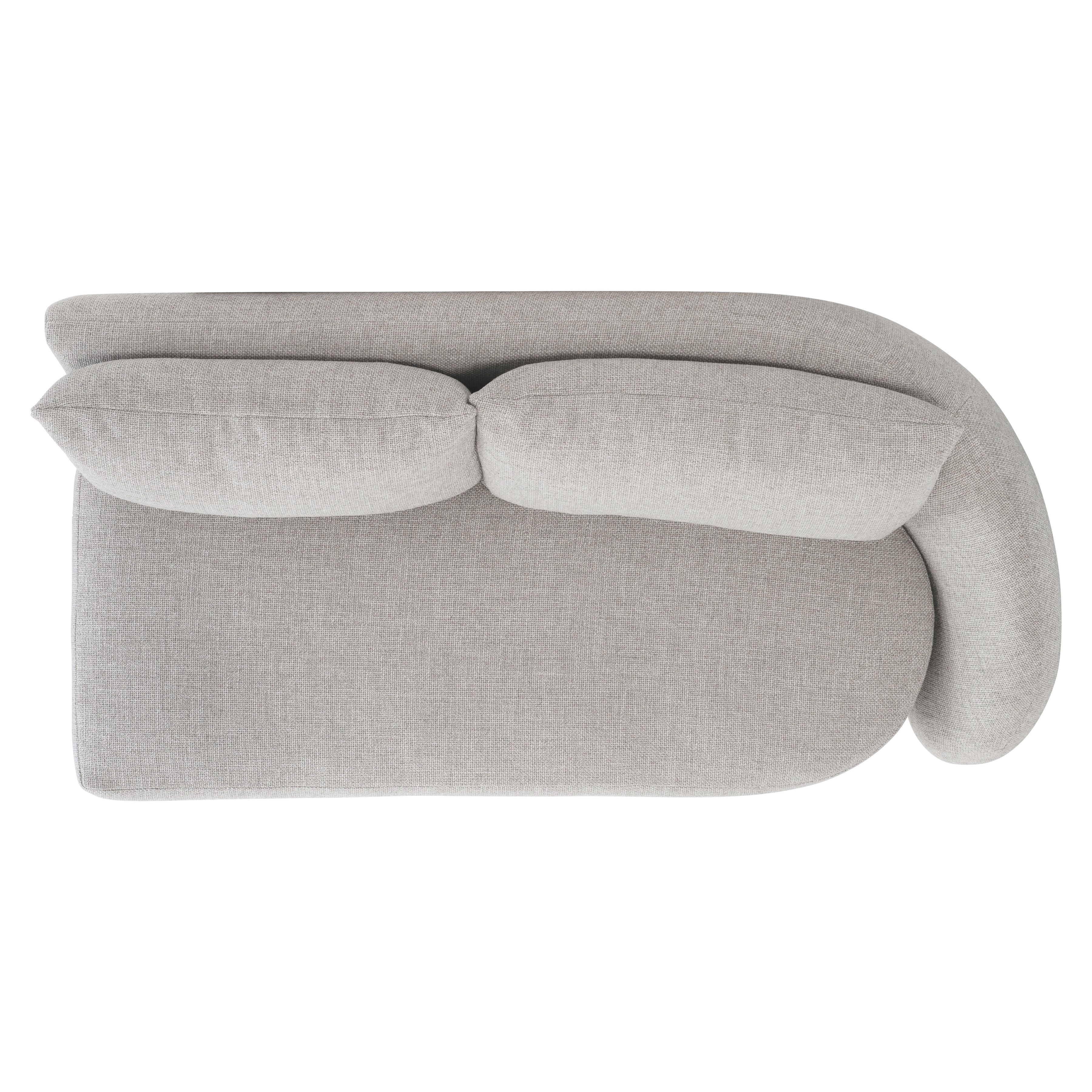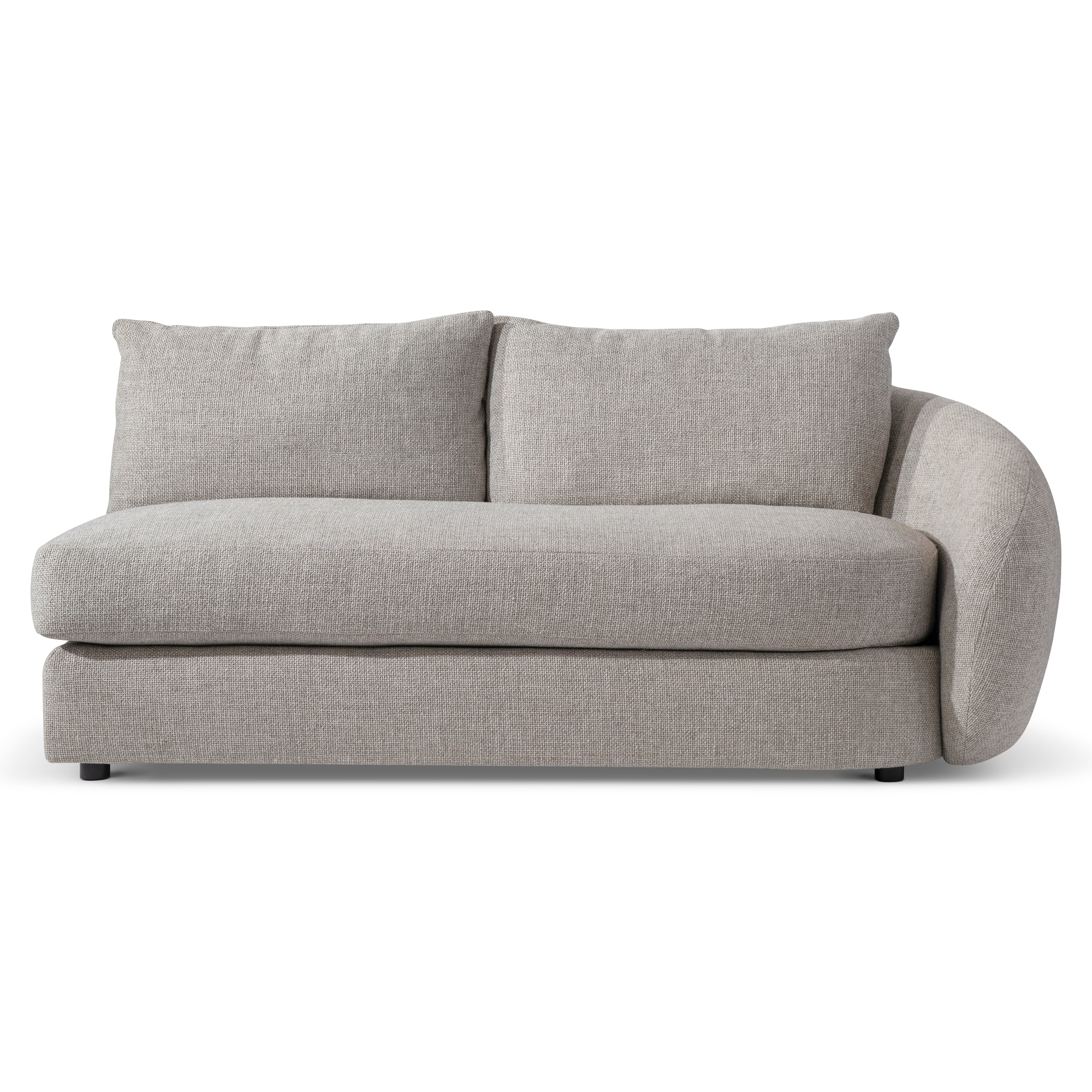 A generous silhouette defines the comfort statement of the Moretti right arm loveseat. The back curves to form an embracing arm and plush profile. A deep seat cushion, lush back pillows and two throw pillows craft a luxe style. This loveseat can be used alone or as part of the Moretti sectional.