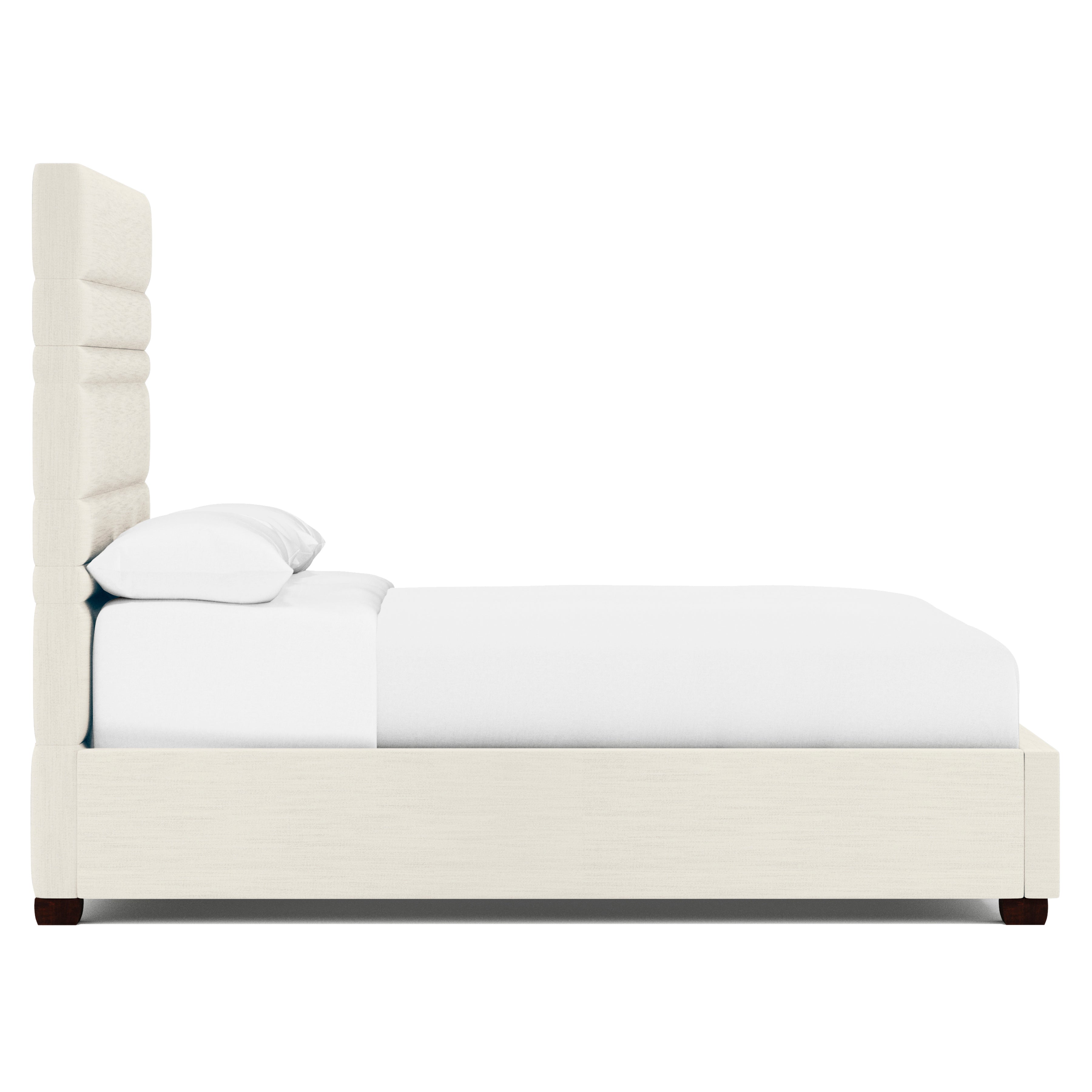 The Murray panel bed has a distinctive headboard that showcases horizontal channels in varying widths. The design offers both style and comfort, which also extends to the fully upholstered frame. Exposed wood feet in Smoke or Espresso finishes