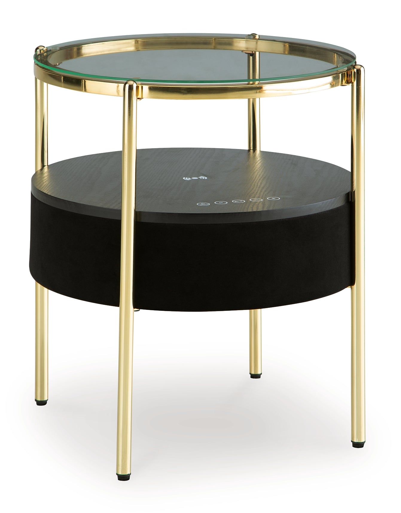 Discover the perfect combination of contemporary style and space-saving functionality. This accent table is designed with an integrated speaker (complete with wireless charging and touch-button controls), allowing you to effortlessly stream your favorite tunes wirelessly. Its sleek glass top perfectly complements the modern black fabric on the sides. This table is gonna be music to your ears.