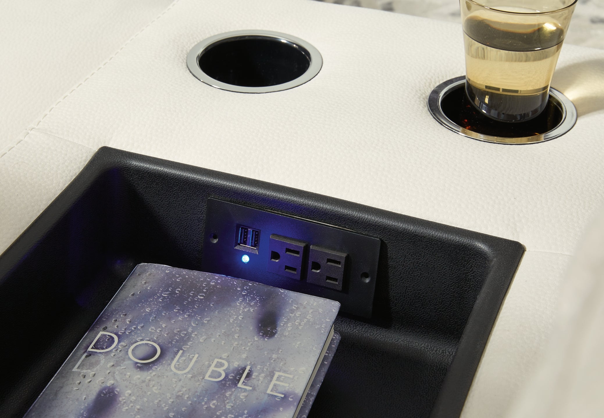 Modern comfort never looked so good. Sporting sloped track arms, wide, generous cushions and bustle-back stitching for high-fashion flair, this power sectional is the ultimate choice in comfortably cool, contemporary style. Indulging with a suede-like faux leather that emulates nubuck leather, the sectional’s family- and pet-friendly upholstery is the stuff dreams are made of. Factor in the added perks of an Easy View™ power adjustable headrest and USB charging, and you’ve got a power reclining sectional that truly caters with style, comfort and convenience.