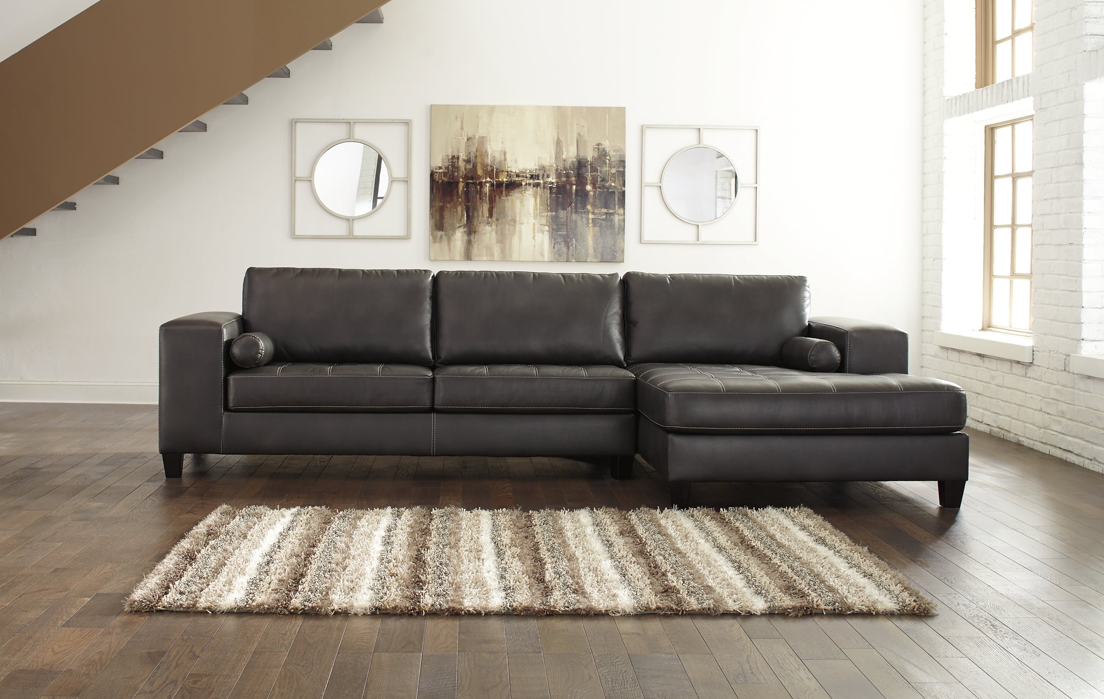 The word "plain" is not in this sectional's vocabulary. Low back seating and wide track arms make it ultra cool. Just enough soft padding in all the right places makes it handsome and sleek. Charcoal color faux leather with an embossed natural grain effect and matte finish is inspired by contemporary euro leather. Light gray stitching adds contrast, and tufting on the seats puts this set in a league of its own.