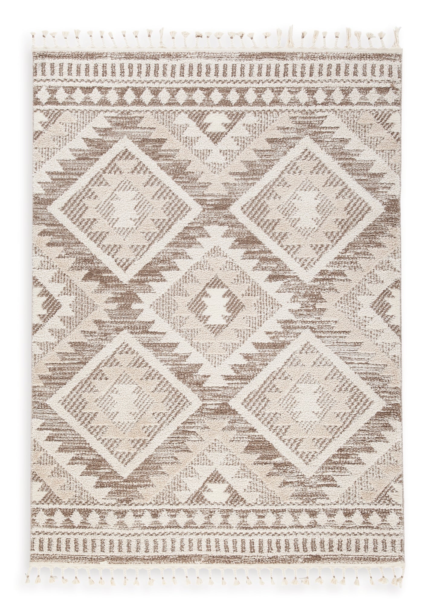 Today’s casual, carefree aesthetics are reflected in this rug. For those with an inclination for neutral hues and an easy-breezy vibe, the diamond design and tasseled edge offer a conventional take on modern boho. This rug harmonizes well with natural greenery, simple architectural forms and inviting accents.