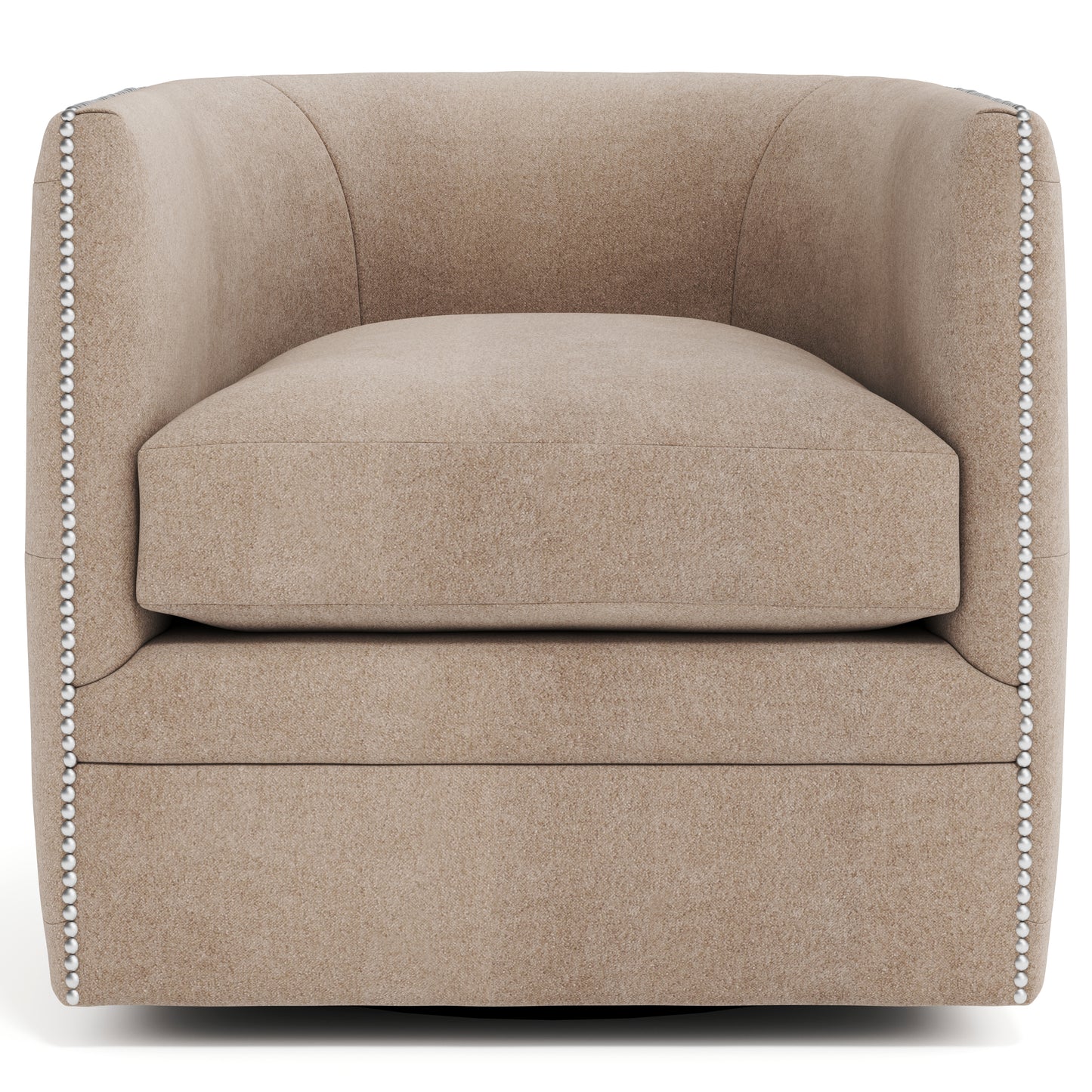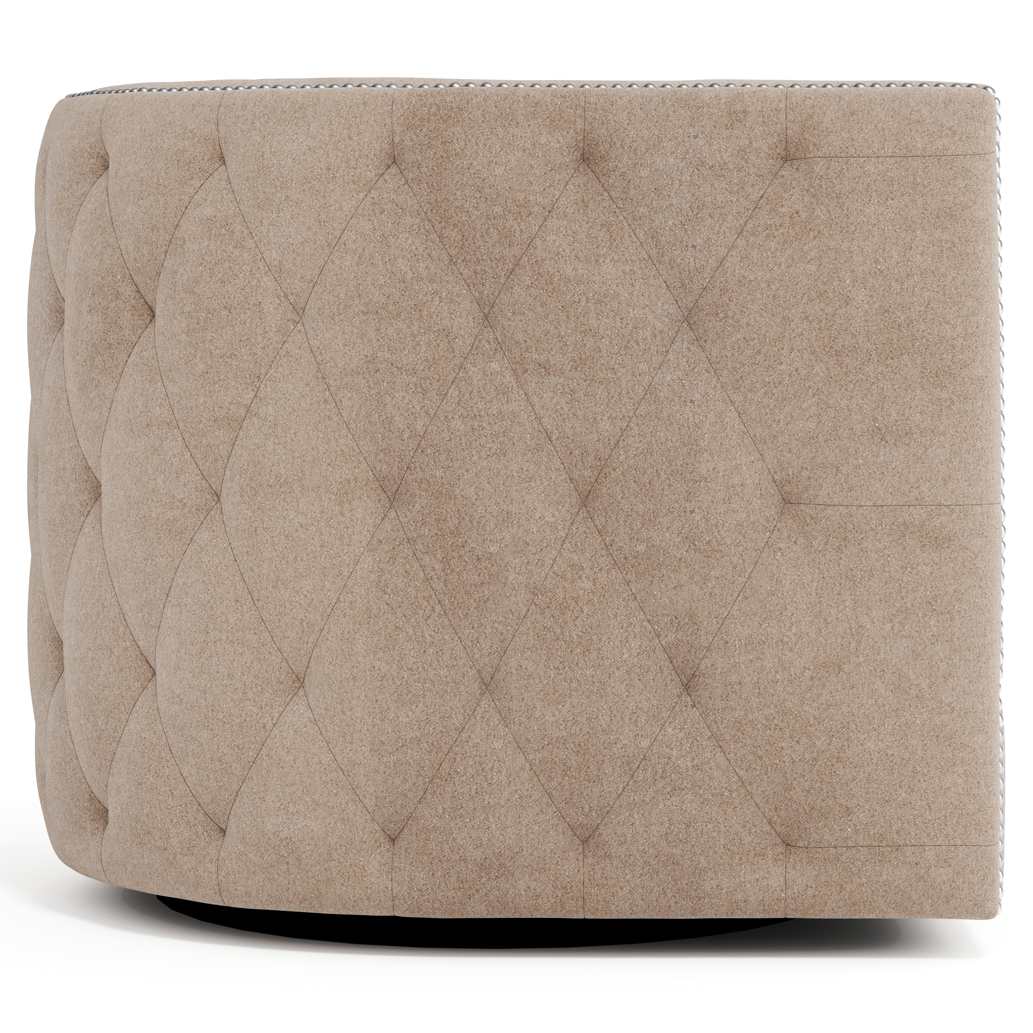 Featuring a barrel back and track arms, the Palazzo swivel chair puts a modern spin on a traditional form, delivering an eclectic feel. Button tufting and nailhead trim create a sophisticated look. The curved shape provides luxurious support and softens the flow of a room.
