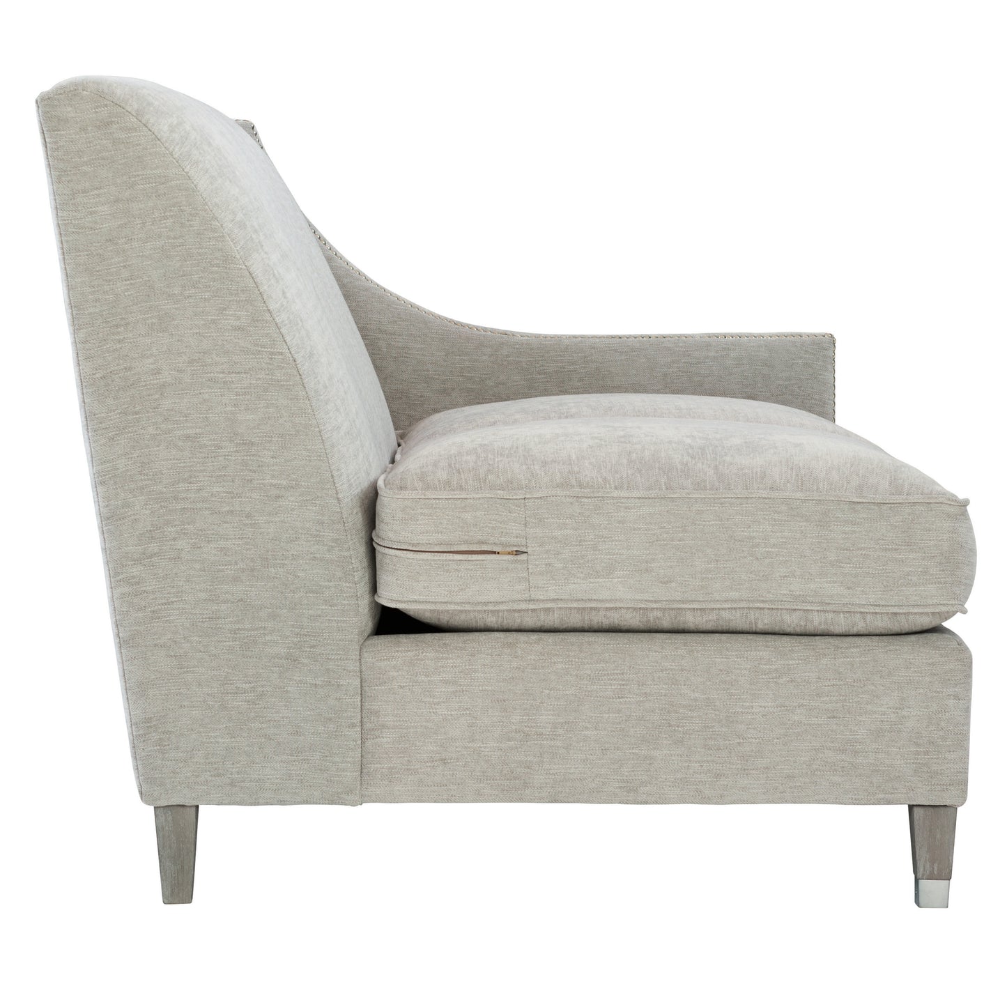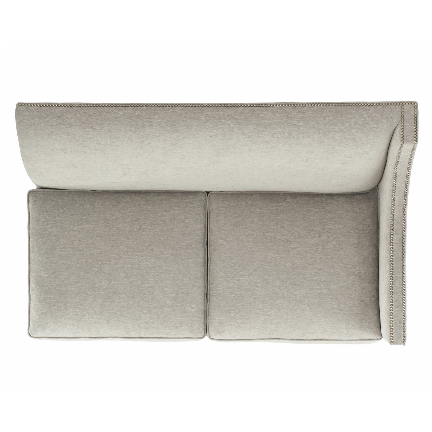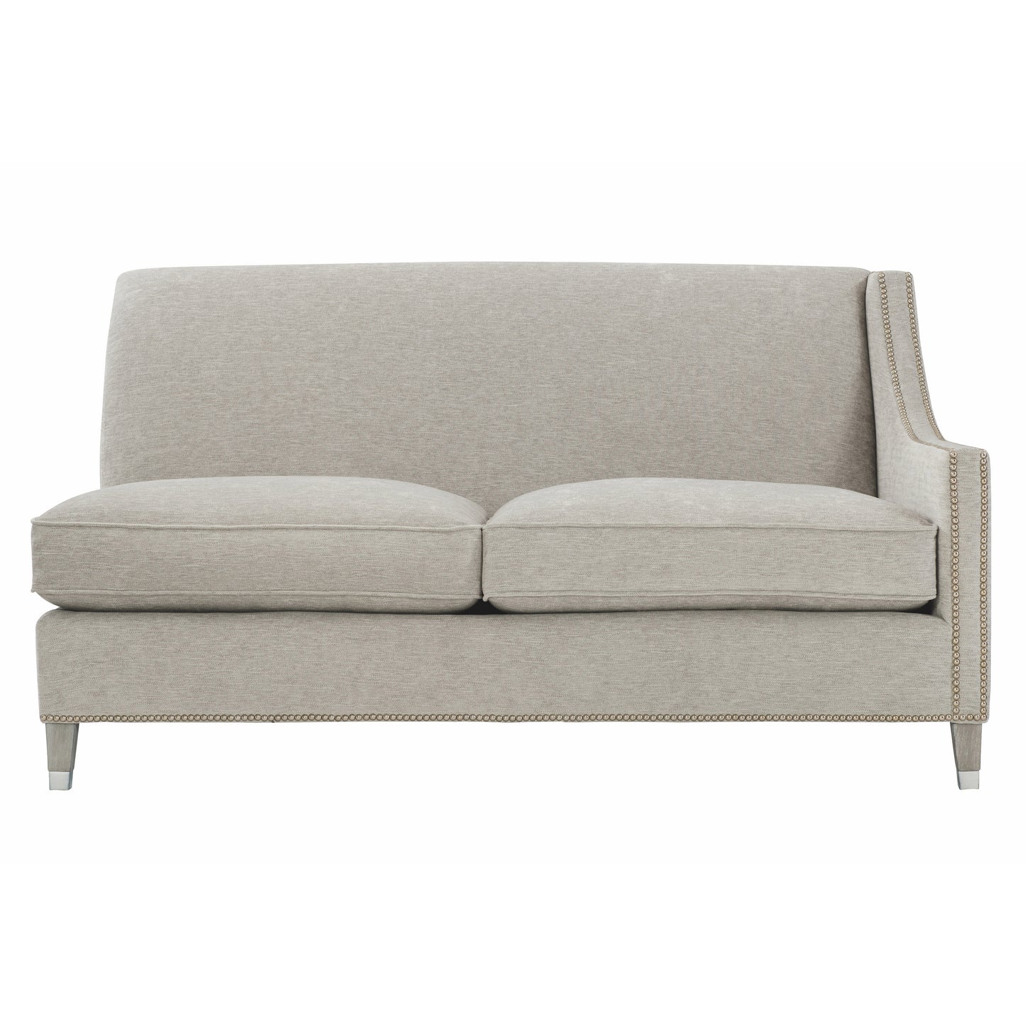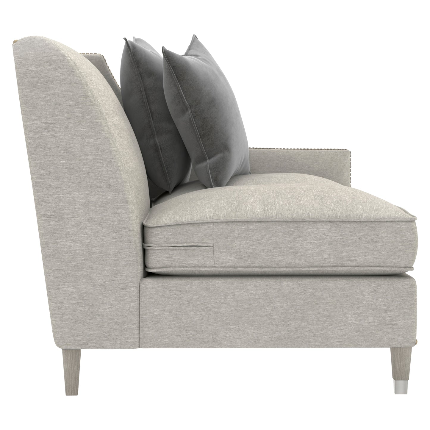 The Palisades right arm loveseat exhibits fine craftsmanship and a distinctly modern styling. An elegant sloped arm, welt trim and sleek tapered legs add to the sophisticated appeal of this piece, while nailhead trim accentuates the graceful curves and clean lines. Tapered legs capped in metal ferrules provide a chic finishing touch.