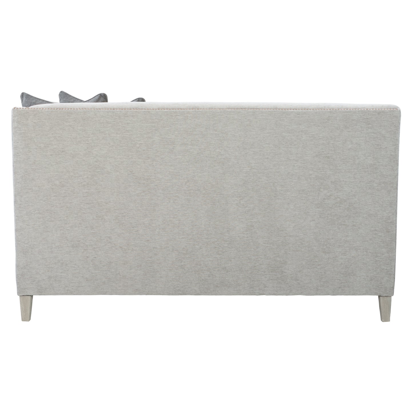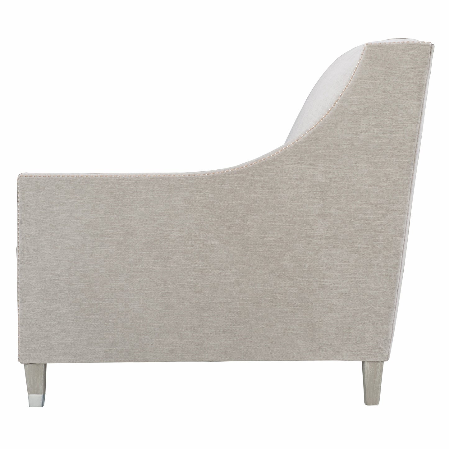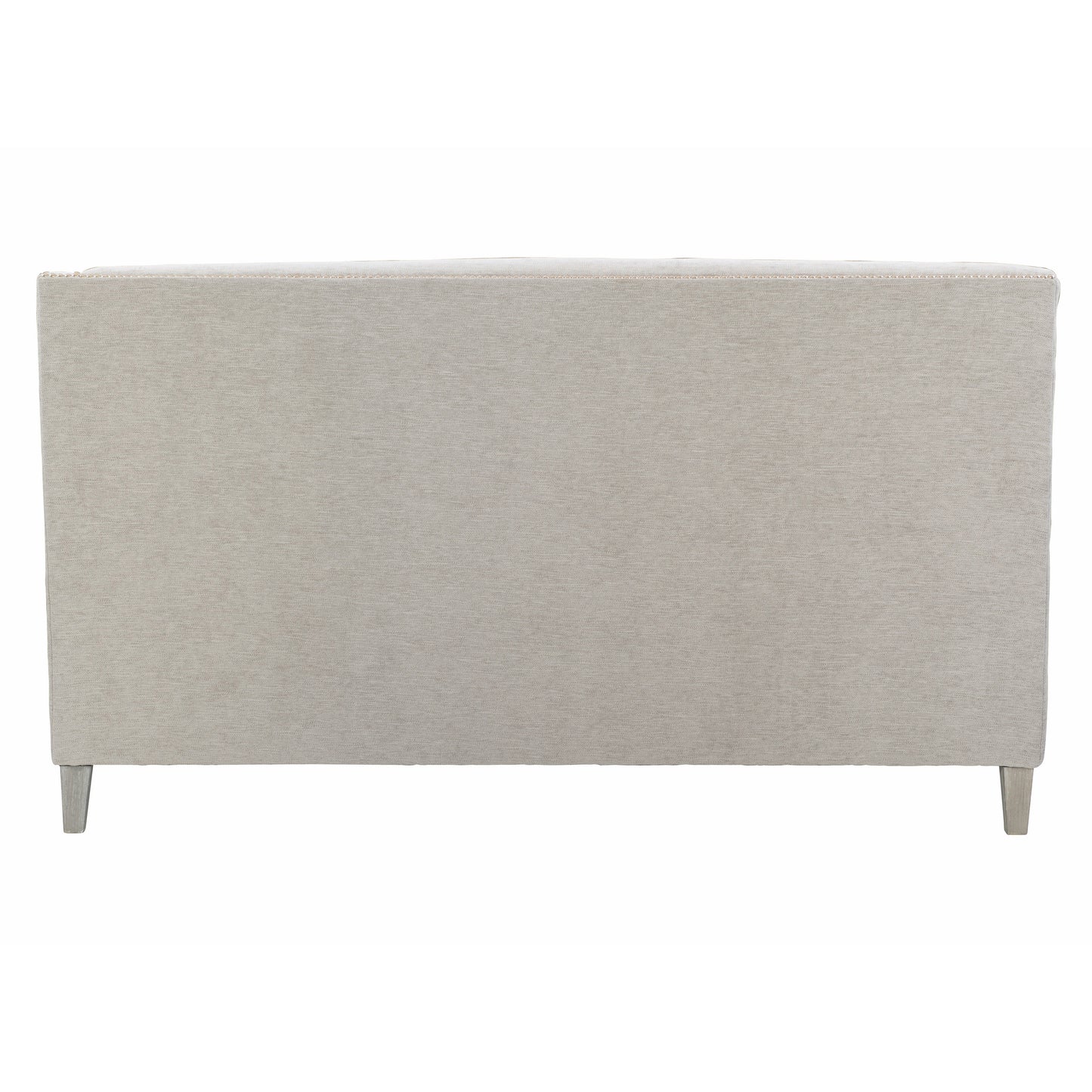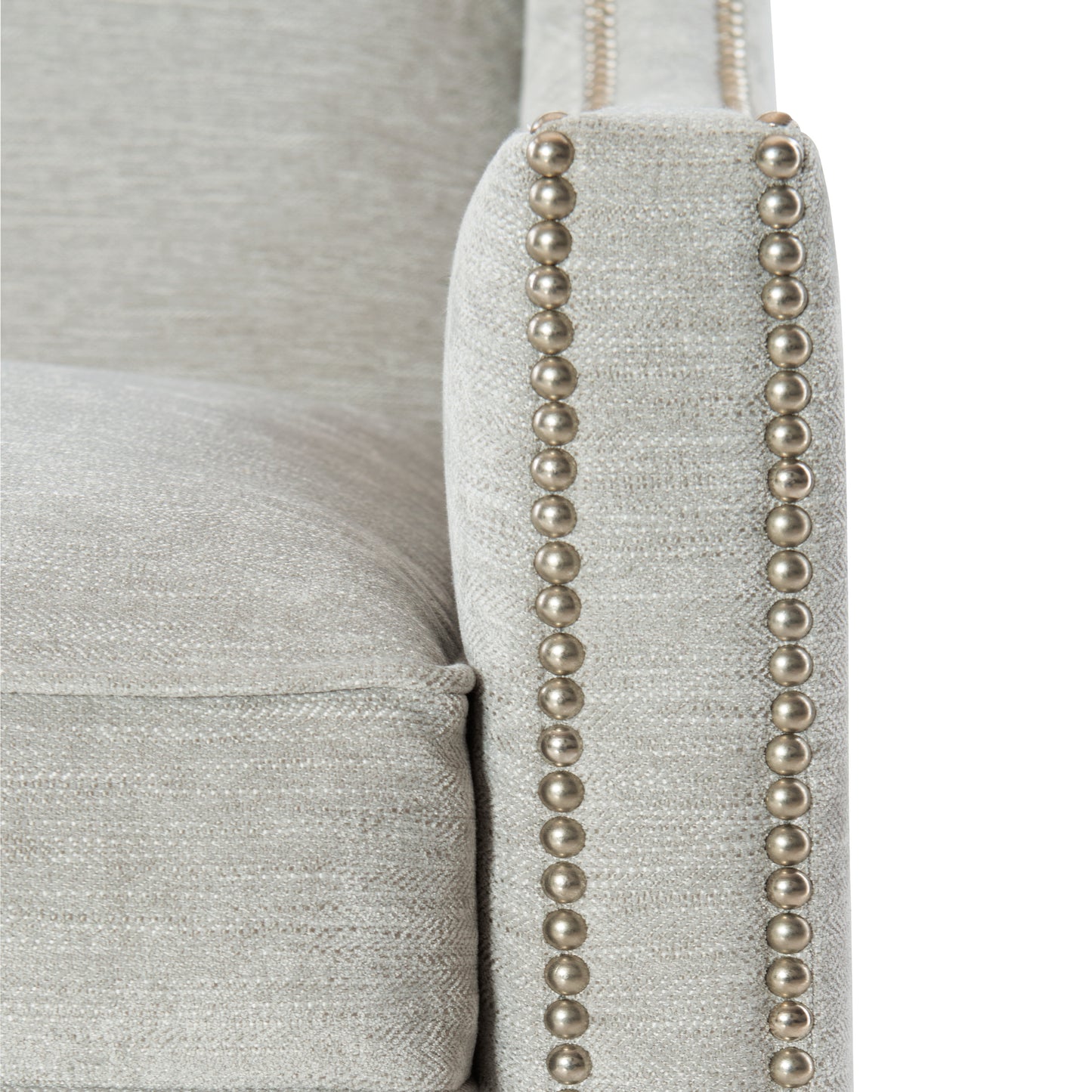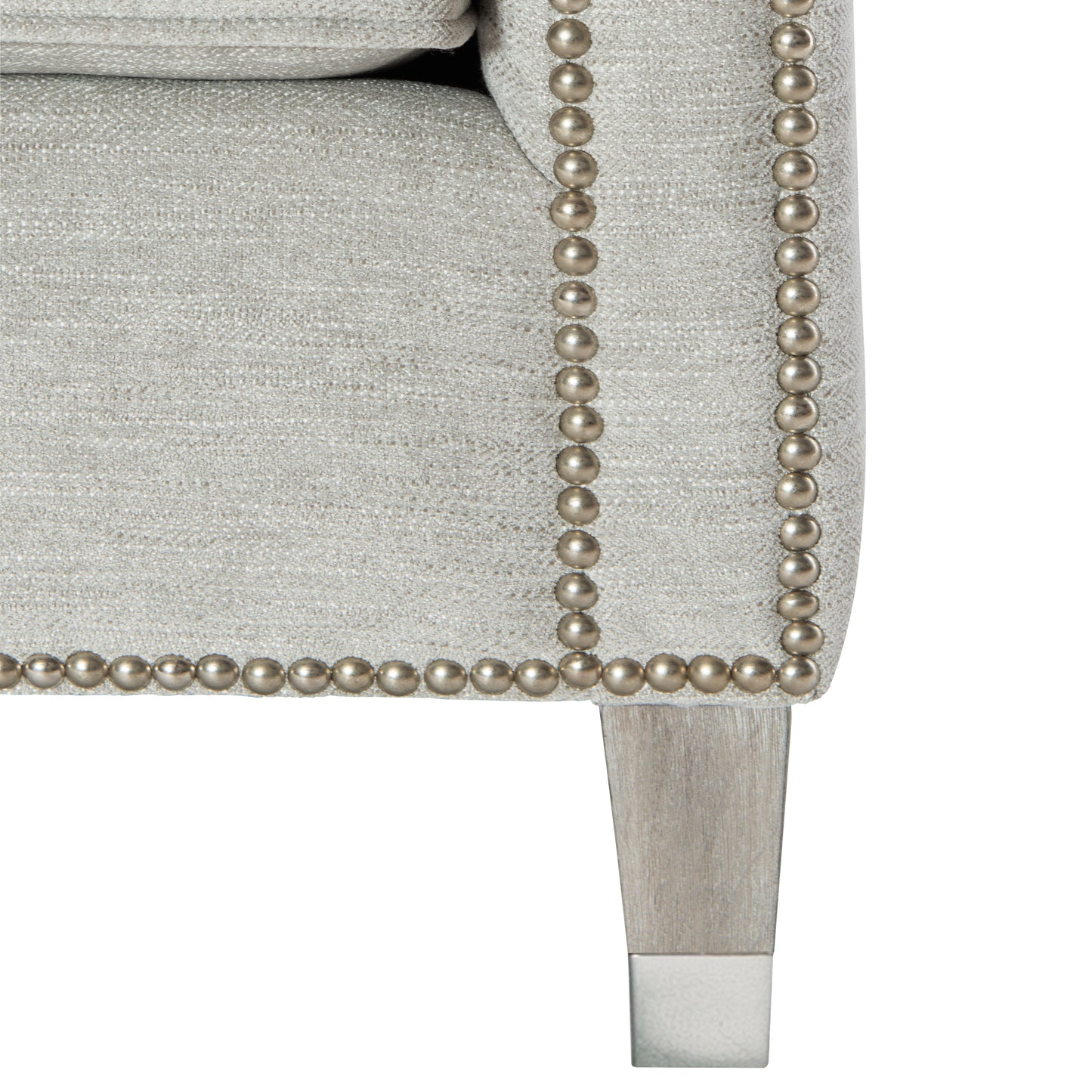 The Palisades right arm loveseat exhibits fine craftsmanship and a distinctly modern styling. An elegant sloped arm, welt trim and sleek tapered legs add to the sophisticated appeal of this piece, while nailhead trim accentuates the graceful curves and clean lines. Tapered legs capped in metal ferrules provide a chic finishing touch.