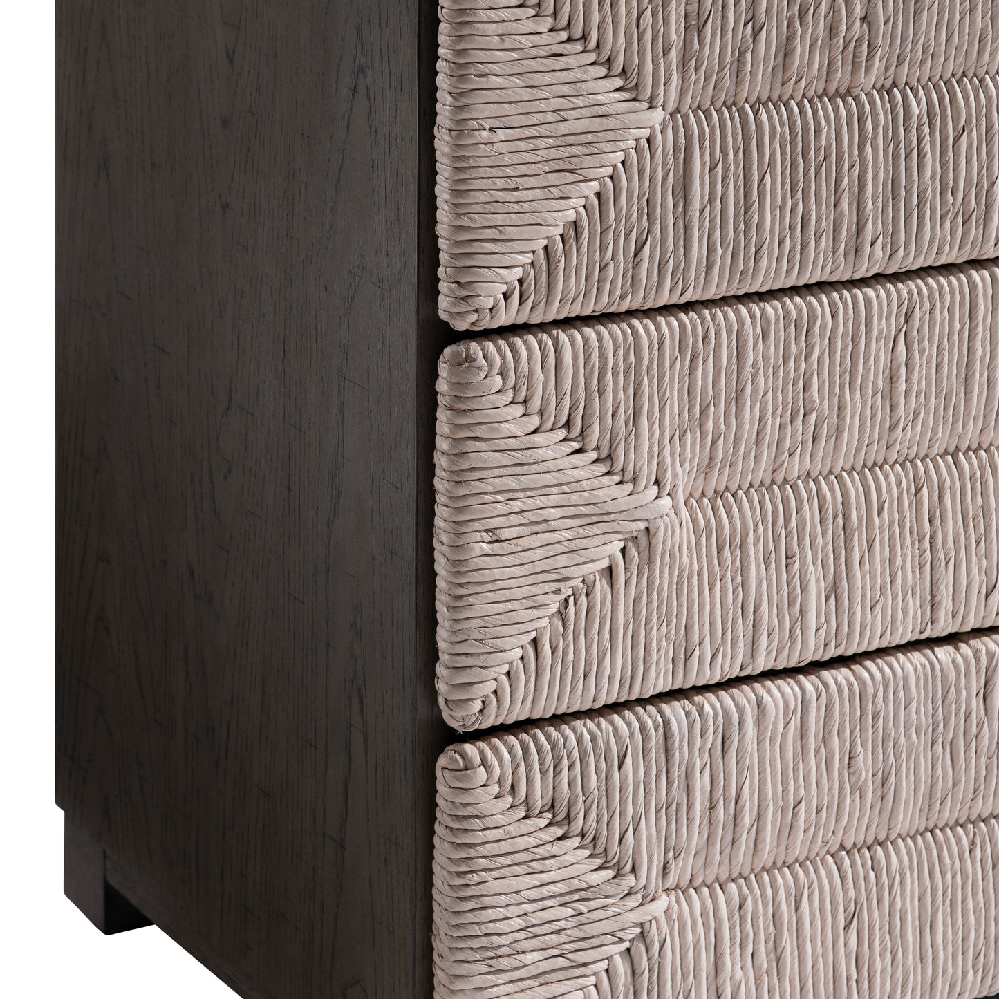 The Palma nightstand has three push-to-open drawers wrapped in woven abaca. The textural look creates a gorgeous organic style that complements the Rustic Grey finish on the wood case. Modern tech is also included with a two-port USB charging unit on the back.