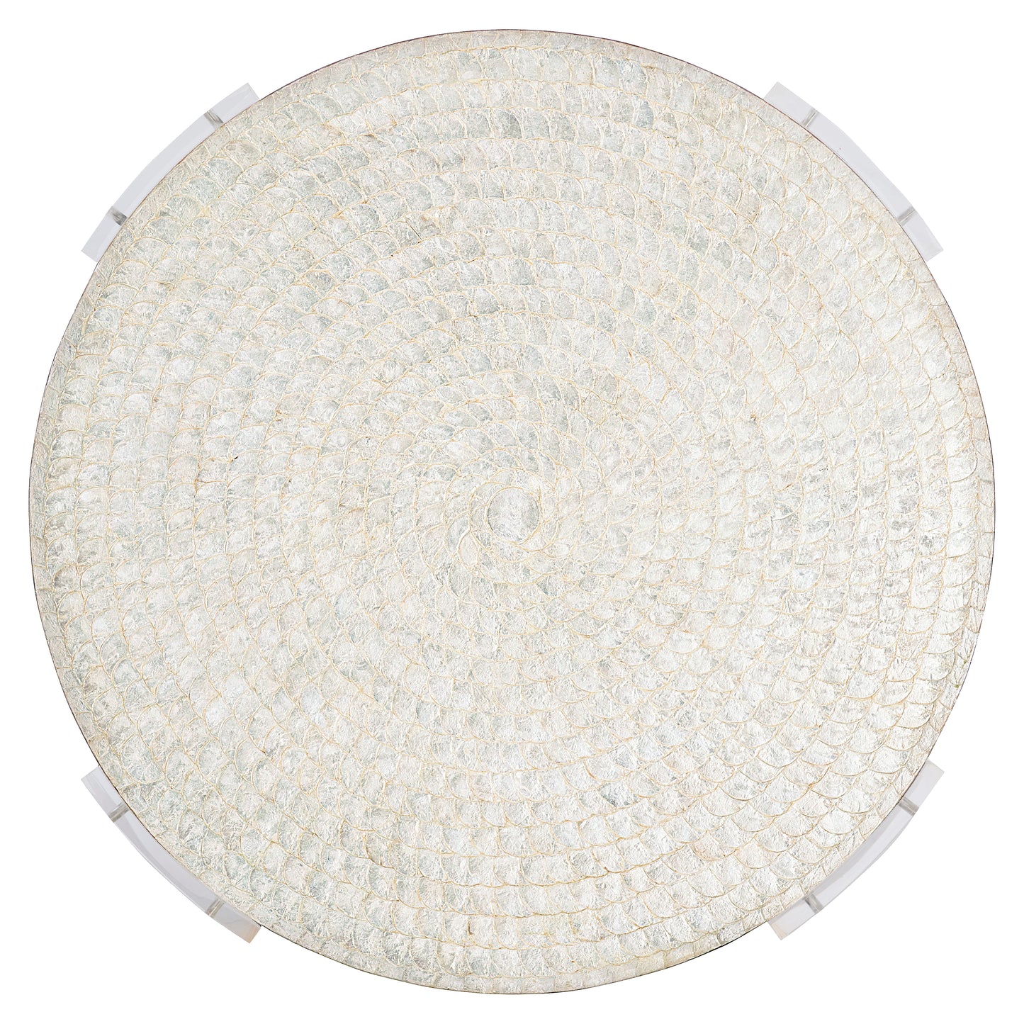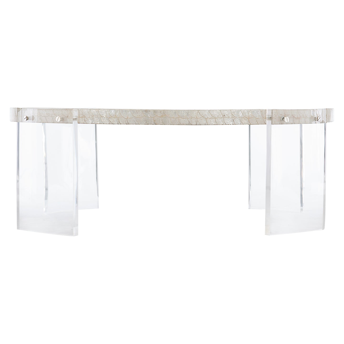 The Pearle cocktail table offers a unique material story, blending capiz shell with acrylic for a singular look. The luminescence of the shells lends a glamorous mystique, while clear leg panels with bright metal hardware bring a sleek, contemporary edge. Casual elegance and modern style meet in this breathtaking piece.