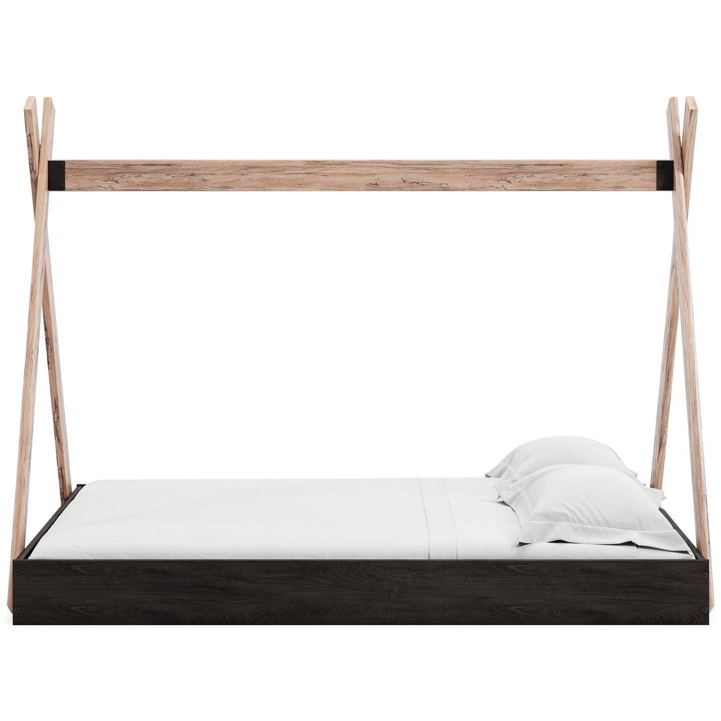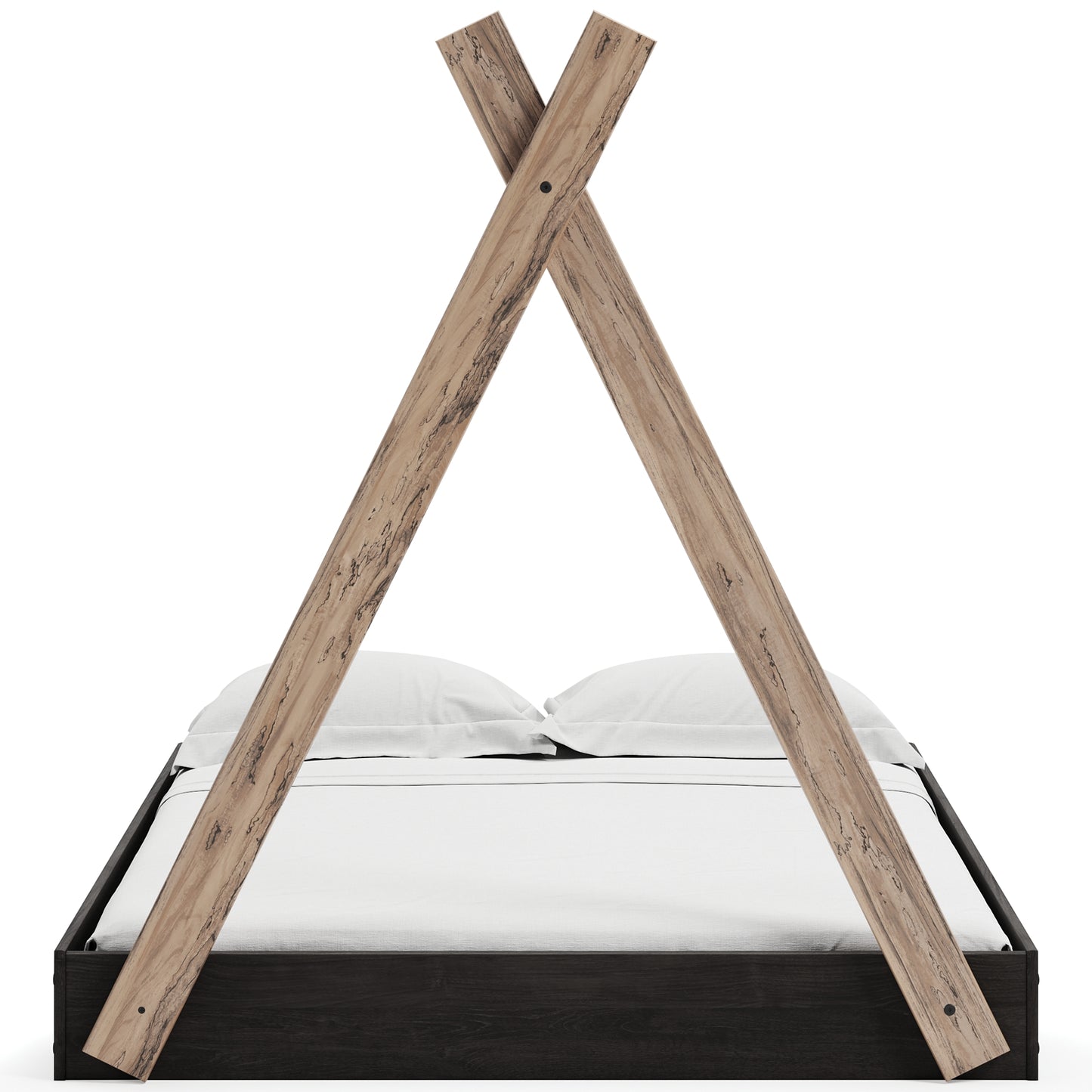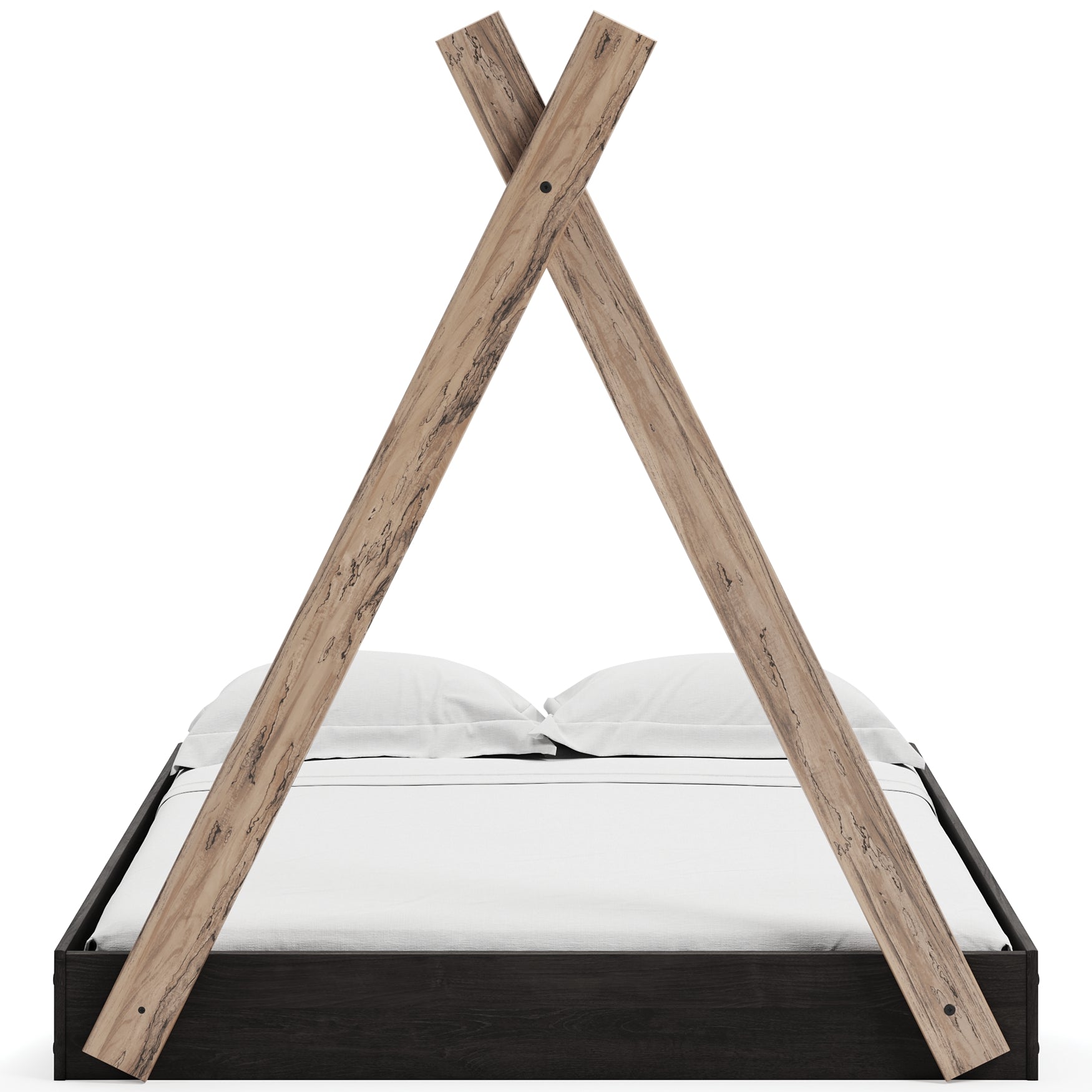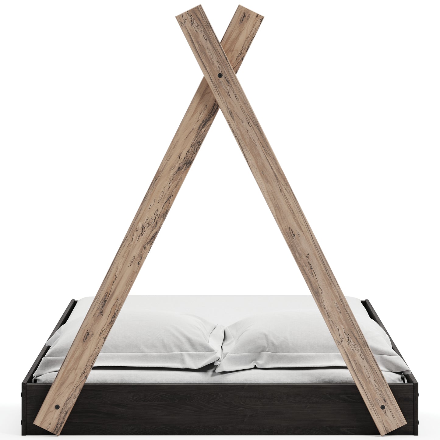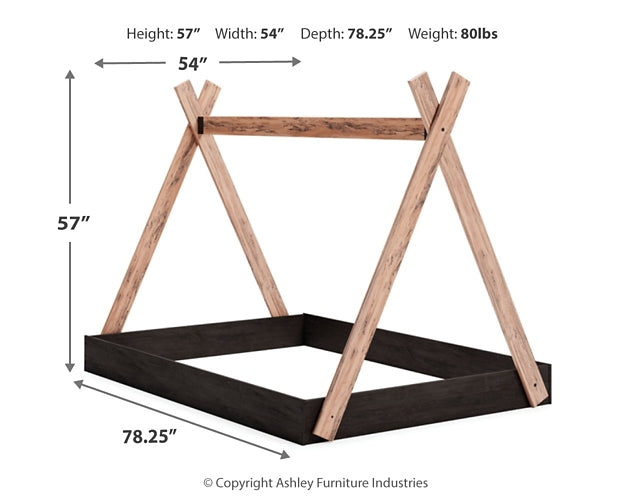 Adventure awaits with this full tent complete bed in a box. An effortless blend of contemporary and casual style, it features an expressive two-tone look, with a dark charcoal finish over replicated oak grain with an authentic touch and a replicated sugarberry wood grain. This complete bed in a box requires no additional foundation, making it a functional yet unique addition to your home.